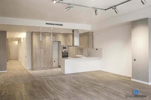 Com es pot apreciar en el següent vídeo, vam aplicar un estil en el qual predominen les tonalitats neutres, amb l’objectiu d’aconseguir estances àmplies i lluminoses. A més, això es combina amb acabats que encaixen a la perfecció com parets de maó vist i els paviments instal·lats: hidràulic a la cuina i de parquet a la resta de l’habitatge.