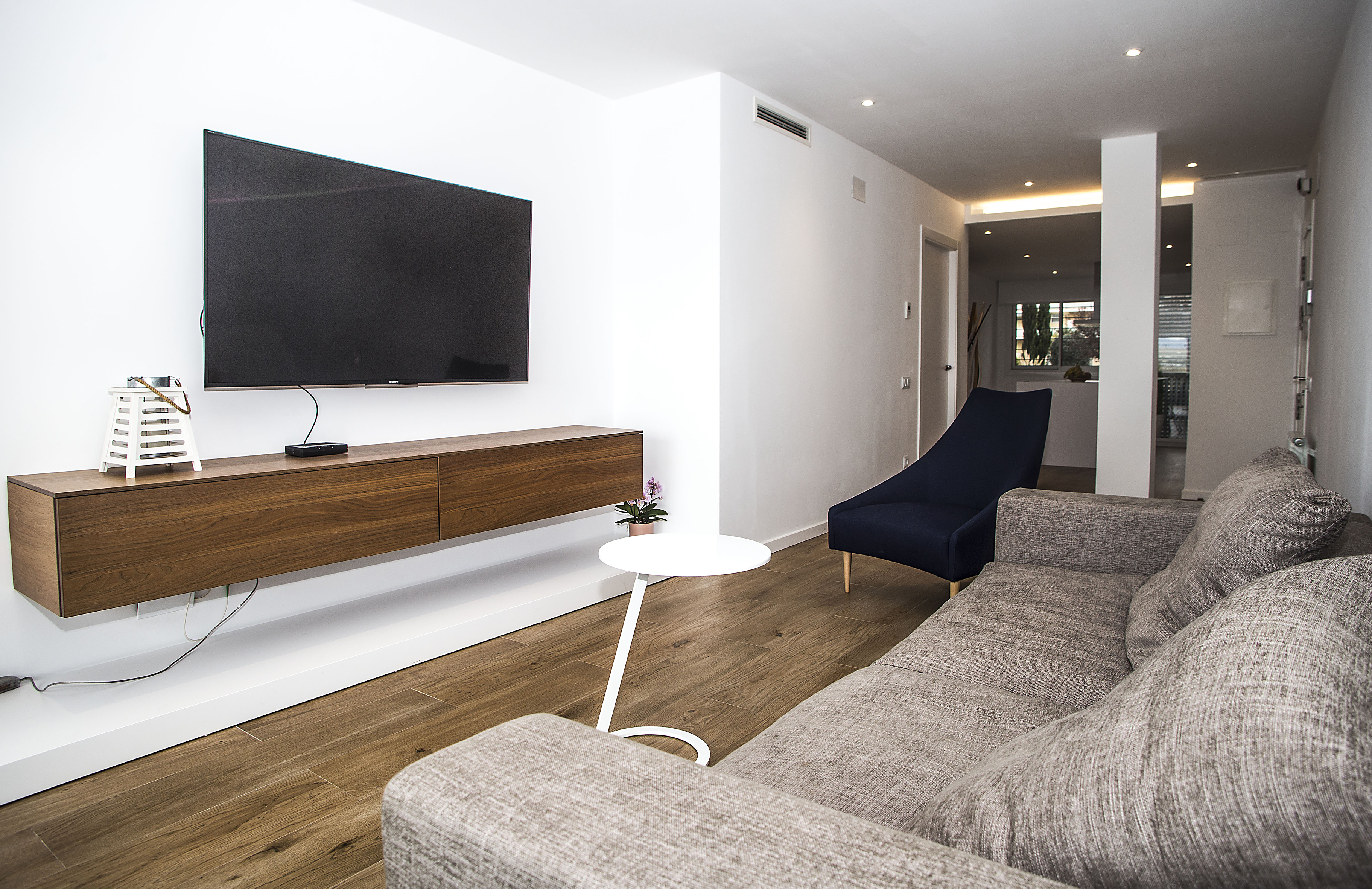 A més de millorar amb escreix el disseny interior de tot l’habitatge, també ens encarreguem de moblar diverses de les seves estances. El saló compta amb un sofà de diverses places i una butaca, a més d’un moble per a l’emmagatzematge d’un disseny molt subtil i una televisió, que es va ancorar a la paret. Per la seva banda, els dormitoris es van moblar amb les seves respectives llits. En aquest aspecte, destaca el dormitori suite, en què les parets de la cambra de bany són de vidre.