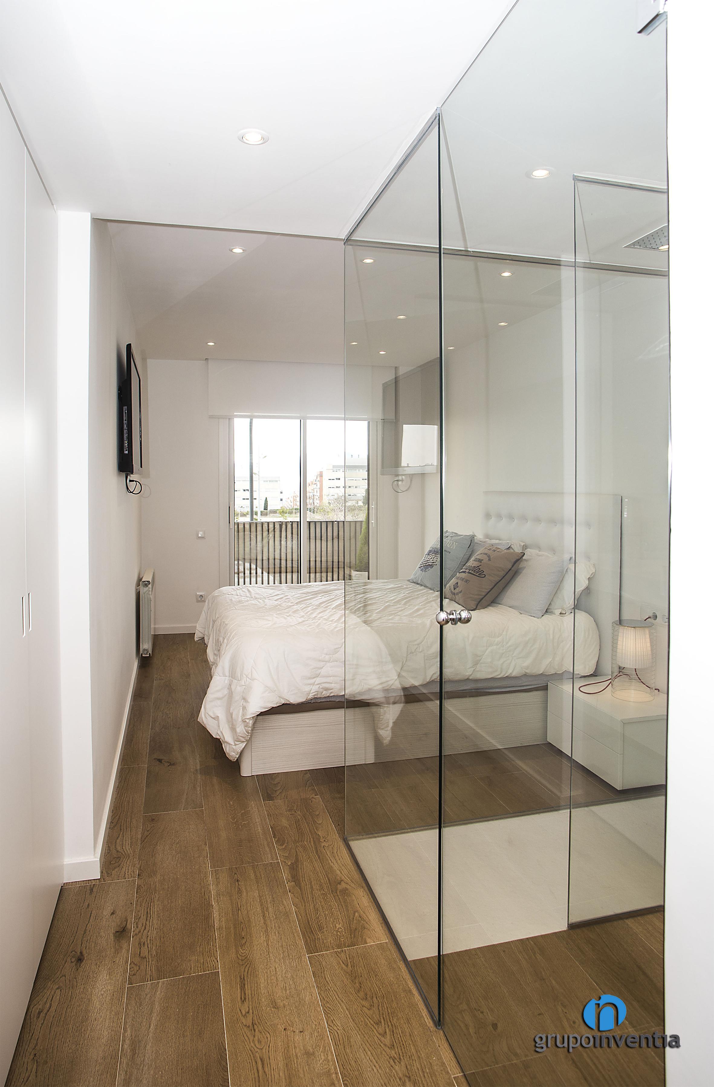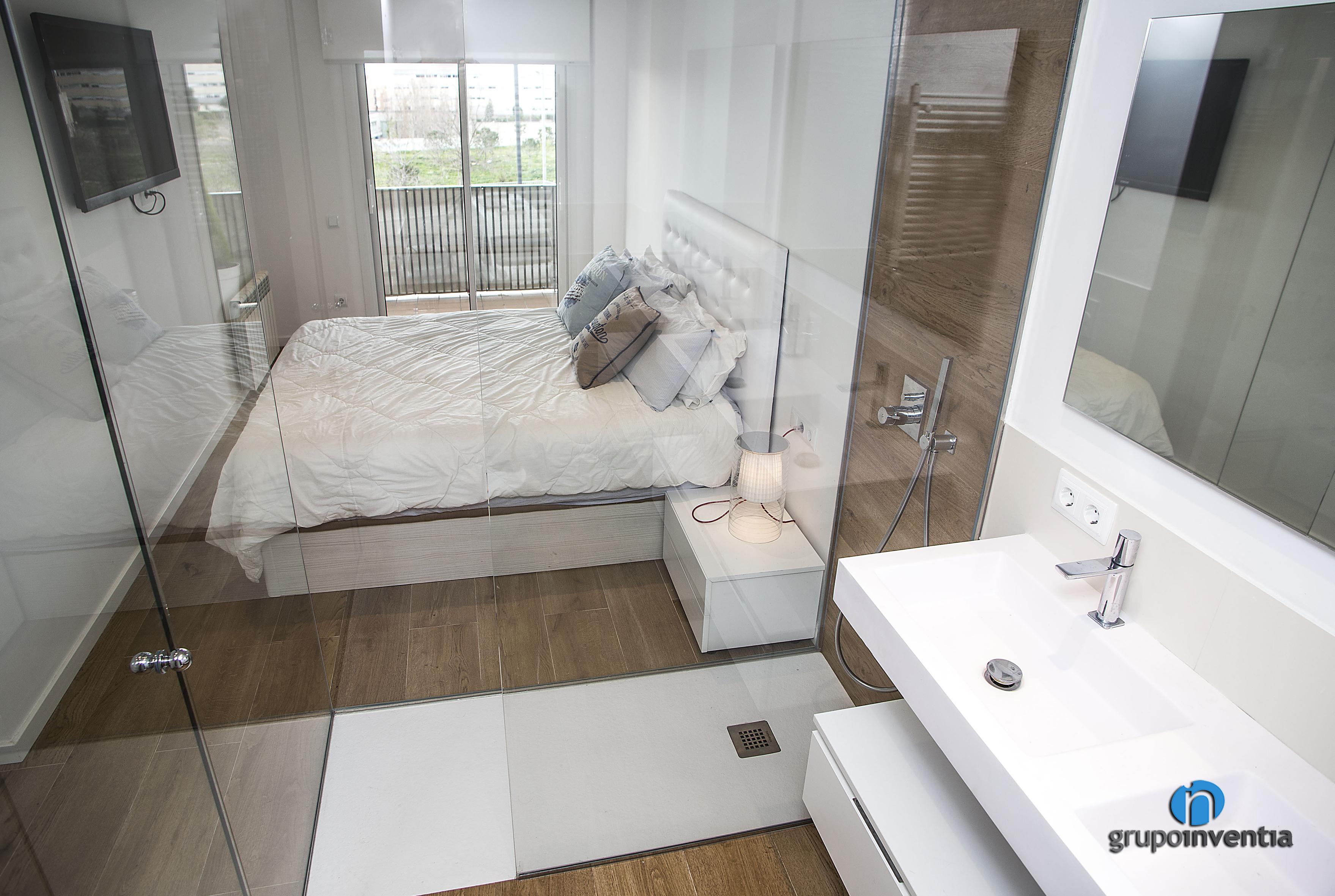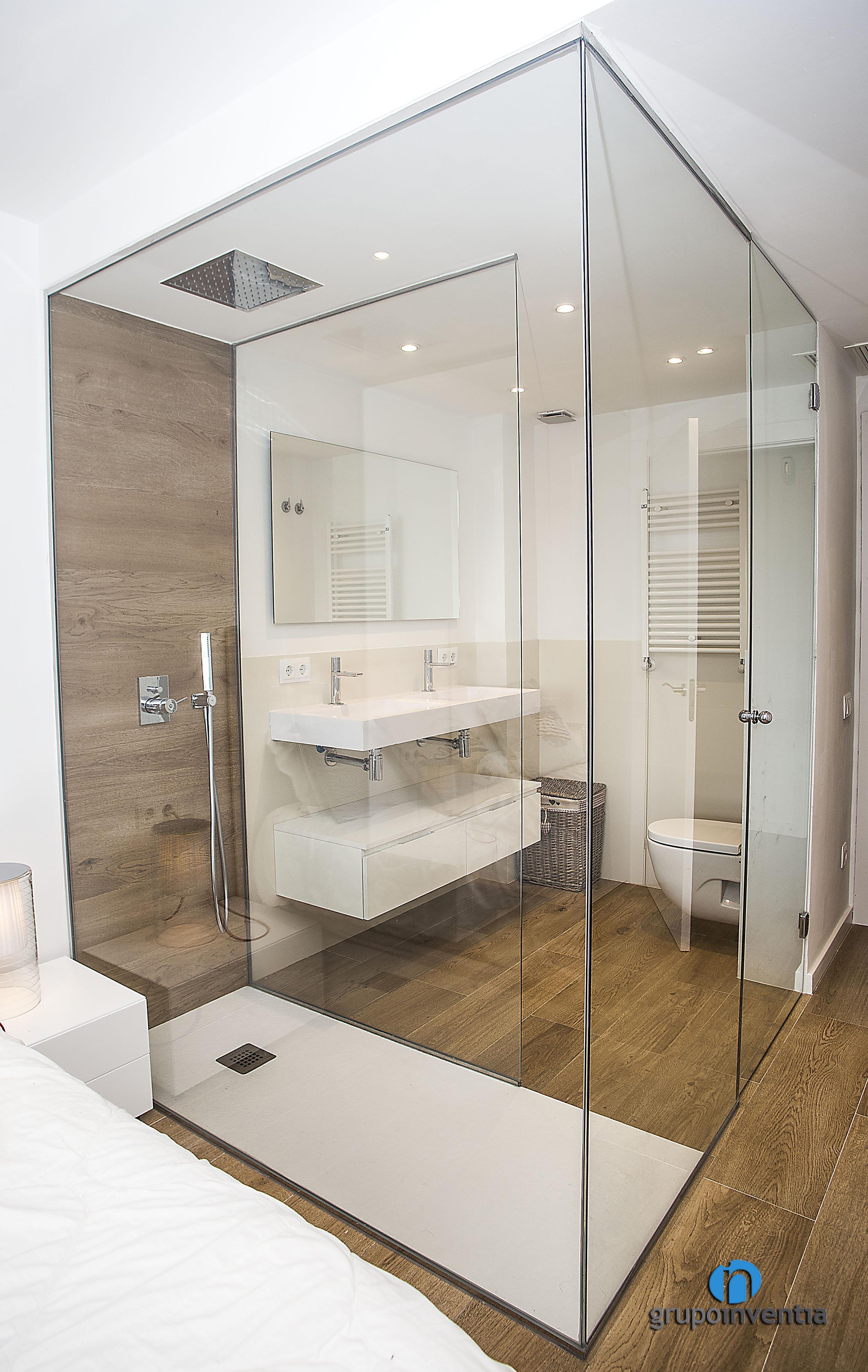 El dormitori principal d’aquest habitatge compta amb un bany propi equipat amb un ampli lavabo, un inodor suspès i una dutxa arran de terra. Per al seu disseny es van combinar tonalitats neutres en l’enrajolat i pintura de les parets amb un paviment de ceràmica que imita el parquet. El més destacat d’aquesta reforma de bany suite són les parets que el separen de l’estança, ja que aquestes són de vidre, una cosa que amplia l’espai visual del dormitori i permet que la llum natural flueixi amb total llibertat.
