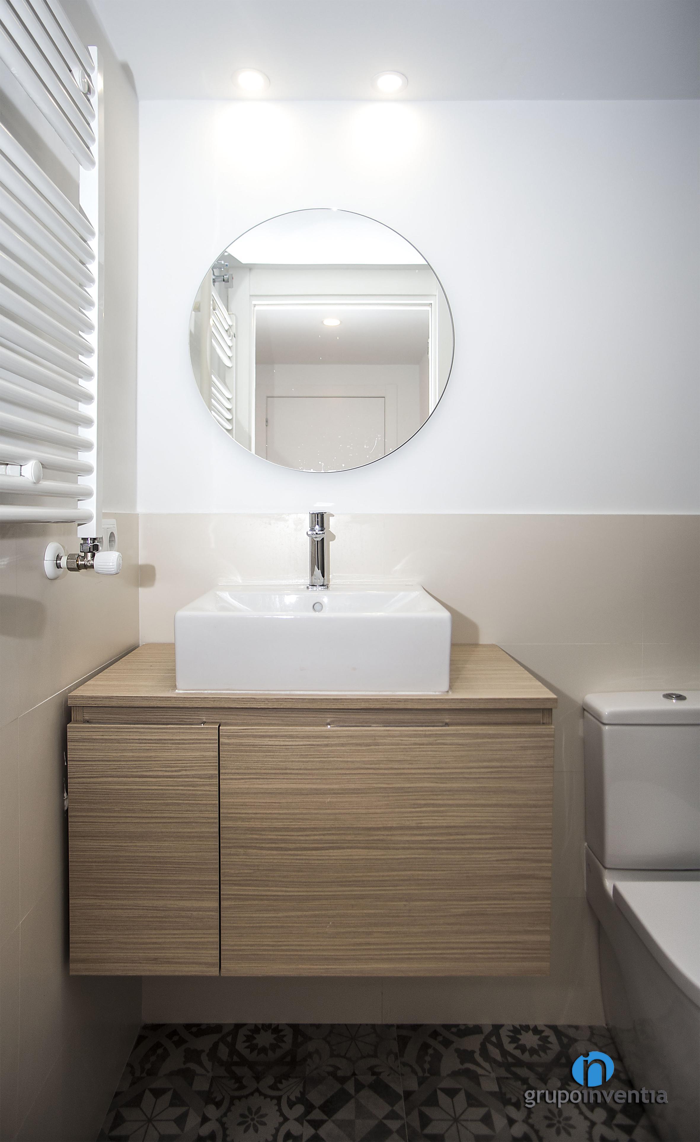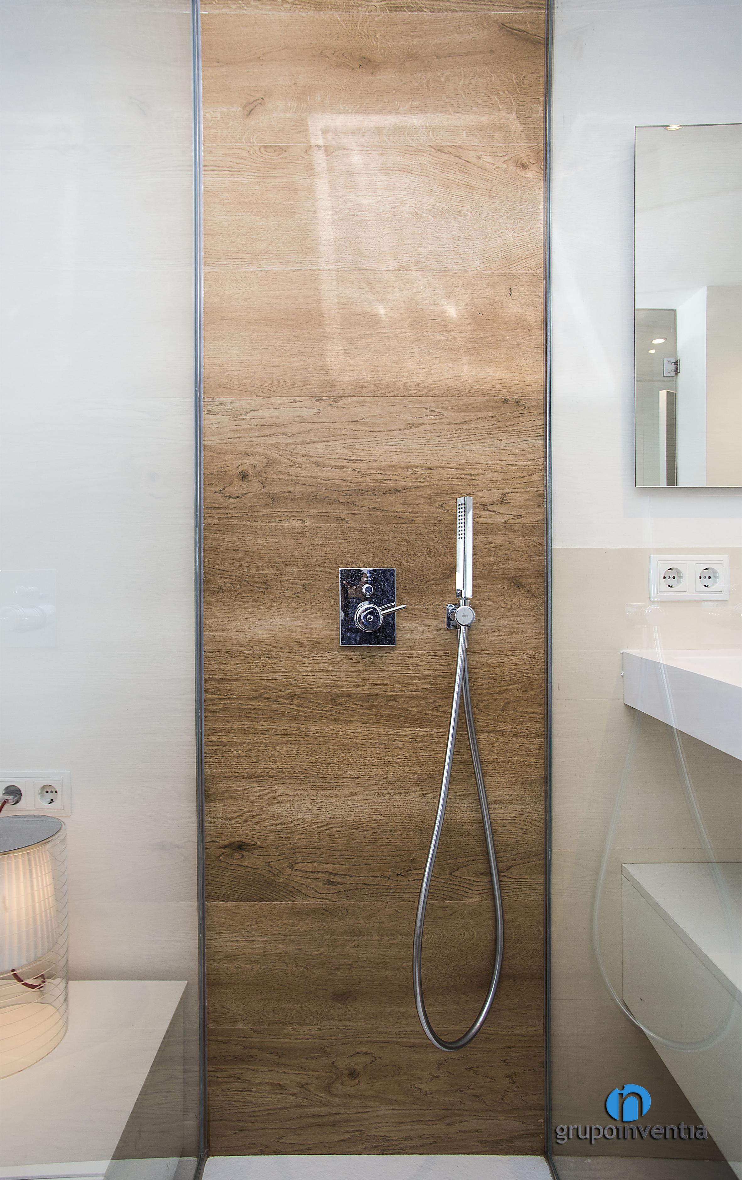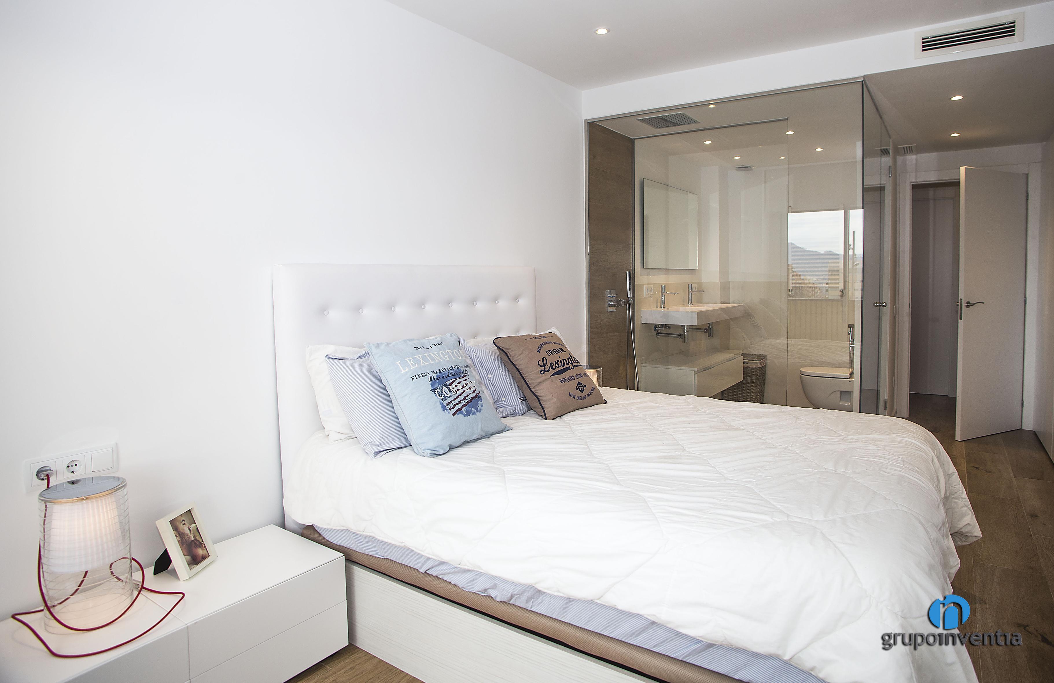 El dormitori principal d’aquest habitatge compta amb un bany propi equipat amb un ampli lavabo, un inodor suspès i una dutxa arran de terra. Per al seu disseny es van combinar tonalitats neutres en l’enrajolat i pintura de les parets amb un paviment de ceràmica que imita el parquet. El més destacat d’aquesta reforma de bany suite són les parets que el separen de l’estança, ja que aquestes són de vidre, una cosa que amplia l’espai visual del dormitori i permet que la llum natural flueixi amb total llibertat.