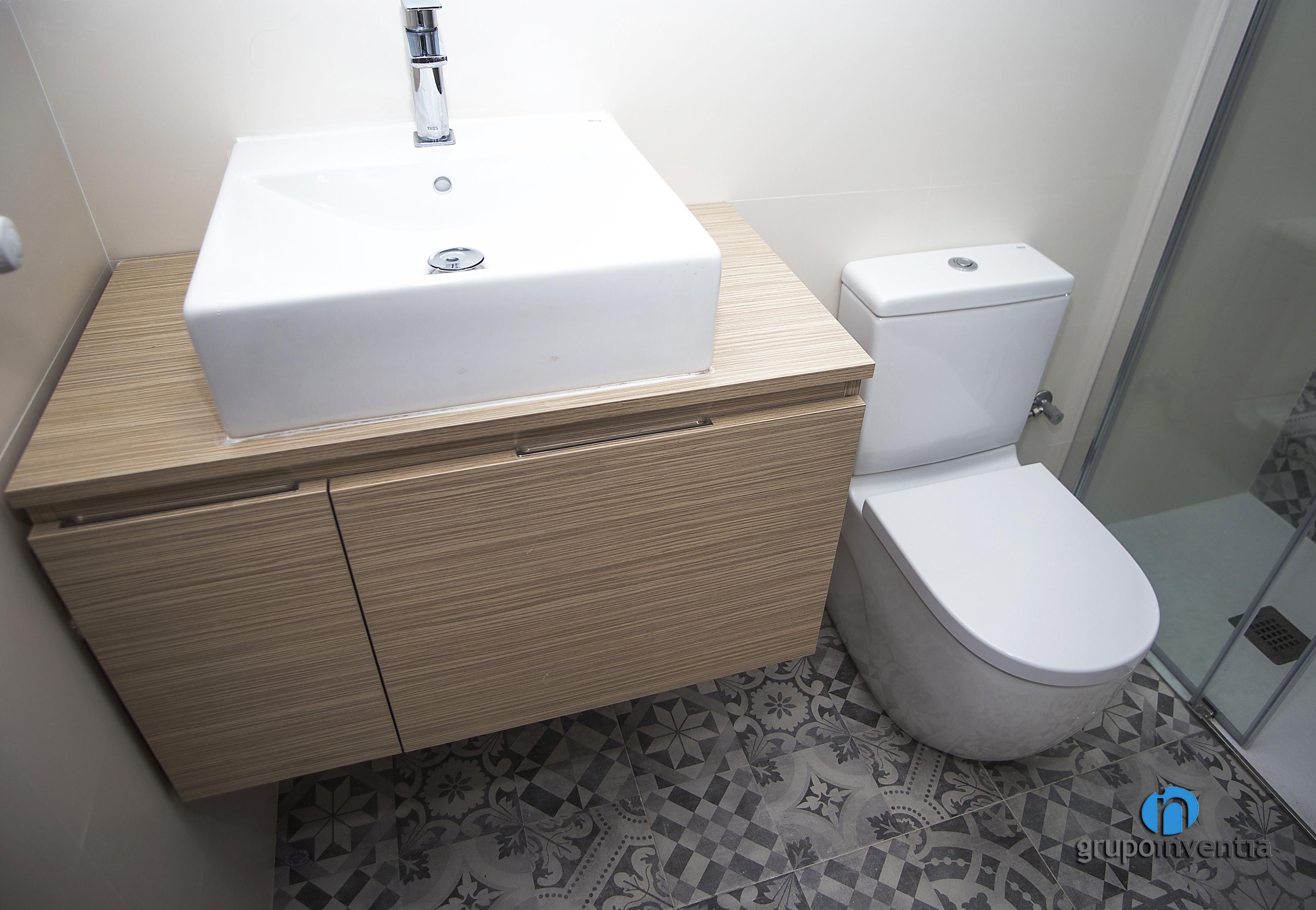 Per la seva banda, una porta corredissa ens dóna accés al bany de cortesia, una estada completament equipada i que ofereix molta funcionalitat en el seu ús. En aquest es van instal·lar un lavabo amb calaixera incorporada, un vàter i una dutxa.