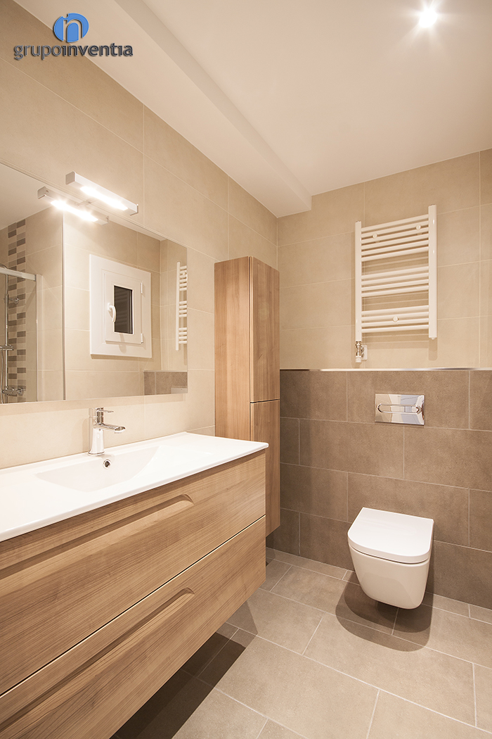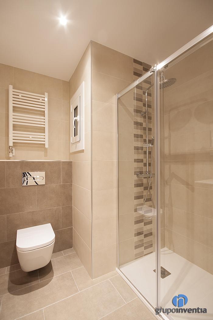 La reforma de bany va donar lloc a una estada molt acollidora i àmplia que compta amb els elements sanitaris imprescindibles per oferir les millors prestacions. Entre ells es troben un lavabo amb calaixera incorporada, un vàter suspès, que atorga un cert toc de disseny, i una àmplia dutxa protegida amb una mampara de portes corredisses que protegeix a l’estada d’esquitxades d’aigua.