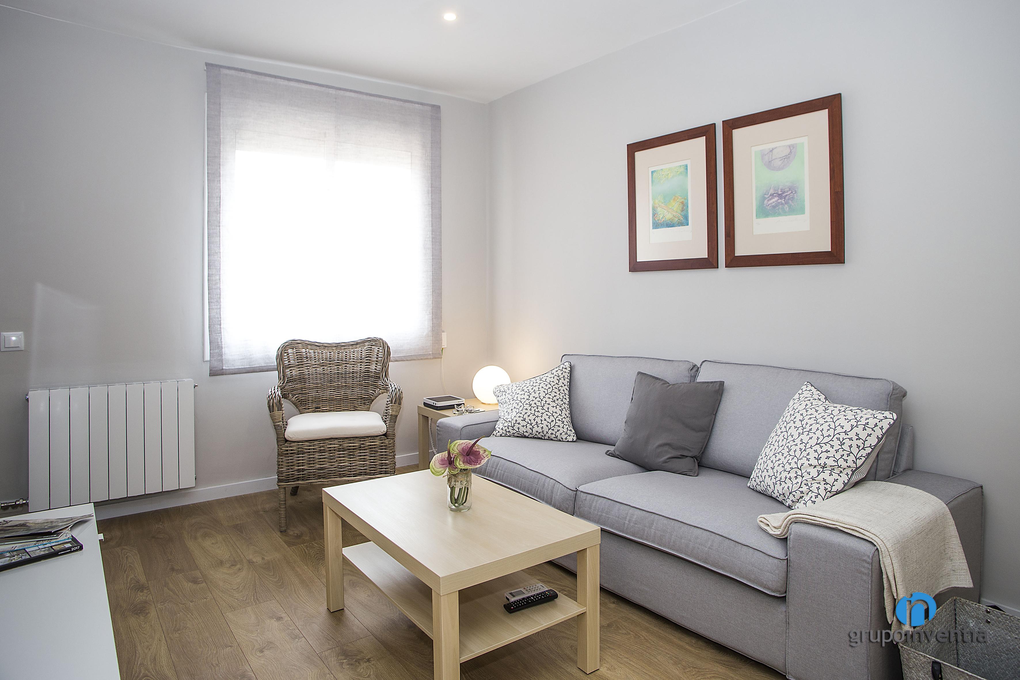 Al saló l’envolta un suau to de gris i un paviment de parquet en tons mitjans de fusta. A això li acompanya una gran entrada de llum natural, de manera que s’aconsegueix una estada ben àmplia i lluminosa. Aquest es va moblar amb un sofà de diverses places i una tauleta de centre, a més d’ancorar una televisió a la paret. En la seva entrada també es va col·locar una taula per a diversos comensals creant l’espai del menjador.