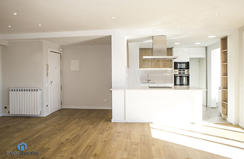Una de les grans avantatges d’aquesta reforma integral és que l’immoble gaudeix d’una gran entrada de llum natural, de manera que no va ser difícil aconseguir espai que oferissin major sensació d’amplitud i un ambient agradable. En bona part es va aconseguir en combinar els tons neutres amb els quals es van pintar les parets amb un paviment de parquet en tons mitjans de fusta.