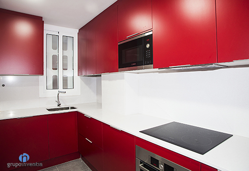 La cuina s’ubica en una estança independent i de superfície rectangular, per la qual cosa es va utilitzar una distribució en forma de L per col·locar els seus nous elements. En aquesta reforma de cuina a Barcelona destaca el viu color vermell del moble, que disposa d’una àmplia capacitat d’emmagatzematge tant en la part superior com inferior del taulell de cuina.