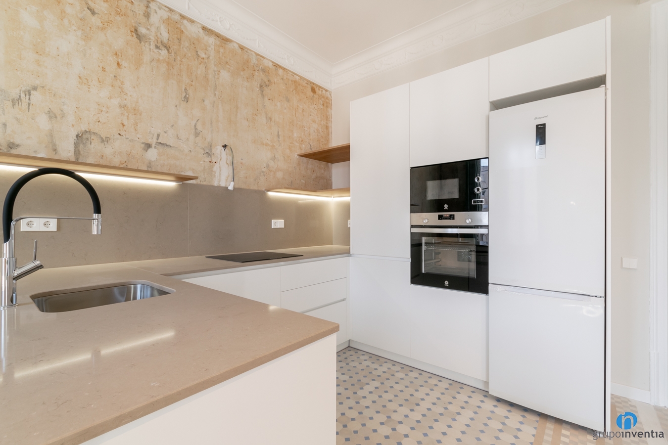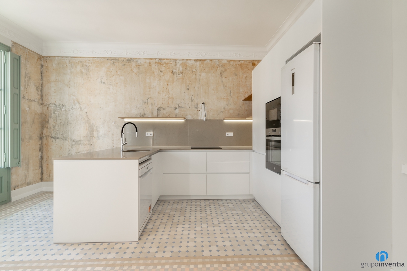 De la mateixa manera, la llum natural pot fluir amb facilitat per tot el pis, generant més calidesa. A més de les novetats, també hem restaurat elements originals de la vivenda. Destaquen els terres hidràulics de diverses zones del pis. Ens hem encarregat de netejar-los i polir-los per recuperar-ne el millor estat. Alhora, també hem restaurat les finestres del saló i les parets de la cuina i el dormitori principal.