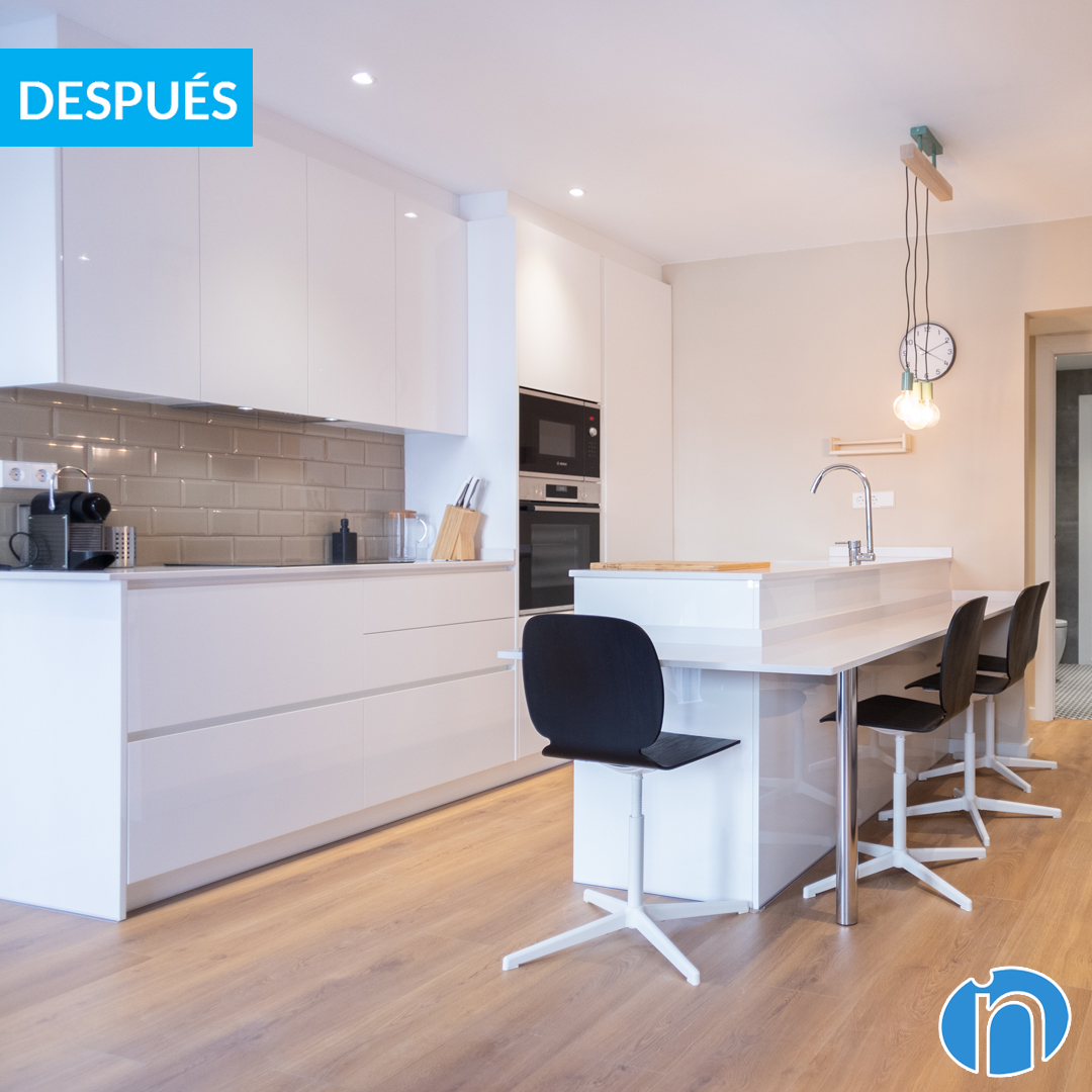 La cuina està distribuïda a dos fronts i disposa d’una barra que funciona com a zona de menjador. Aquesta barra de cuina també ofereix una gran superfície de suport i emmagatzematge. El moble de cuina és lineal i disposa de diversos calaixos i armaris a la part inferior i superior del taulell. A més, s’han integrat els nous electrodomèstics: forn, microones i nevera.