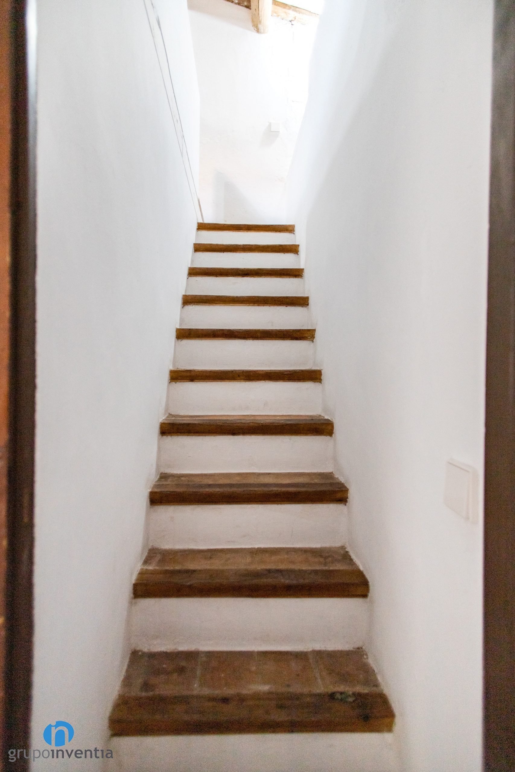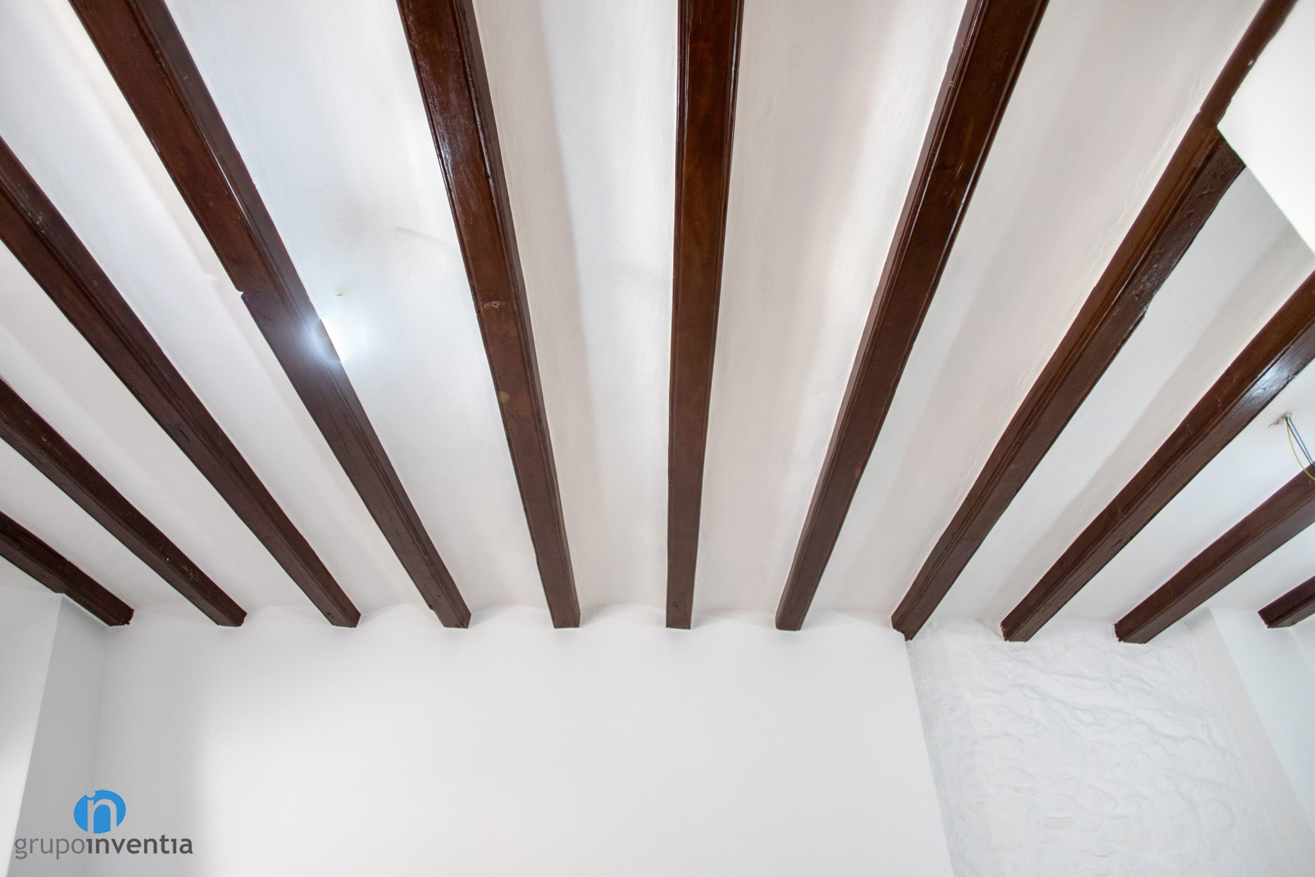Aquest immaculat color blanc de les parets s’ha combinat amb la personalitat càlida que transmet la fusta. Tant les portes i finestres com els seus marcs es presenten en tons forts de fusta, oferint una imatge molt natural. Aquest és l’esquema seguit amb les bigues a la vista i en els esglaons de les escales interiors.
