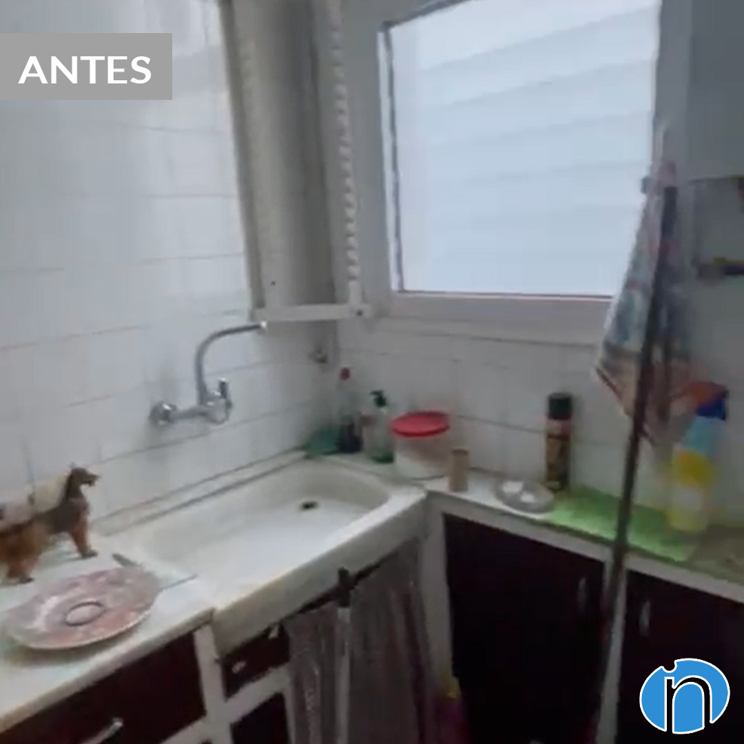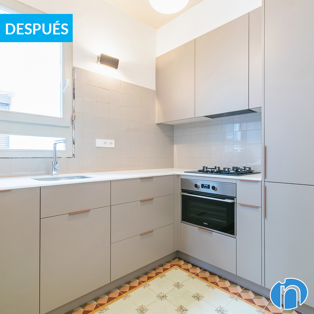 Aquesta reforma integral ha ofert una redistribució de diverses estades de l’habitatge. Originalment, a la dreta de l’entrada hi havia una cambra de bany i una habitació. Ara a aquesta mateixa ubicació ens trobem la nova cuina. Té forma de L i s’enquadra en un espai obert que permet molta mobilitat. Sí que s’ha mantingut l’espai de rebost.