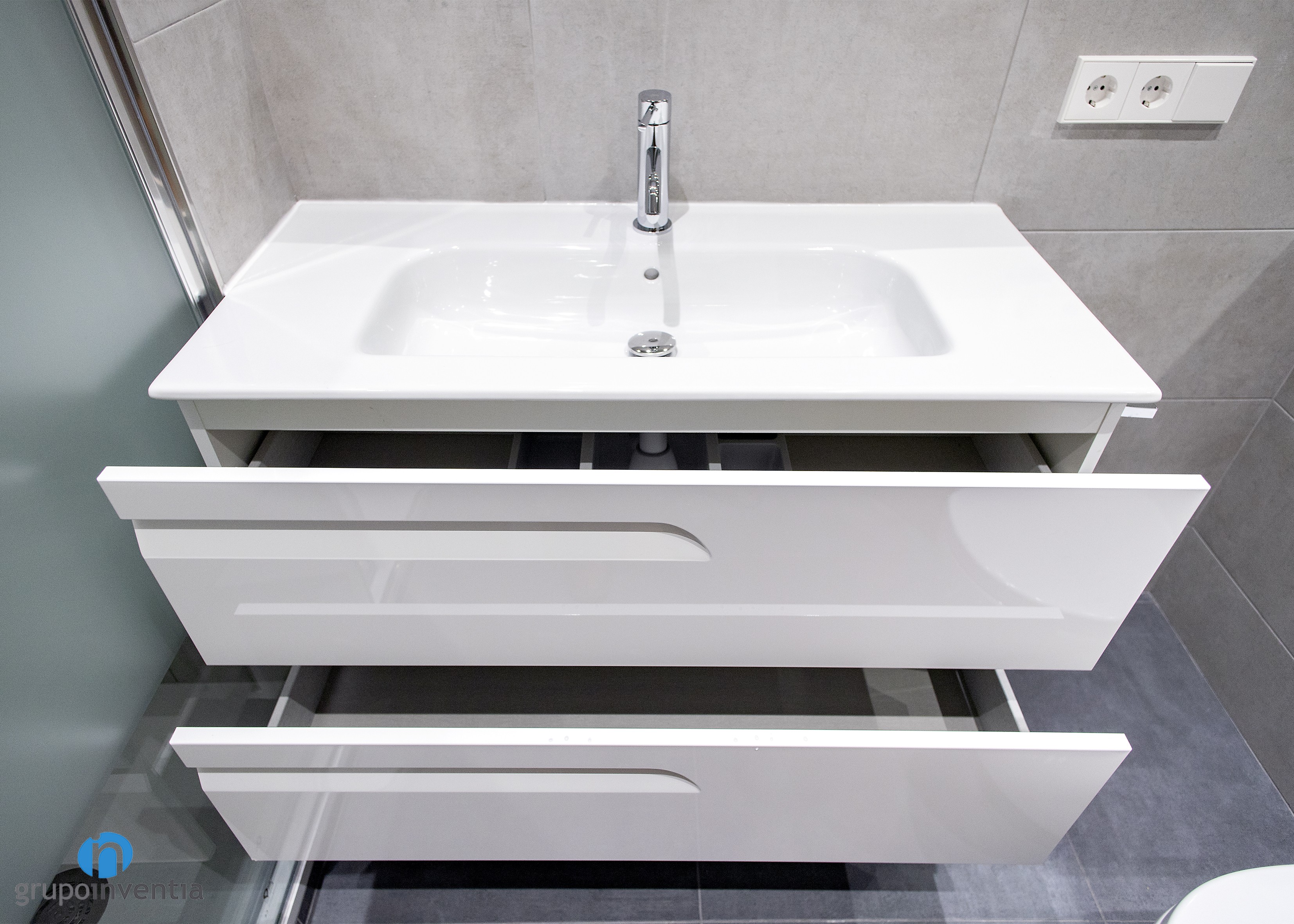 Una altra de les millores en aquesta reforma de bany va ser la col·locació d’un nou equipament sanitari. Ara l’estança compta amb els elements necessaris per oferir les millors prestacions i funcionalitat a l’hora de fer ús d’ells. Aquest es compon d’un lavabo amb moble d’emmagatzematge incorporat, un vàter i una aquesta protegida amb mampares de portes corredisses transparents.
