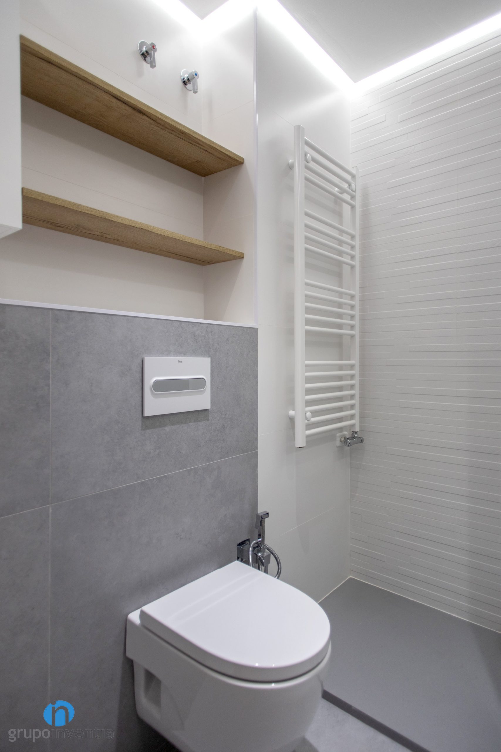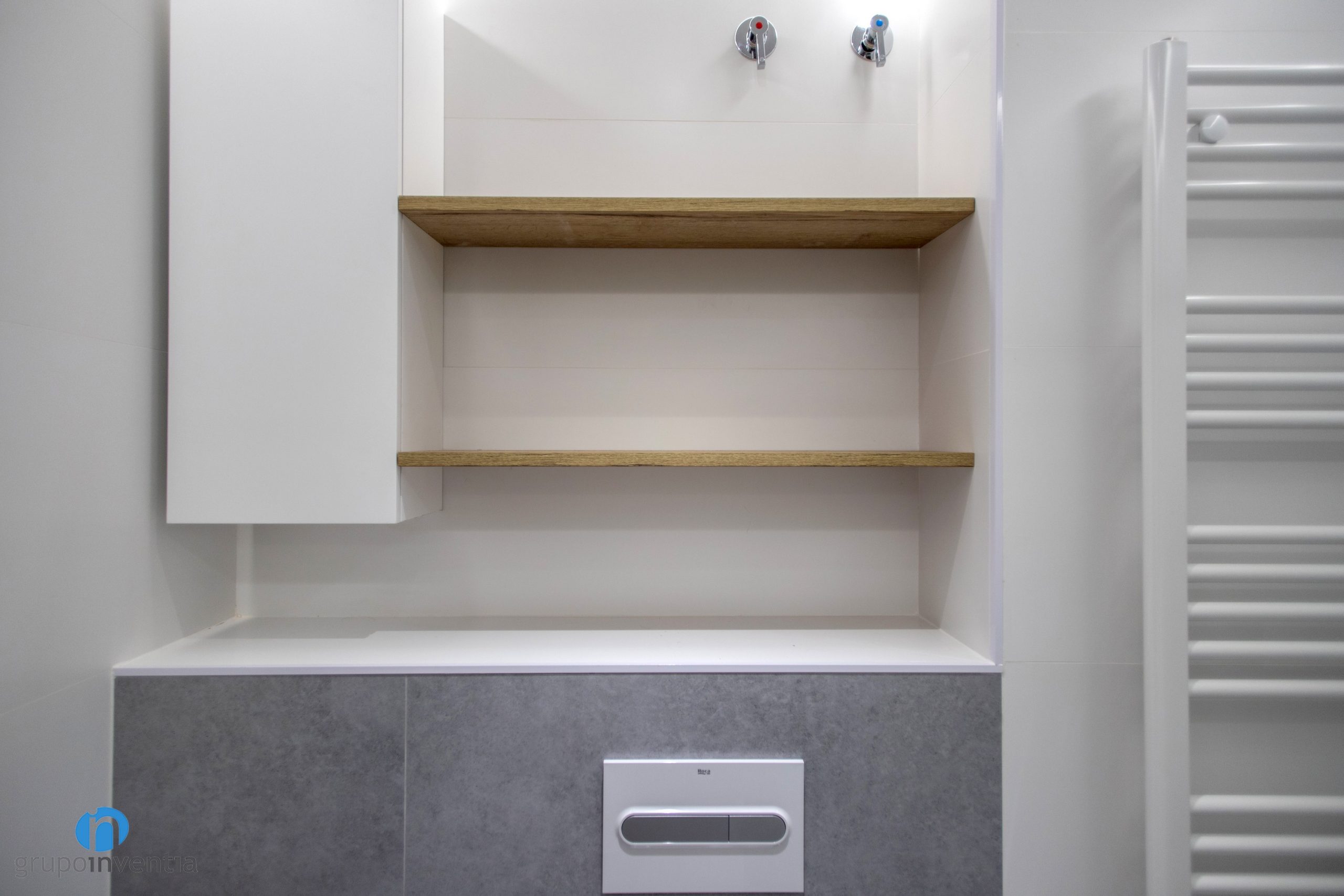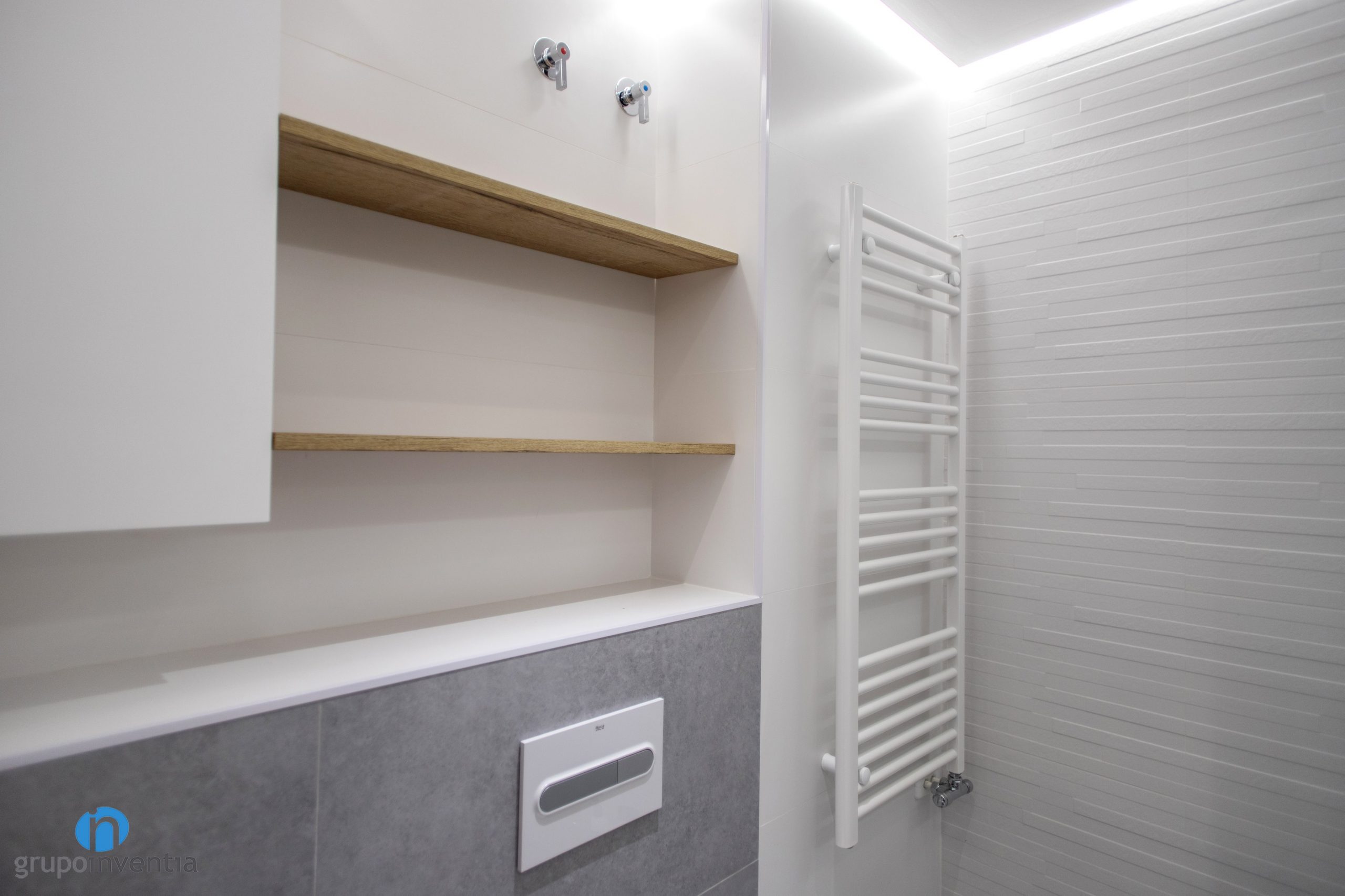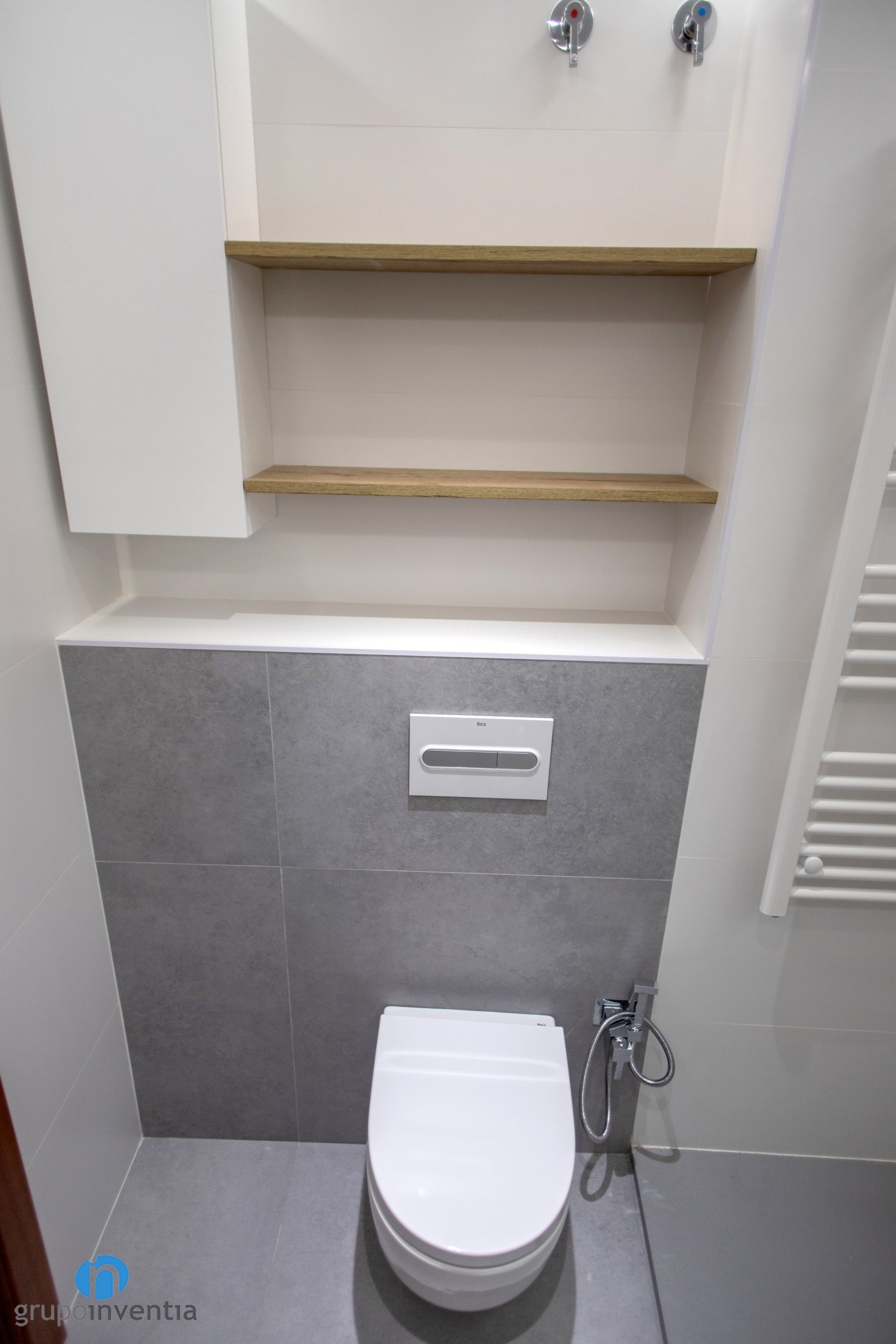 Un altre aspecte a millorar en tota reforma de bany és la imatge de l’estança. A Grupo Inventia disposem d’un departament d’interiorisme que elabora projectes a mida i t’assessora personalment durant tota l’obra. En aquest cas la major part de les sembles s’ha enrajolat amb rajoles blancs. No obstant això per a la paret de l’inodor s’han utilitzat rajoles grises.