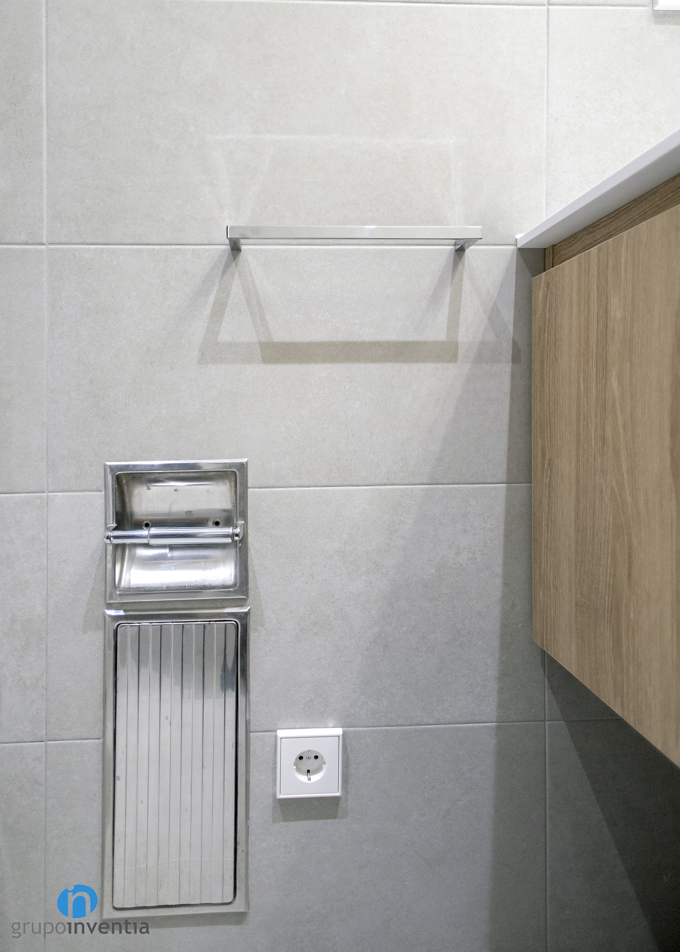 En aquesta reforma de bany les parets es van enrajolar per complet amb rajoles de color beige, de manera que els punts esmentats es van aconseguir amb escreix. Gràcies a aquesta tonalitat neutra es van poder introduir altres colors, com el gris del paviment de gres col·locat, o la fusta, present en el moble de bany.