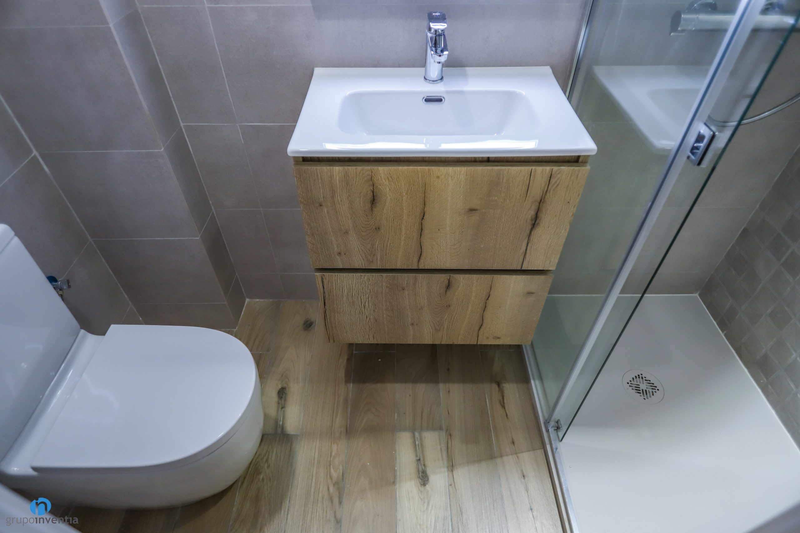 Per al nou paviment dels banys s’ha escollit un terra ceràmic imitació fusta. D’aquesta manera s’aconsegueix una imatge global a tot l’habitatge. A més, es tracta d’un tipus de terra concebut per a espais com les cambres de bany.