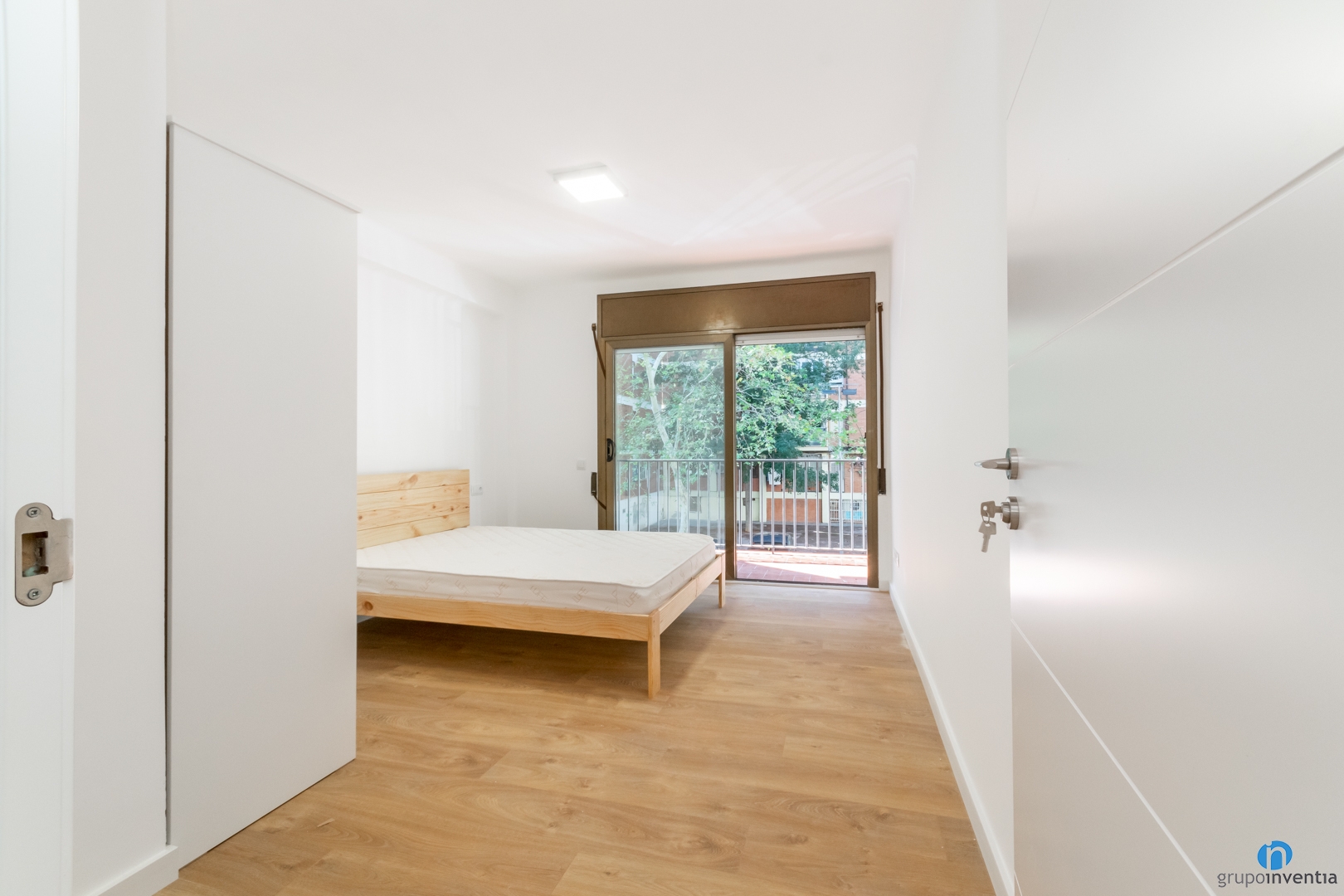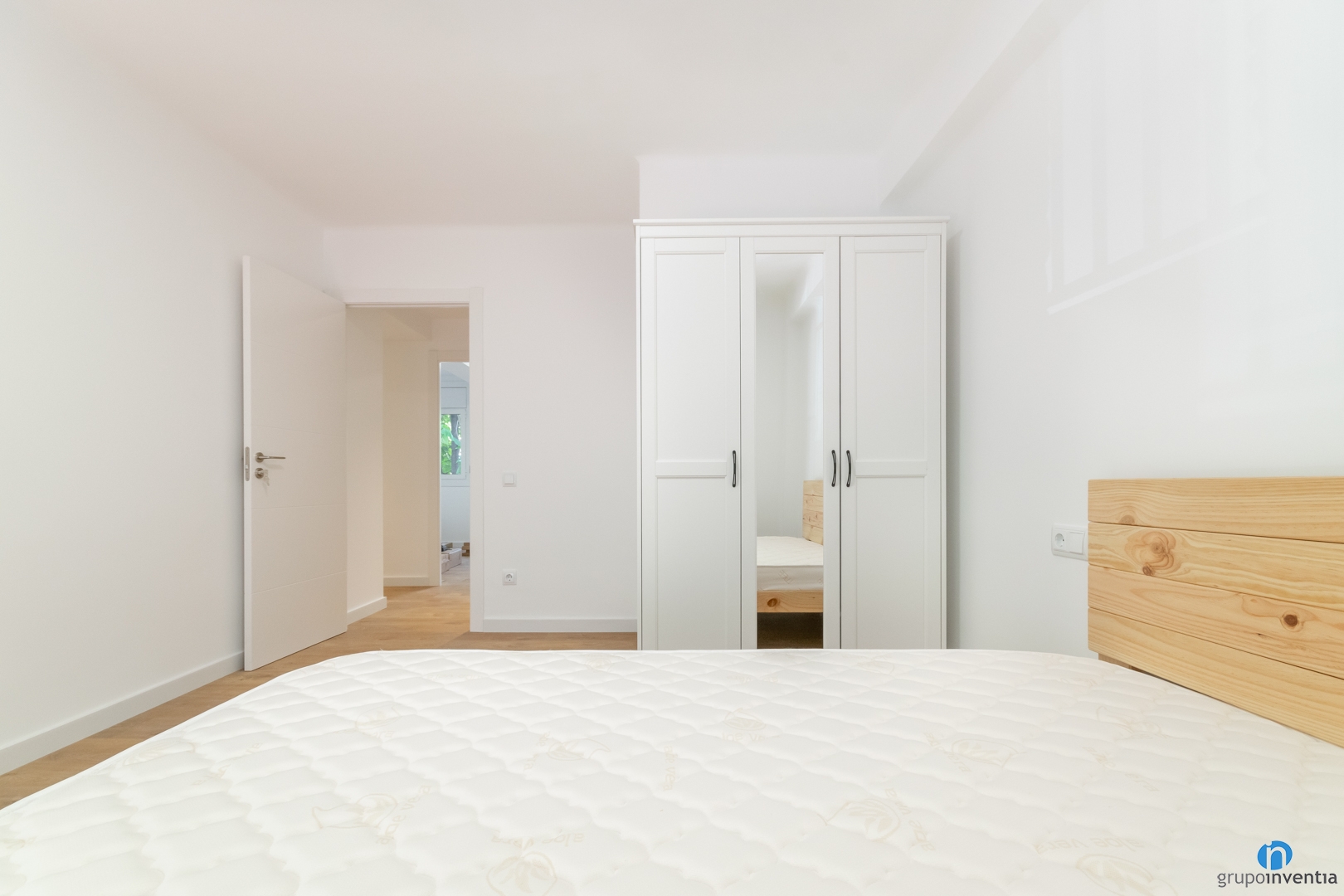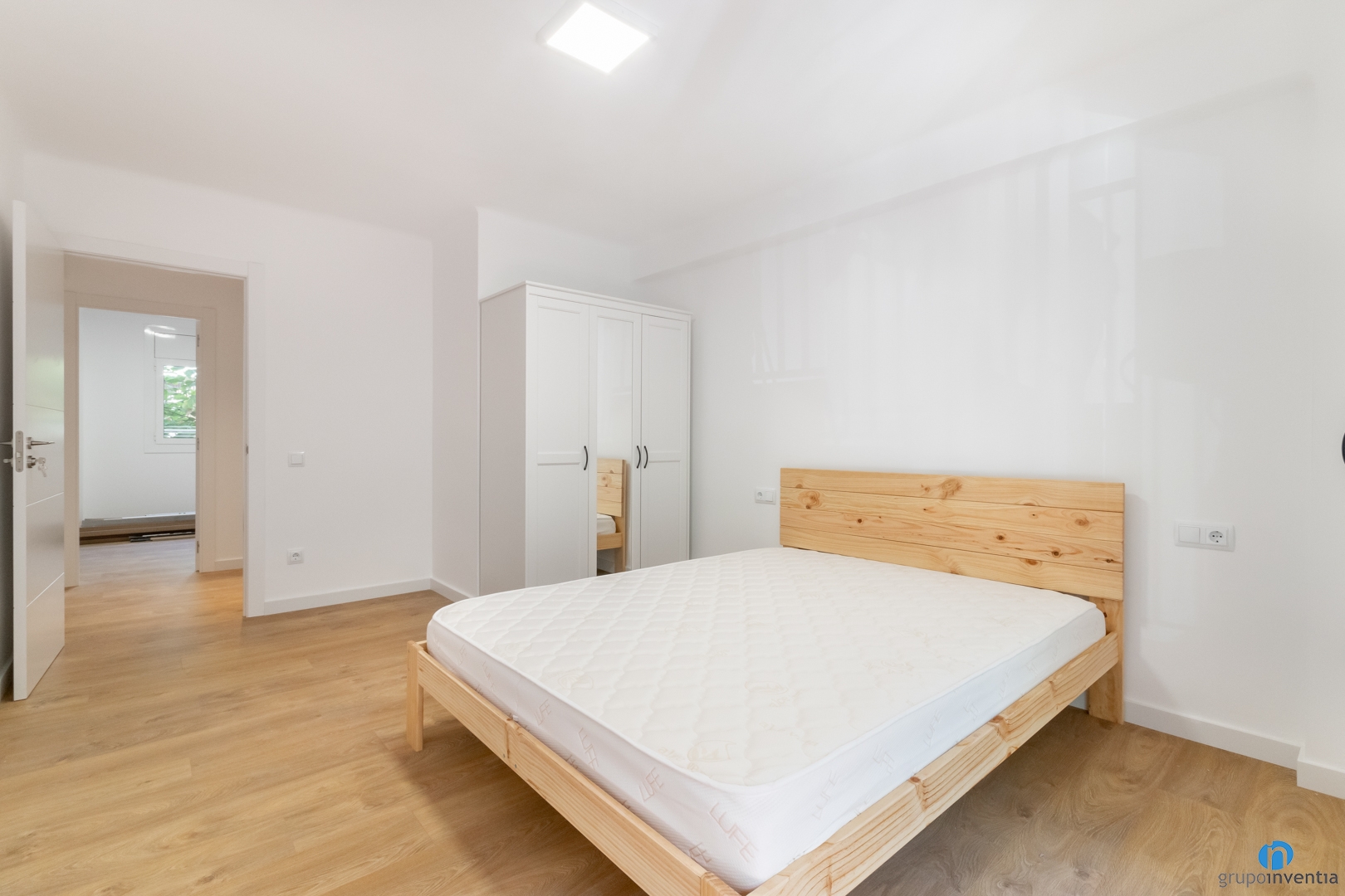 També ens hem encarregat de deixar llestos els mobles del dormitori principal. Un llit d’estructura de fusta i un armari de tres portes estan a punt per ser utilitzats. Com que es tracta d’un interiorisme neutre accepta tota mena de decoracions i és fàcil de combinar. Si la idea general és un estil contemporani, el mobiliari de fusta és un encert segur.