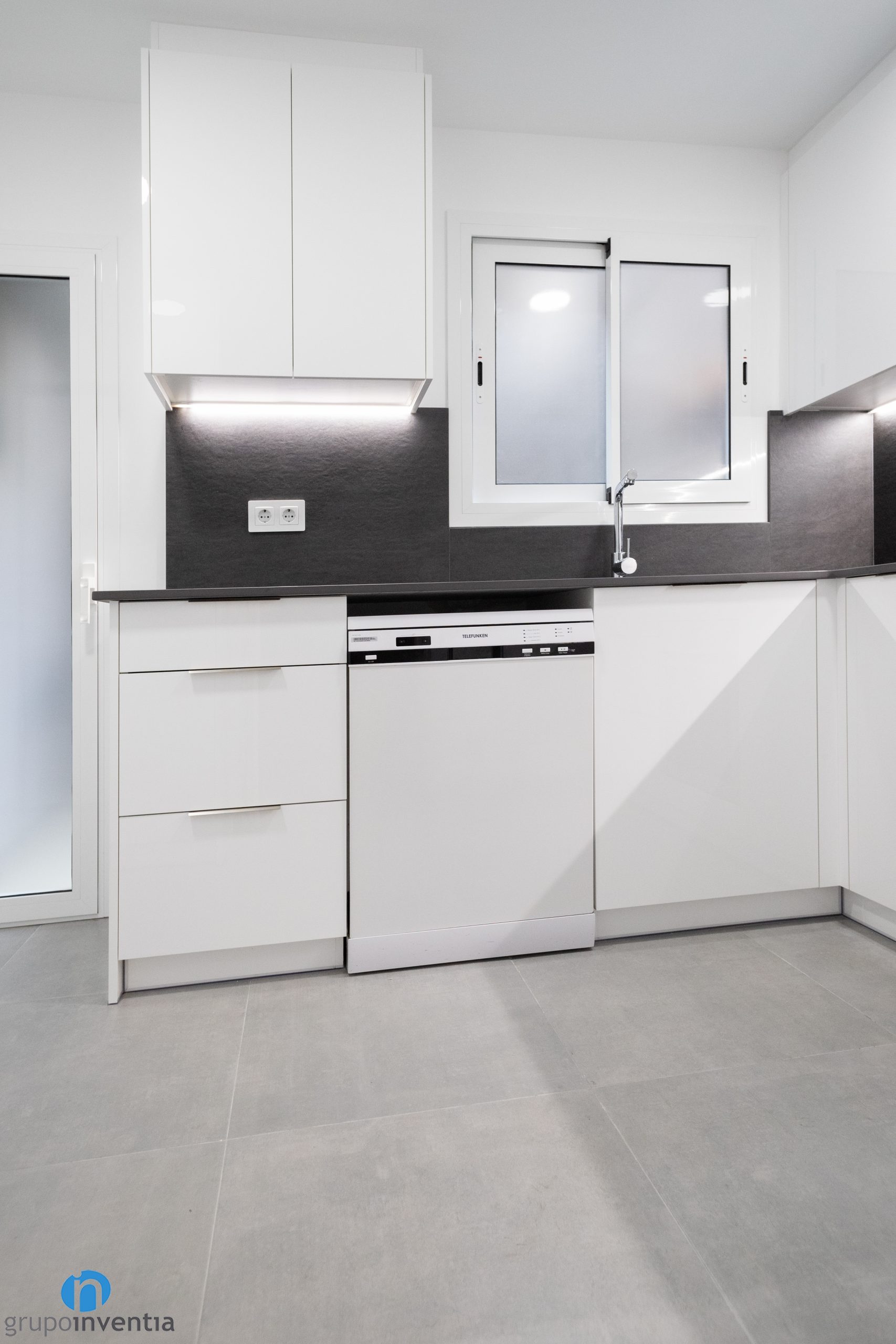 A més de la instal·lació dels nous electrodomèstics també s’ha millorat la imatge de la cuina. Per això s’ha optat per un disseny modern i que combina els colors blanc i gris. Els panells del moble de cuina són de color blanc i contribueixen a generar lluminositat i amplitud a la cuina. Perquè la seva obertura sigui còmoda, s’han col·locat uns tiradors de color blanc.