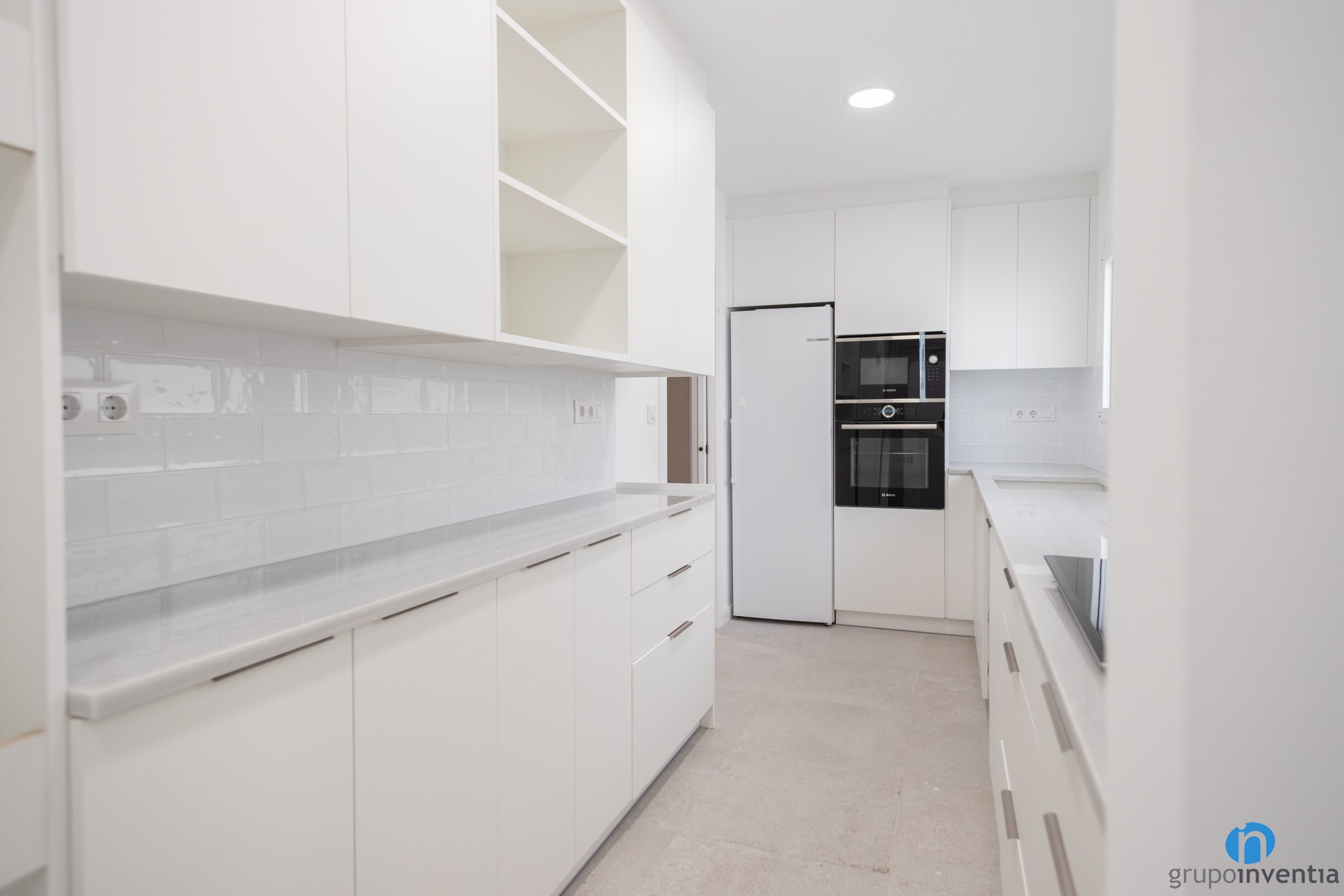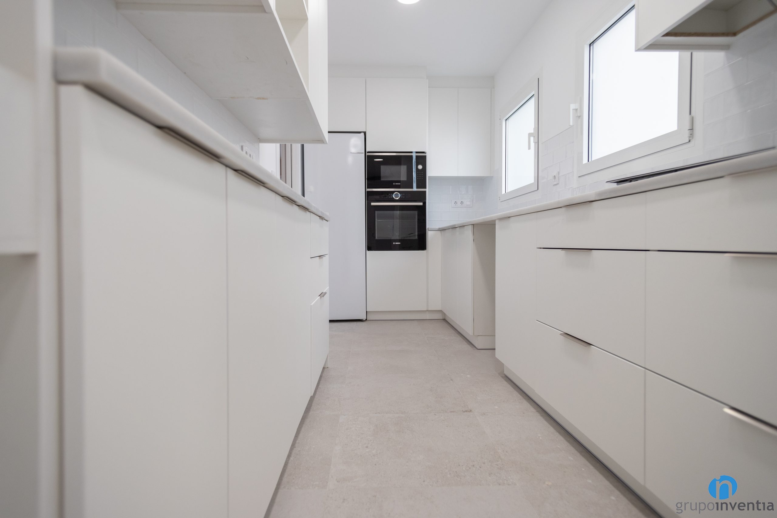 Per al disseny de la cuina s’ha seguit amb l’estil global de l’habitatge. Una imatge contemporània que en aquest cas es genera mitjançant un moble de cuina blanc. Amb això s’aconsegueix una cuina molt lluminosa i que genera més sensació d’amplitud. També s’ha col·locat un nou terra de gres apte per a cuines.
