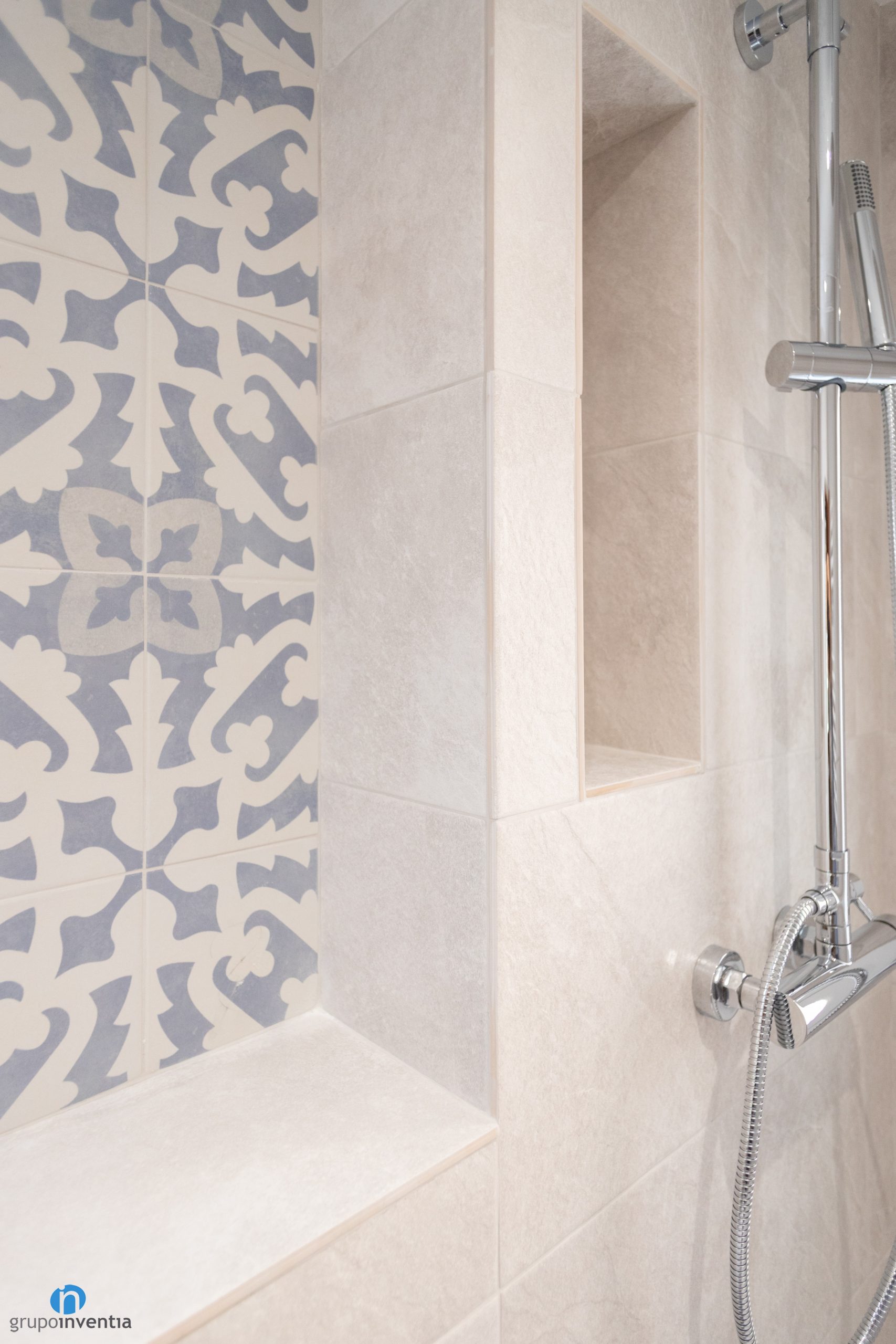 Per enrajolar la paret de la part dreta s’ha optat per rajoles tipus hidràulic amb dibuixos en color blanc i blau. Aporta personalitat a la cambra de bany i encaixa perfectament amb el nou paviment. Per a les rajoles de el nou terra de bany s’han utilitzat peces amb el mateix acabat que s’ha esmentat.