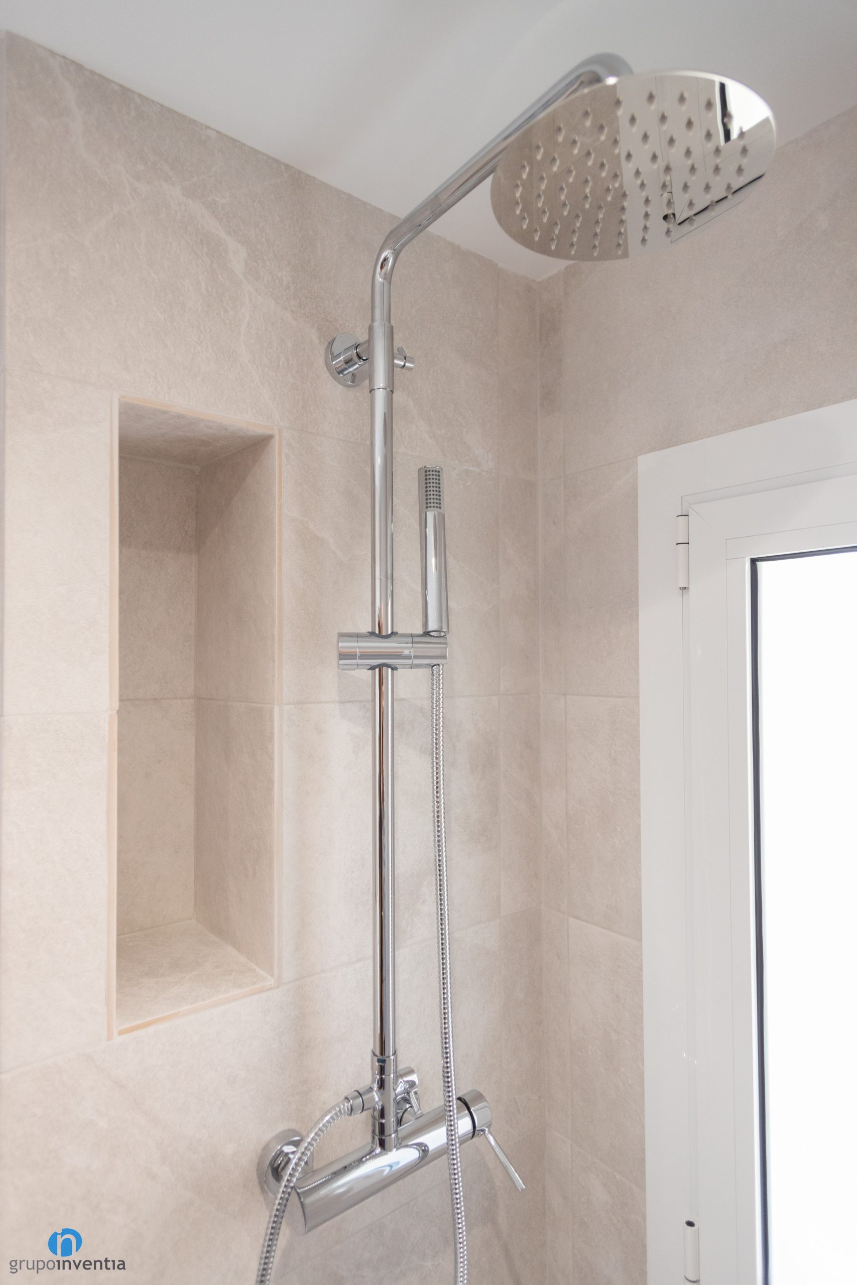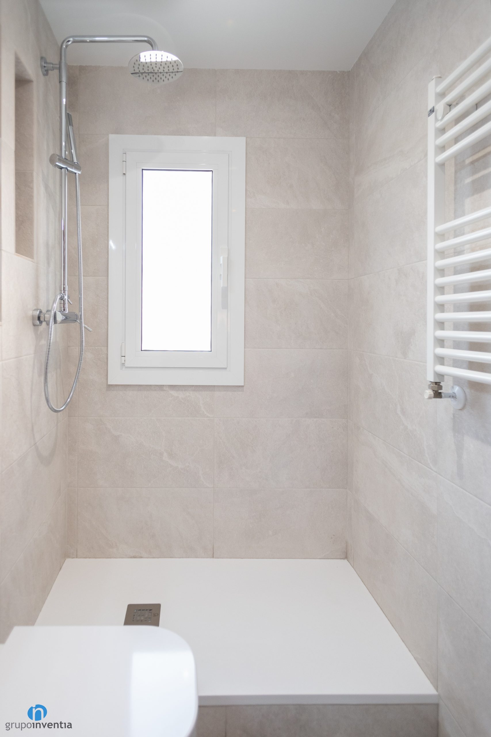 El plat de dutxa és de color blanc i està lleugerament elevat de terra. Per a aquesta ocasió no s’han col·locat tancaments donat que la ubicació de la dutxa així ho permet. També s’ha instal·lat una nova aixetes amb acabat en color plata a l’igual que el nou aixeta de lavabo. A la paret de la dutxa també s’ha canviat la finestra. Ara és de fusteria d’alumini i assegura un correcte aïllament tèrmic.