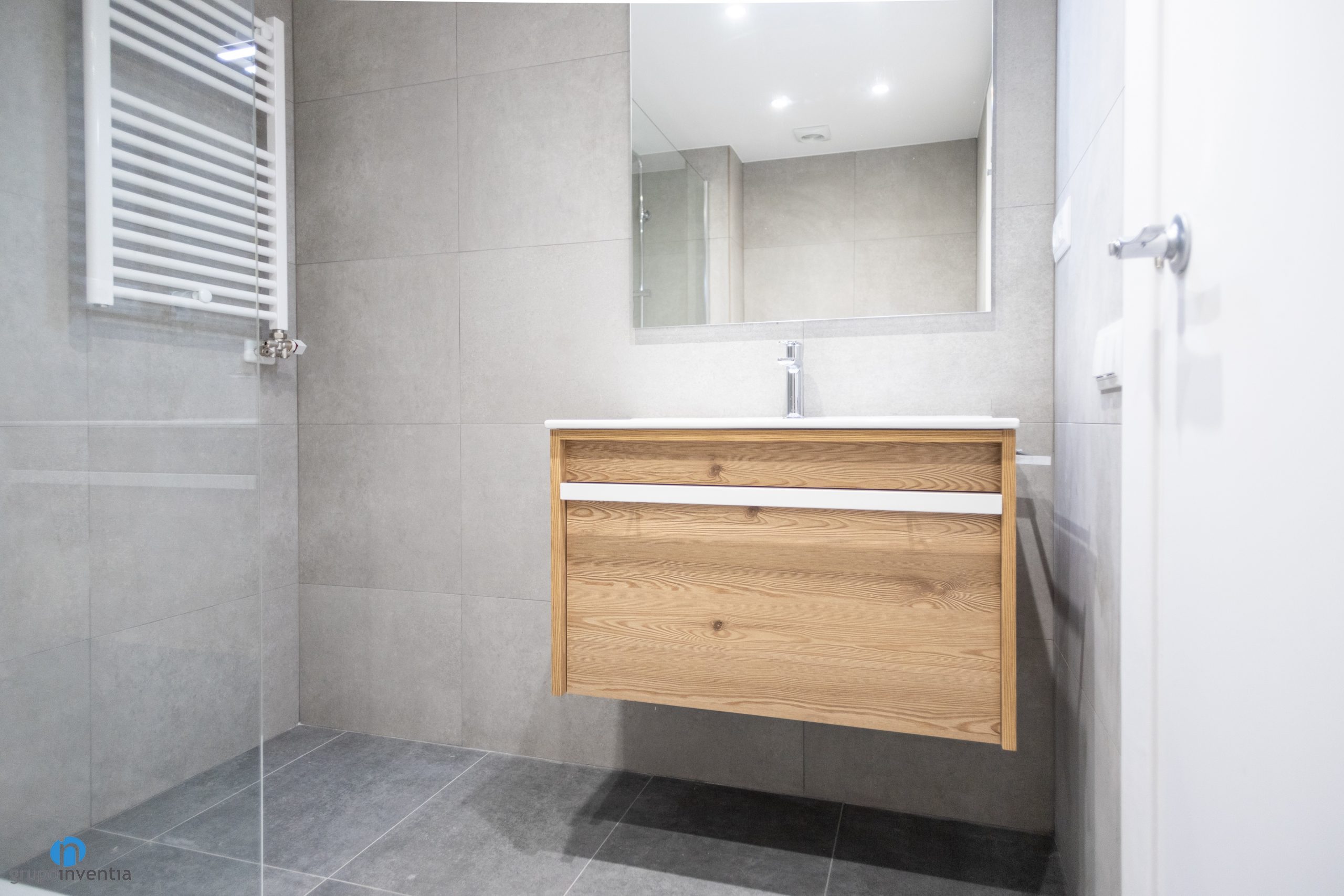 S’ha instal·lat un lavabo flotant de si gran amb un moble d’emmagatzematge a la zona inferior. Gràcies a això es poden ordenar i organitzar tota mena de productes d’higiene i de bany. A més, aquesta reforma de bany és àmplia i es pot habilitar més espai d’emmagatzematge al bany amb, per exemple, un armari vertical. L´acabat del moble de bany és en tons clars de fusta i encaixa a la perfecció amb la imatge global.