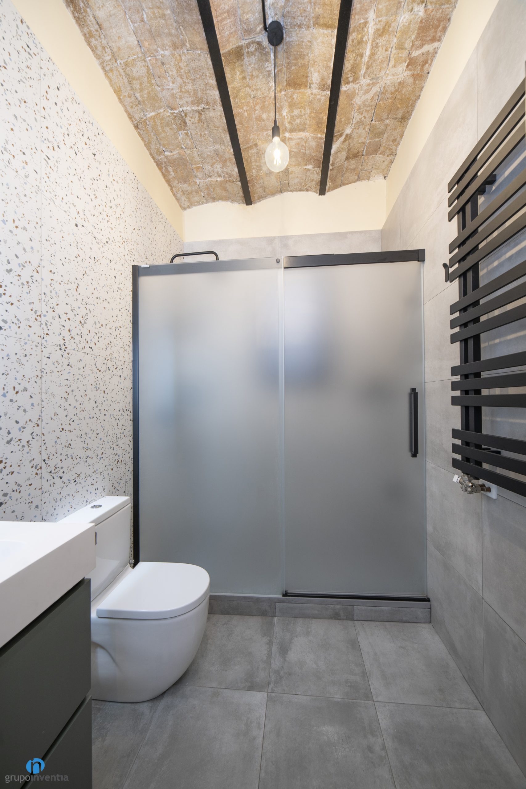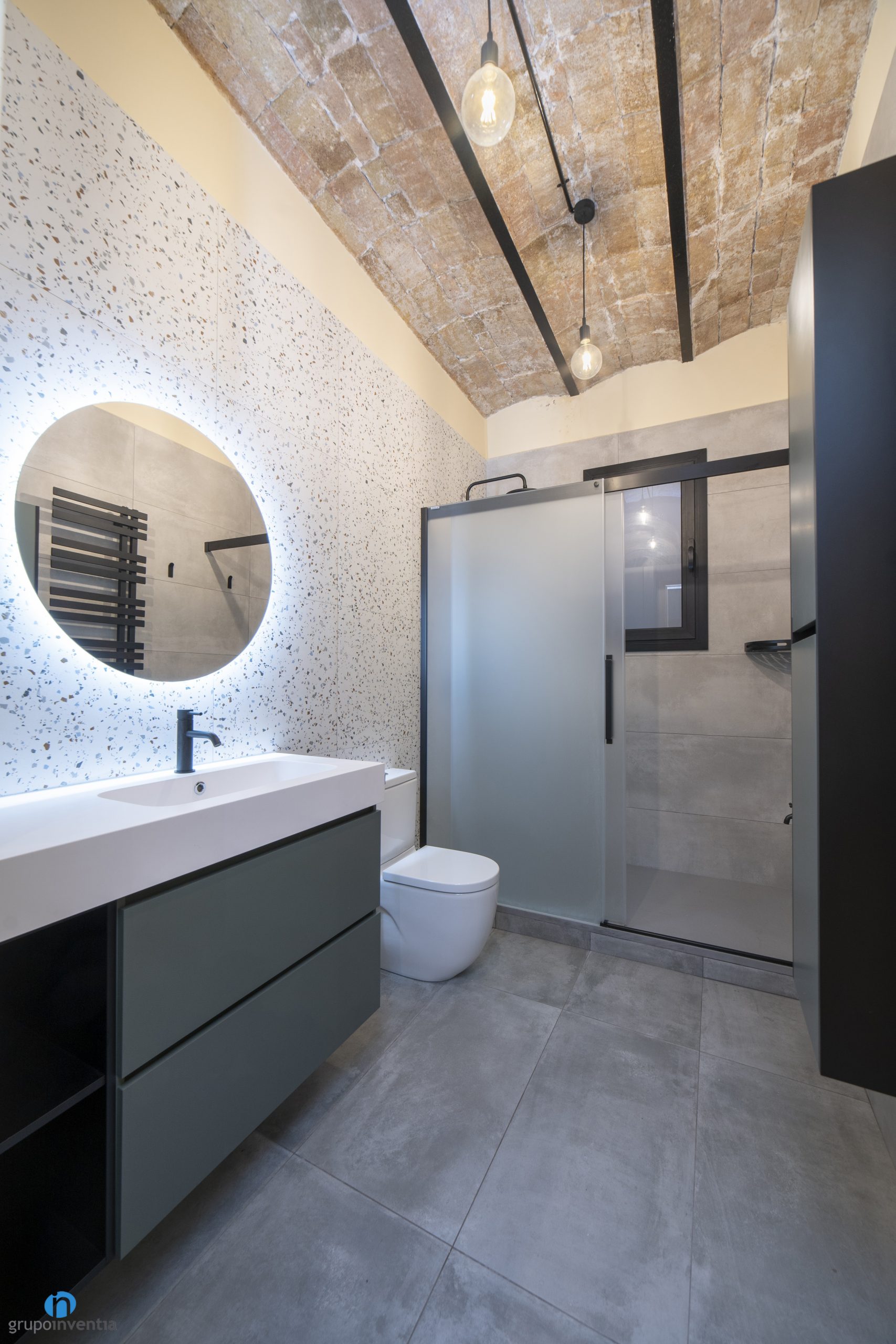 Com hem esmentat hi ha alguns elements que s’han restaurat. El més destacat és el sostre, en què s’ha mantingut la volta catalana original. La personalitat que aporta el maó vist en aquesta reforma de bany a El Prat de Llobregat és fantàstica i s’aconsegueix un punt de disseny industrial.