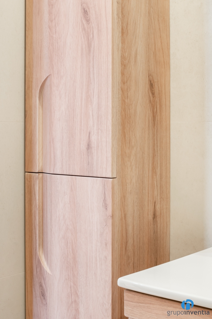 Gràcies a això hem potenciat l’amplitud visual de la cambra de bany. Aquest punt augmenta amb el contrast del sostre de color blanc. A més, es tracta d’un disseny d’estil neutre que contribueix a generar més lluminositat. També hem afegit altres acabats com els de fusta, presents al nou mobiliari de bany.