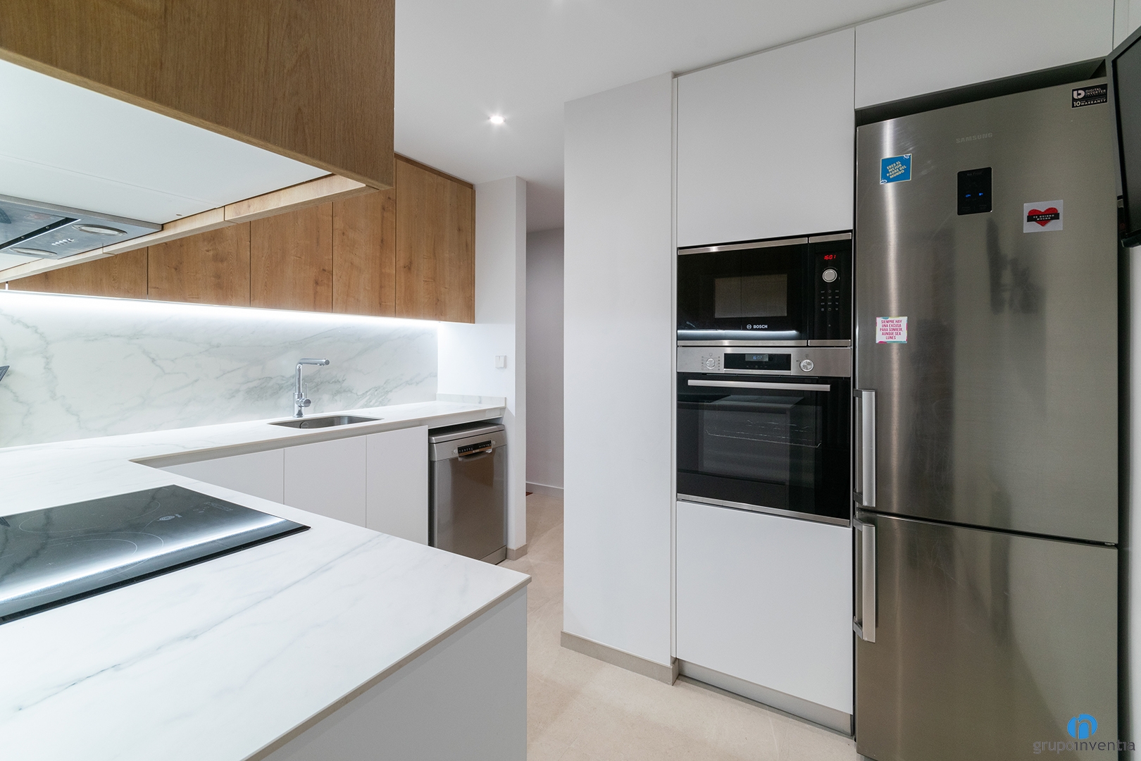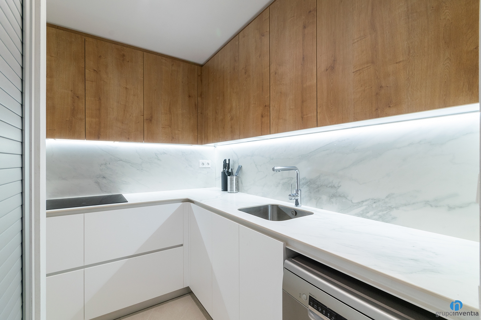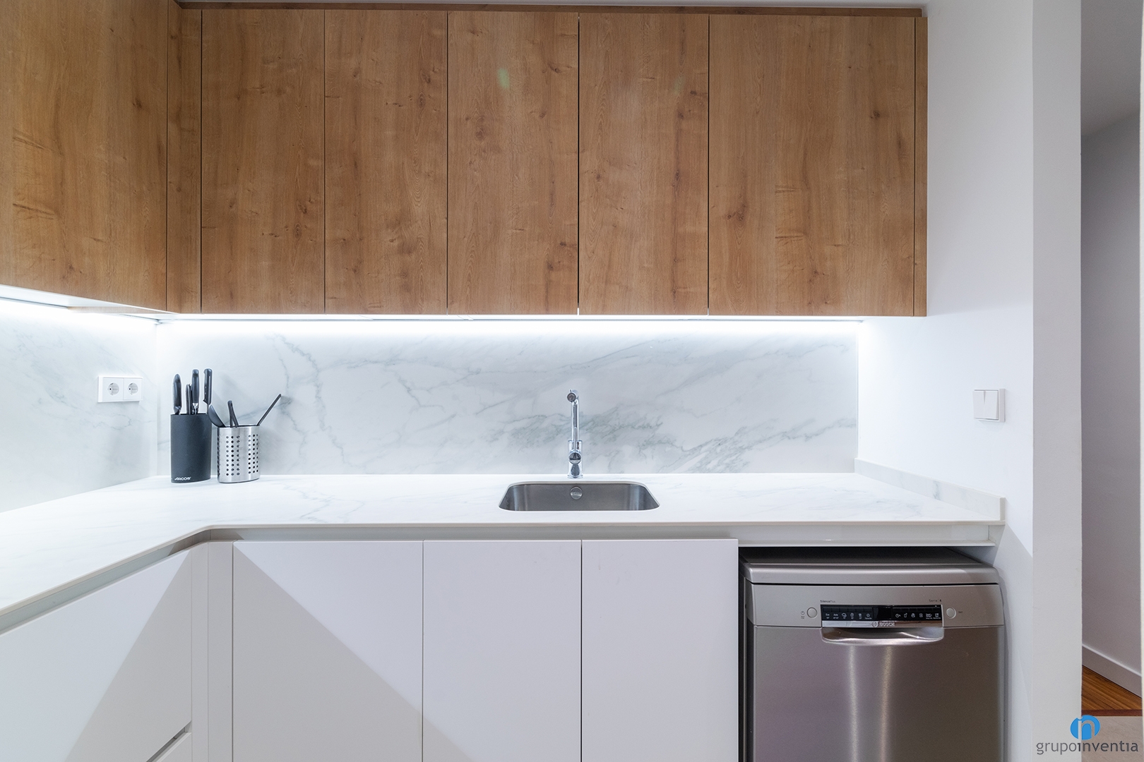 Hem aconseguit generar un espai lluminós i visualment ampli. Les noves llums estan encastades al sostre. També hem reforçat la il·luminació amb tires LED que il·luminen tot el taulell.