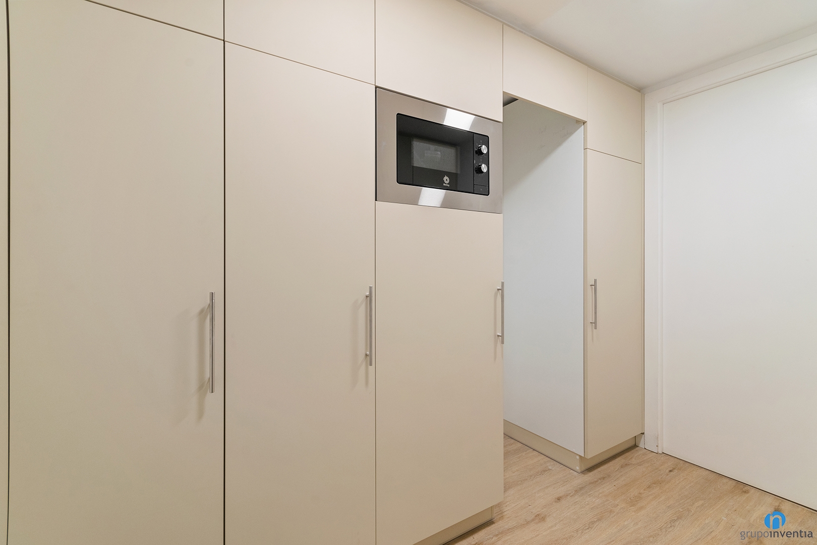 Es tracta d’una cuina àmplia i amb una distribució a dos fronts. A més de l’equipament que hi hem instal·lat, hem ampliat la capacitat d’emmagatzematge. En aquest sentit hi ha espai per guardar tota mena d’elements de cuina. Alhora, disposa d’armaris allargats per emmagatzemar jaquetes o altres objectes de carrer.