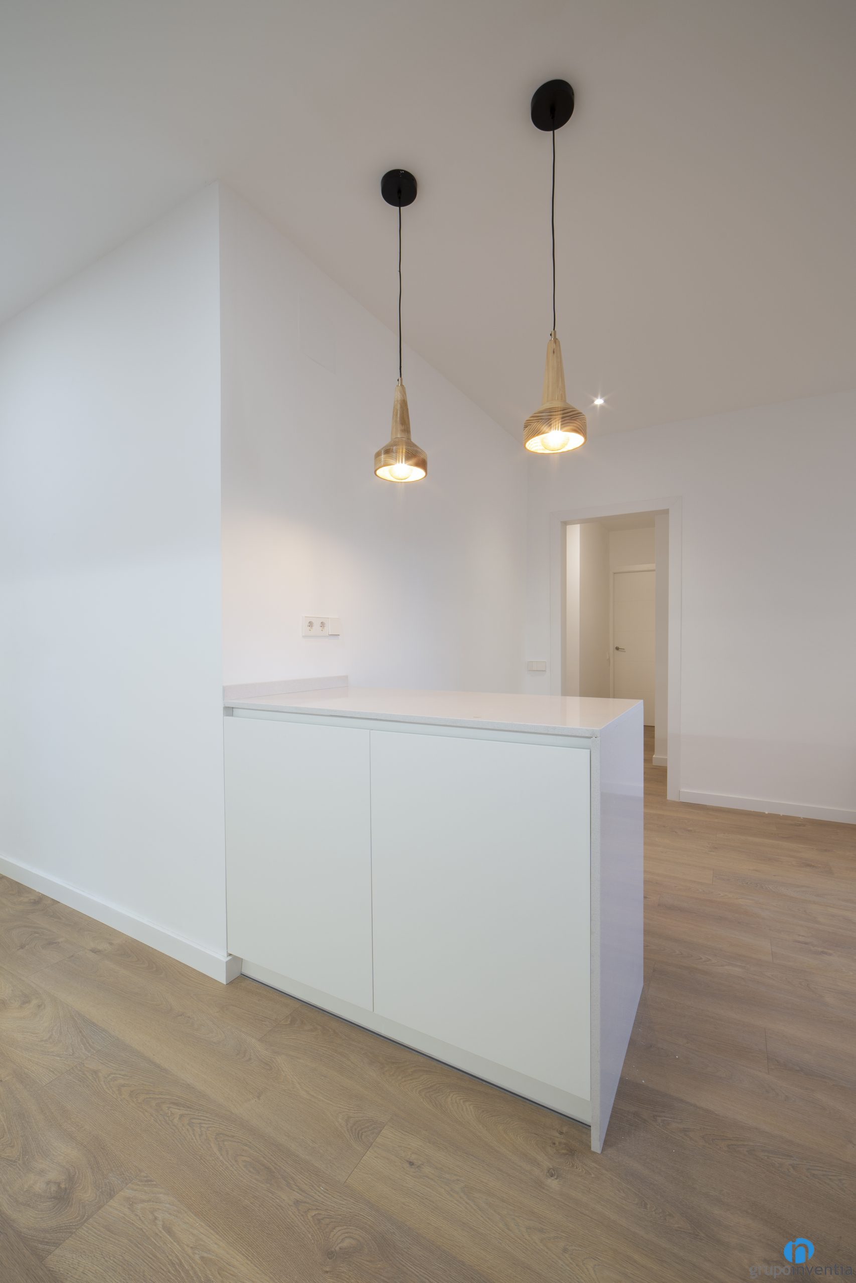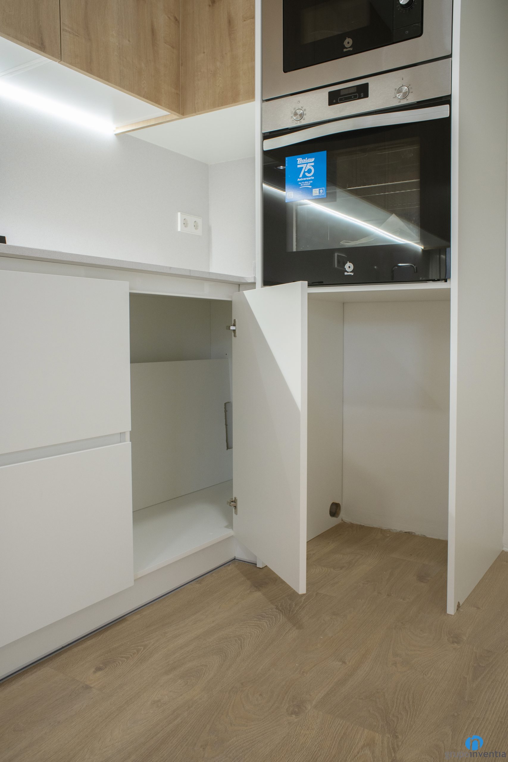 El moble de cuina continua a la zona central i té buits a mida per col·locar els nous electrodomèstics. Concretament es poden col·locar una nevera, un forn, un microones i també una rentadora. A la part dreta s’ha instal·lat una barra de cuina que genera un espai ideal per a menjars distesos.
