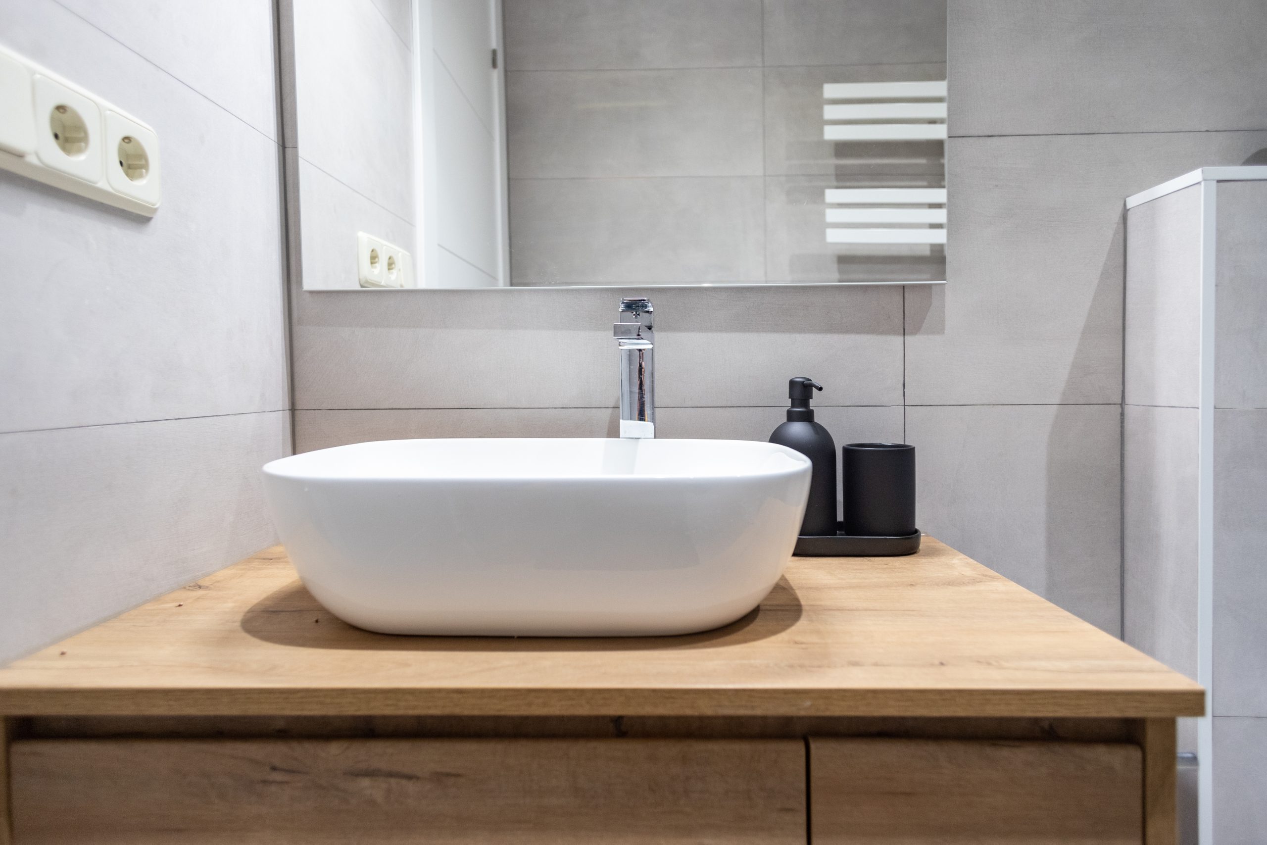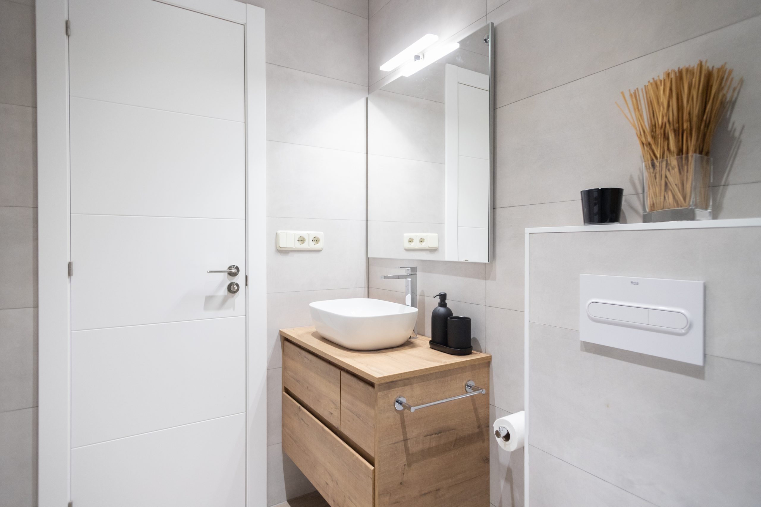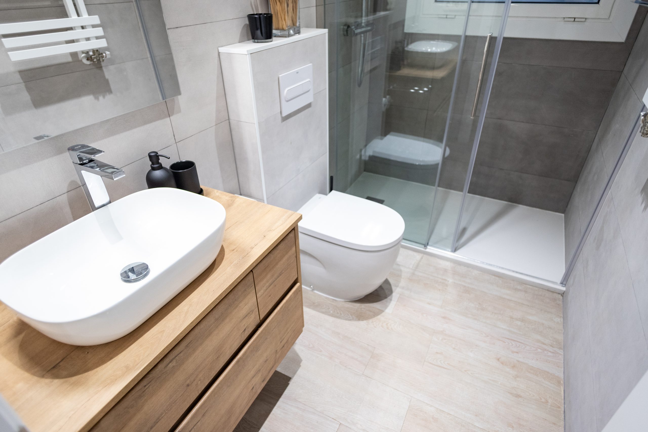 Per al nou disseny de bany s’han escollit rajoles de to gris suau. Hem enrajolat totes les parets per complet i hem aconseguit un ambient fresc i agradable. Es potencia molt més amb el nou paviment de bany, un terra ceràmic que imita el parquet. També hem instal·lat una seca tovalloles elèctric i hem col·locat un mirall de bany sobre el lavabo.