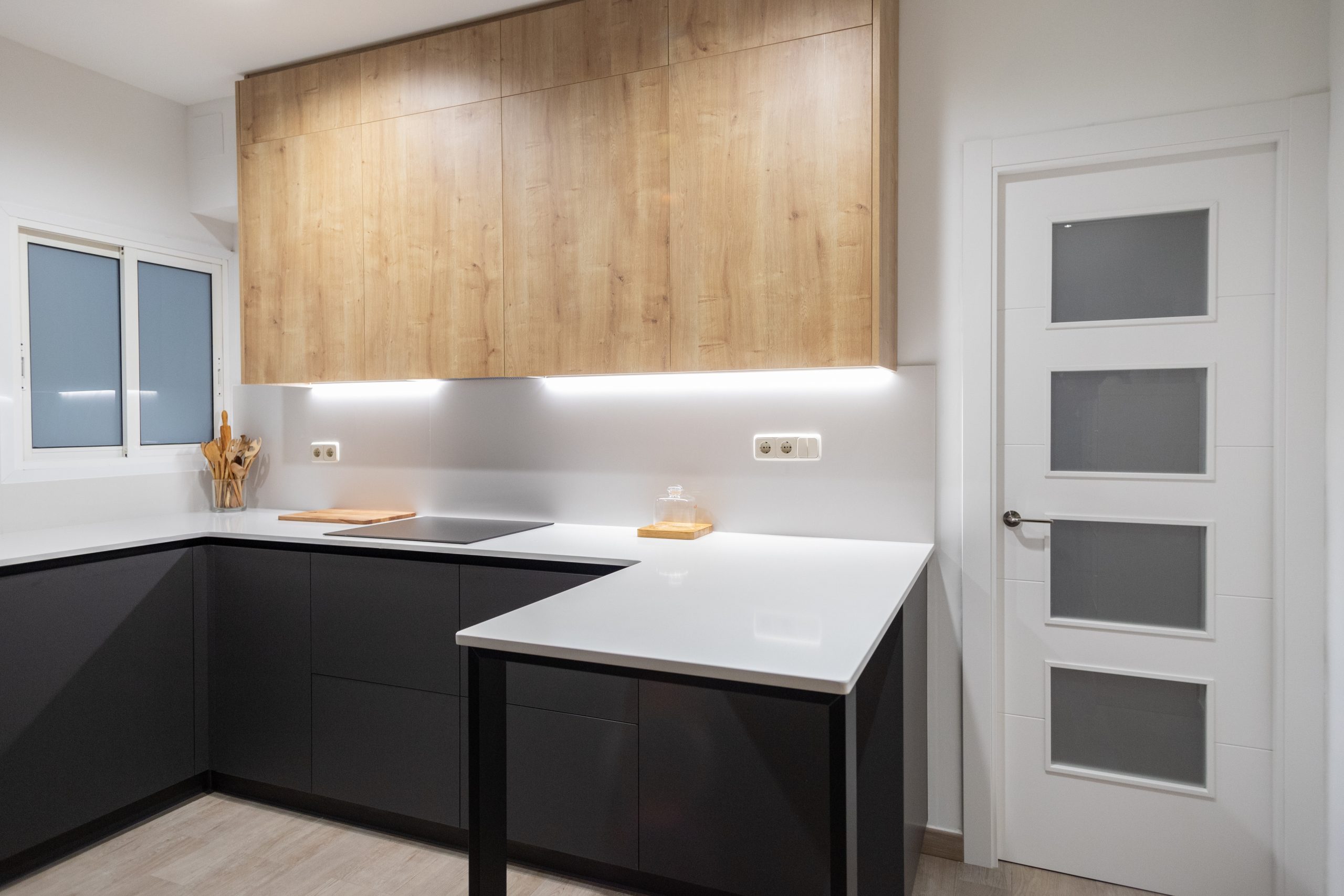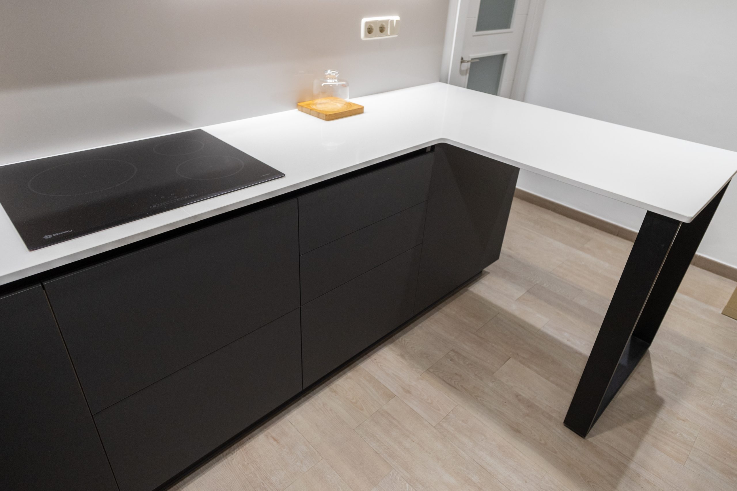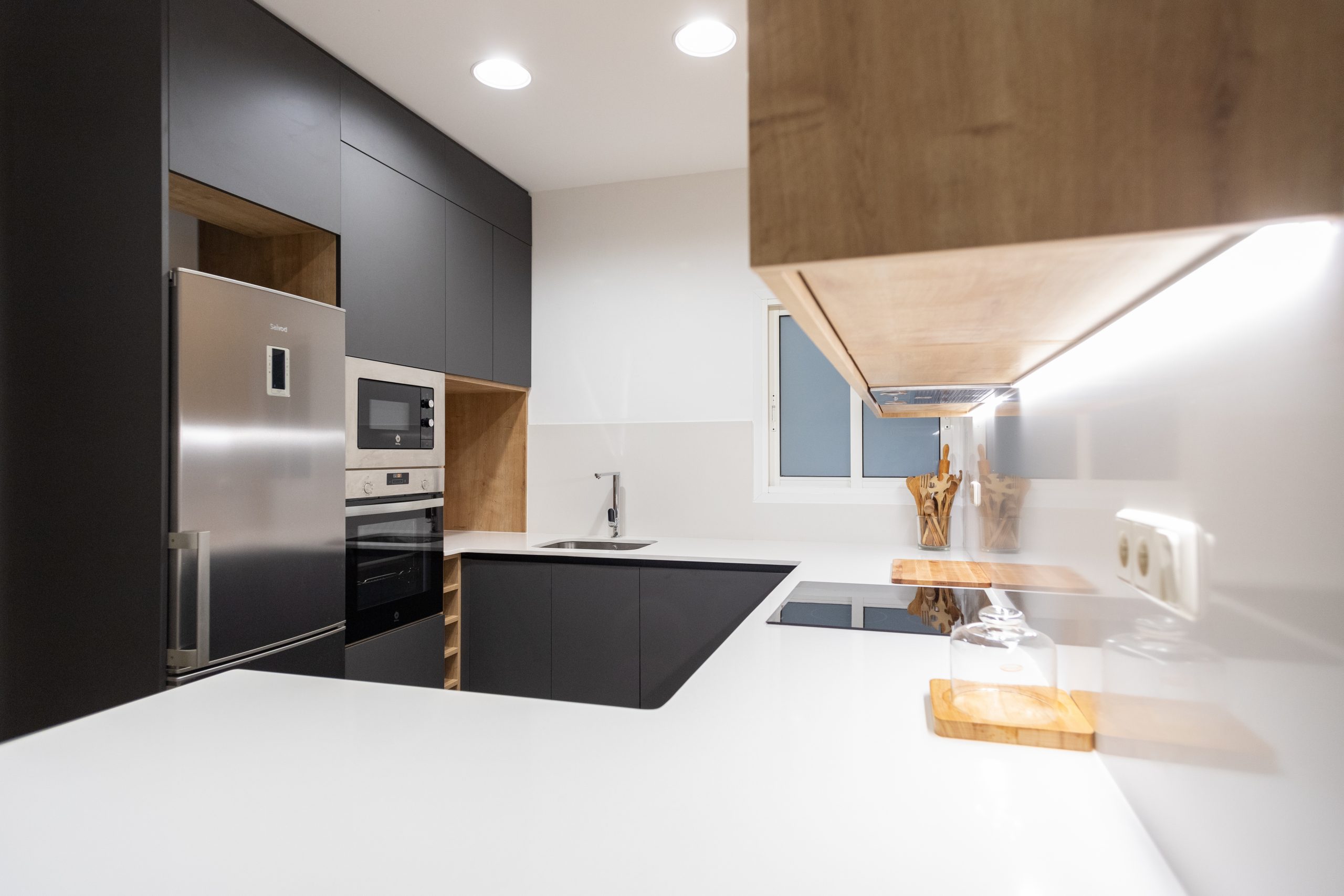Hem aplicat una imatge de cuina moderna. El mobiliari és de color negre i es combina amb acabats de fusta natural. Per la seva banda els taulells són de color blanc i generen molta lluminositat. També ens hem encarregat de col·locar el nou paviment de cuina. Es tracta d’un terra de gres imitació fusta.