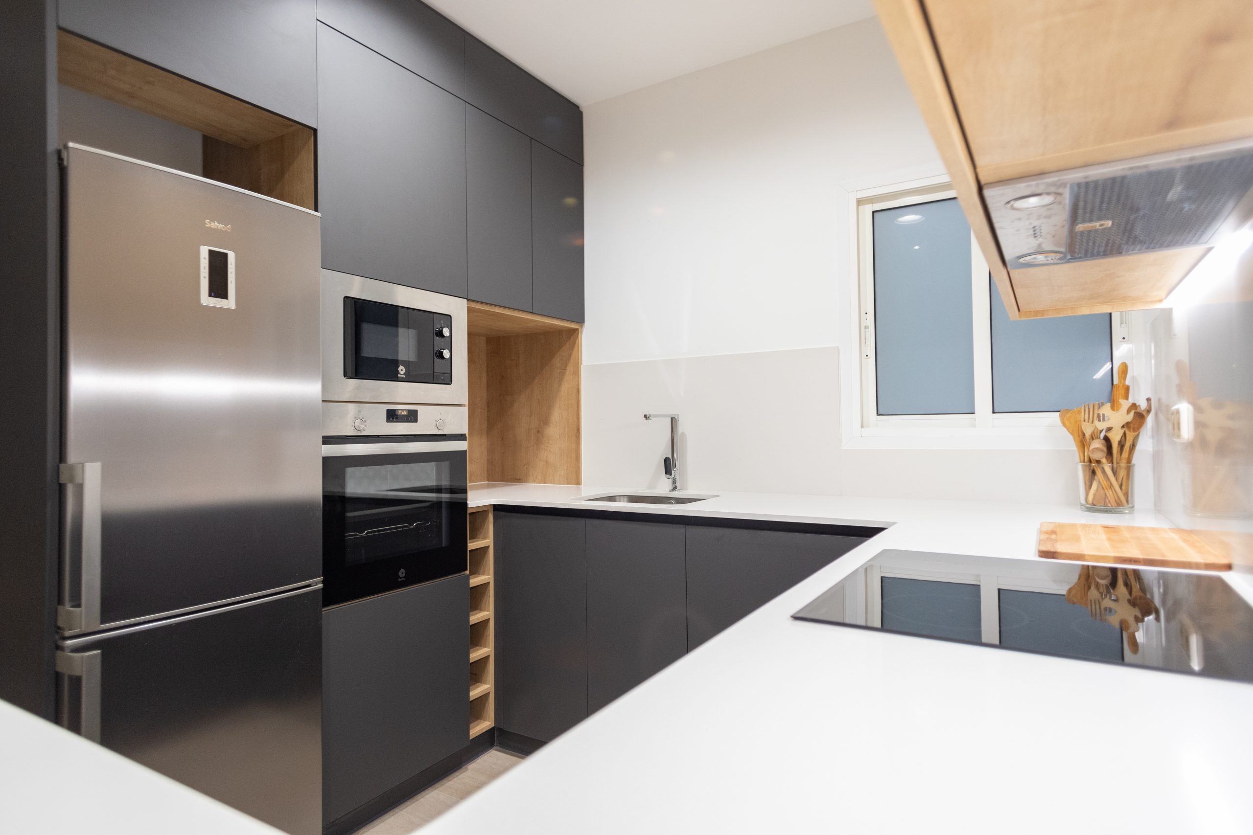 A la banda esquerra s’han col·locat diversos electrodomèstics, tots integrats al moble de cuina. Concretament una nevera, un forn i un microones. A més, hi ha molta capacitat d’emmagatzematge amb diversos calaixos i armaris. El costat dret de la reforma cuina l’ocupa un taulell de cuina en forma d’U.