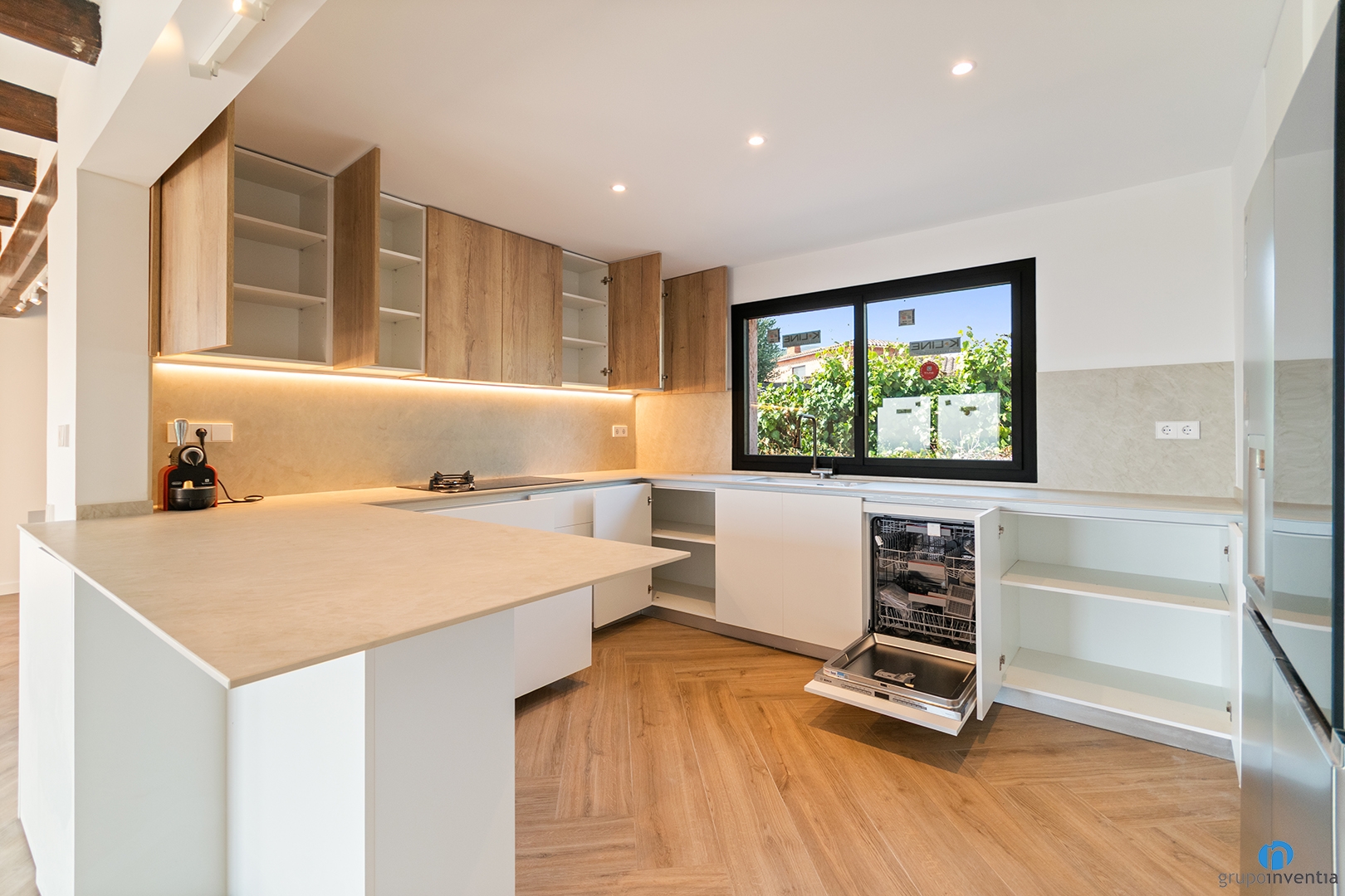 L’equipament és complet i de primera qualitat. Al costat dret s’hi han integrat forn, microones i una nevera de doble porta. També compta amb un rentaplats integrat a la part inferior del moble de cuina, cosa que optimitza l’espai de treball.