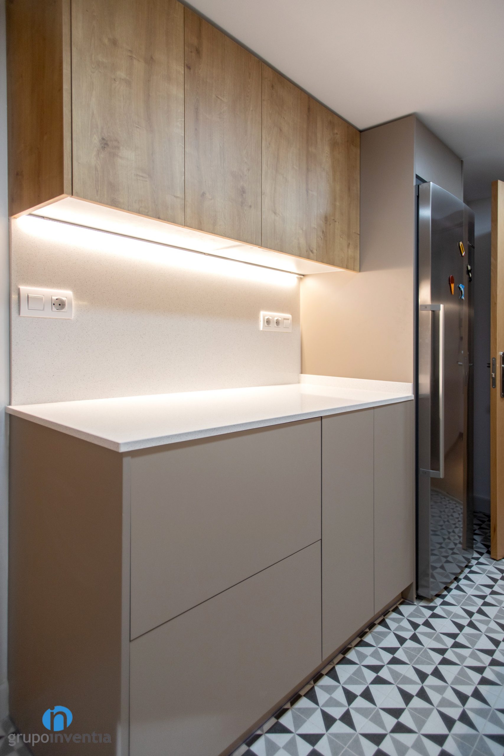 Als costats de l’entrada a la cuina s’han encastat dels nous electrodomèstics. A l’esquerra el forn i el microones i a la dreta la nevera. En aquesta reforma de cuina s’ha optat per electrodomèstics amb acabat en acer inoxidable. Seguidament en cada cas neix un taulell que arriba fins a l’altre extrem de l’estada.