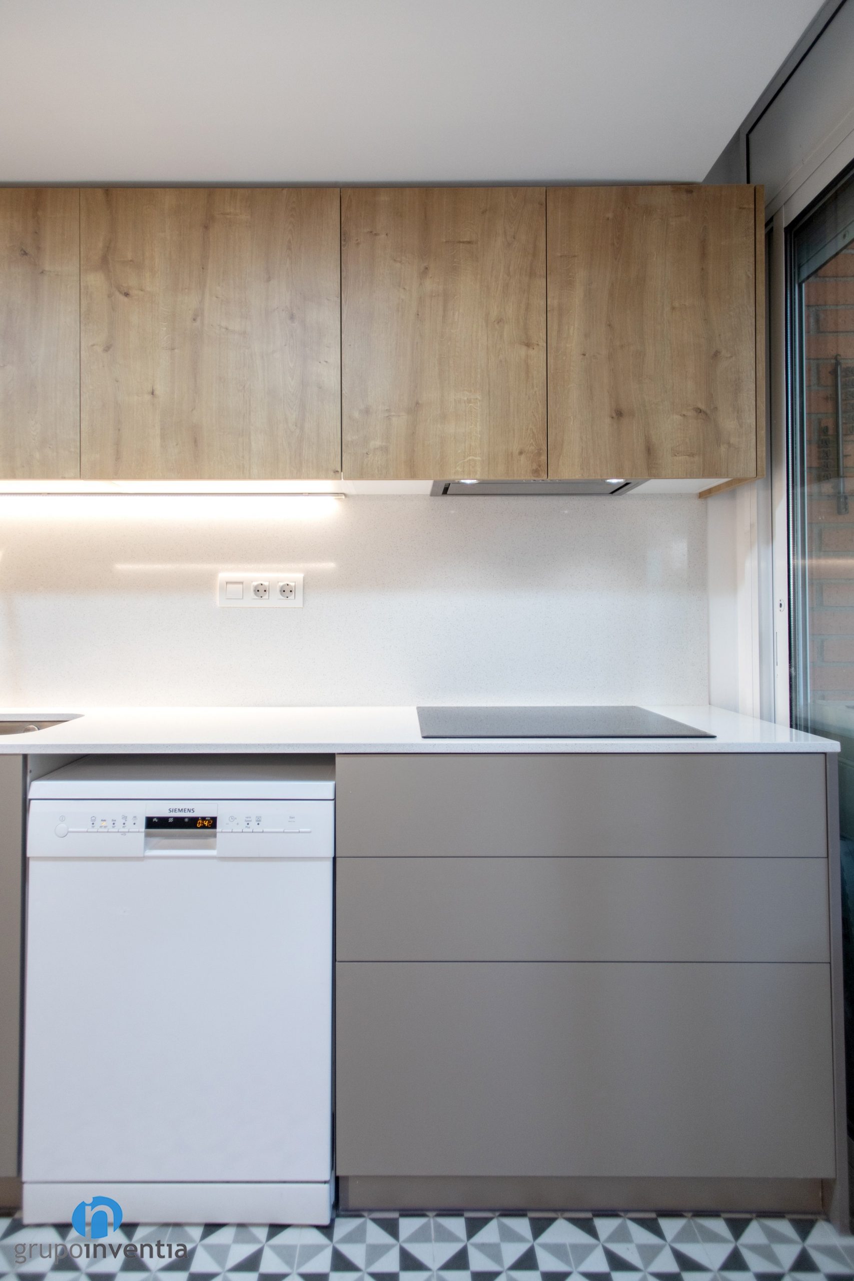 Sobre el taulell de la banda esquerra s’han col·locat una pica doble i una placa vitroceràmica. Per la seva banda el taulell de la banda dreta funciona com a superfície de suport i de treball. En tots dos fronts d’aquesta reforma de cuina també hi ha espai per a diversos calaixos i armaris. Així s’aconsegueix una capacitat d’emmagatzematge excel·lent.