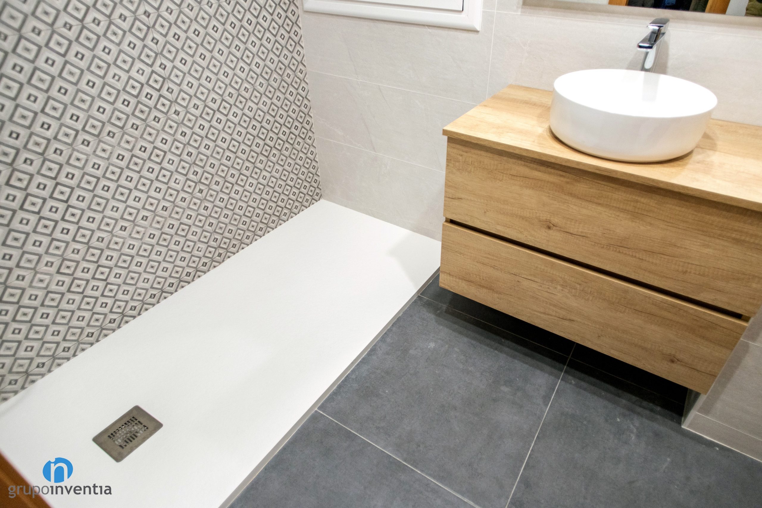 La majoria de parets s’han enrajolat completament amb rajoles de color beige. Queda una estança molt lluminosa. Per a la paret de la dutxa s’ha optat per unes rajoles de tons beige i gris amb dibuixos en rombe. Aquesta zona aporta color i dinamisme a l’estança i combina perfectament amb el terra de gres de color gris col·locat.