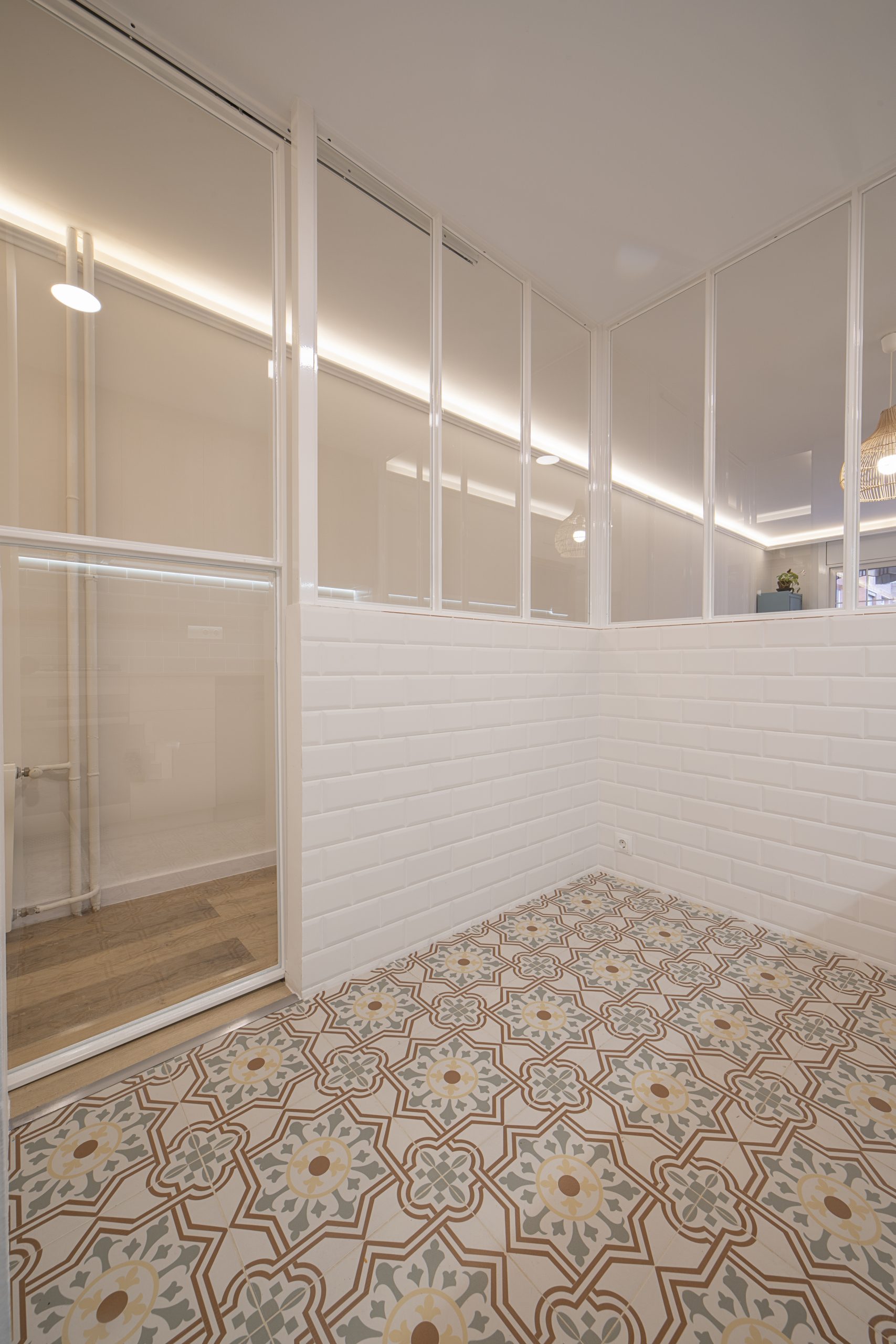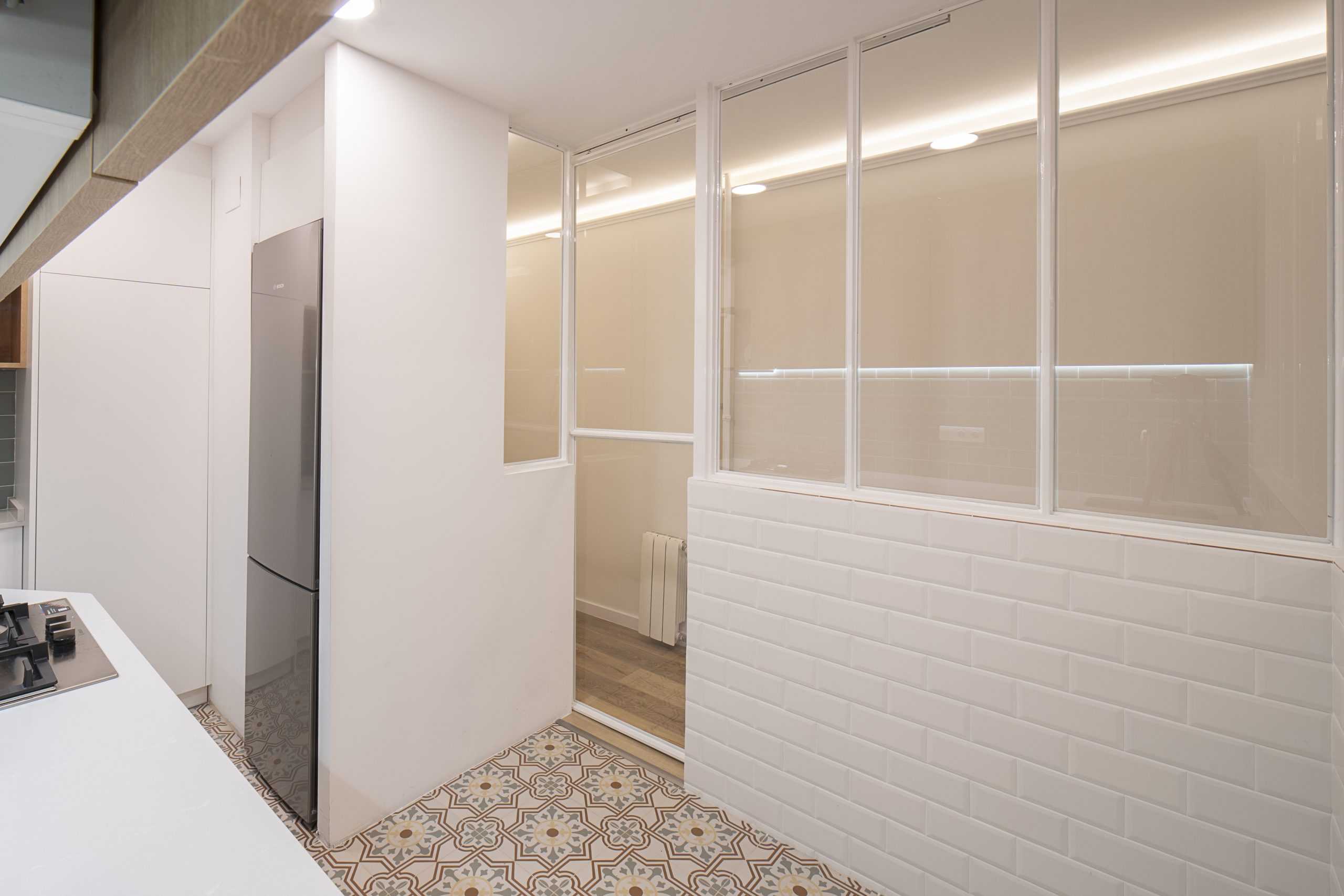 Es tracta d´una cuina que ocupa el seu propi espai i que s´ha separat amb uns tancaments de vidre. Hi ha paret fins a mitja alçada ia partir d’aquí hem col·locat uns vidres. La porta d’accés és xai i totalment de vidre. D’aquesta manera, la cuina queda connectada visualment amb la resta de l’habitatge.