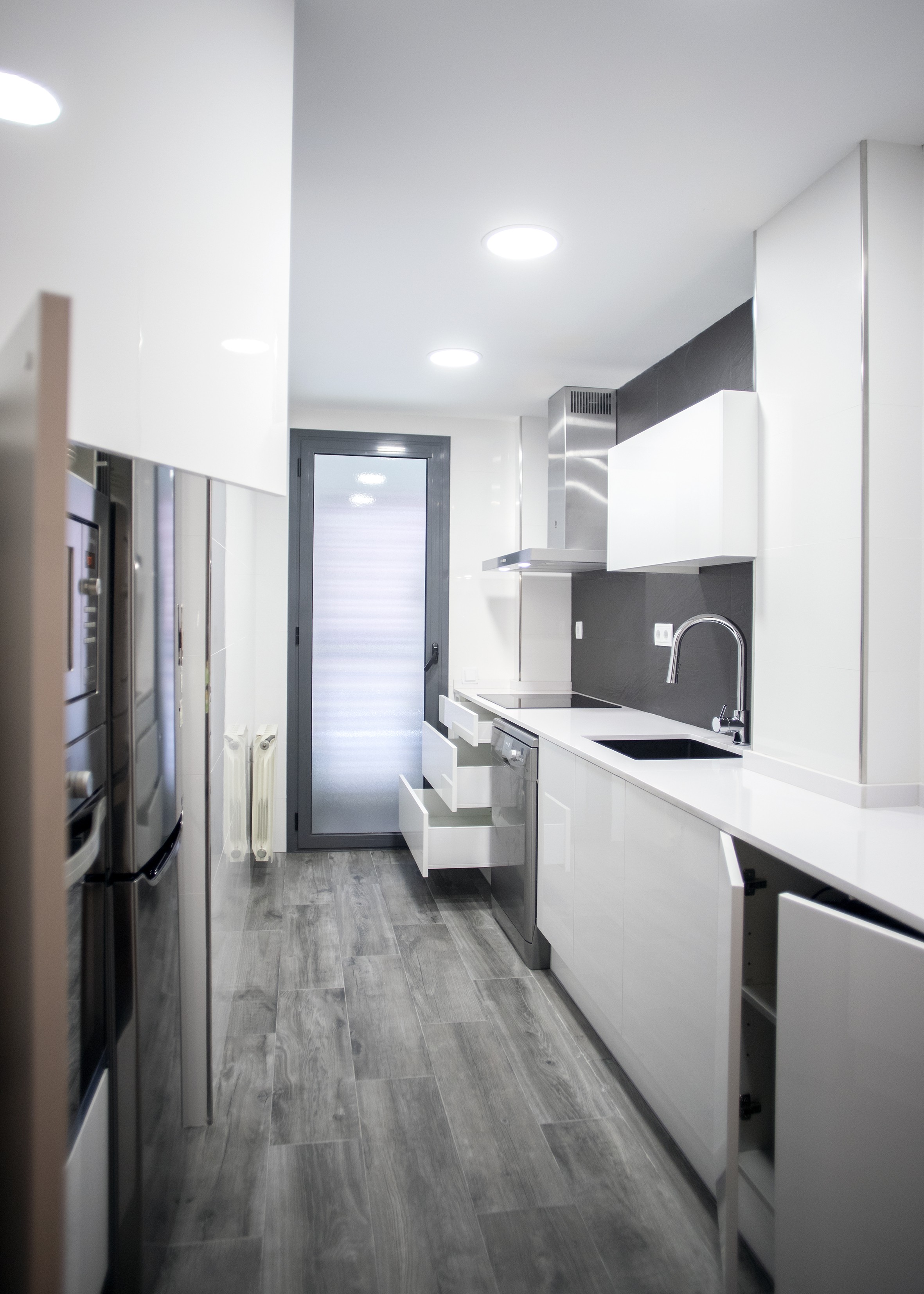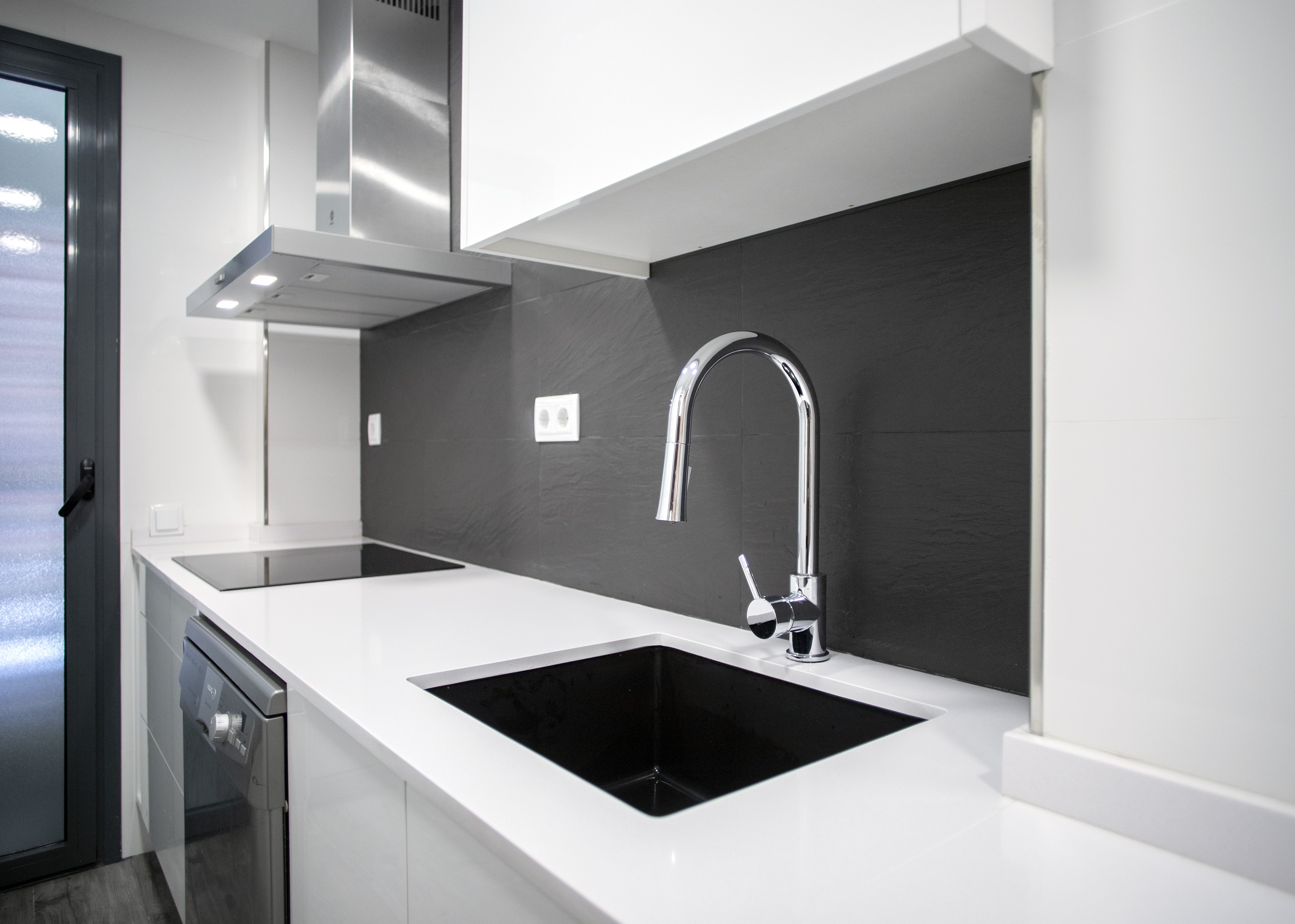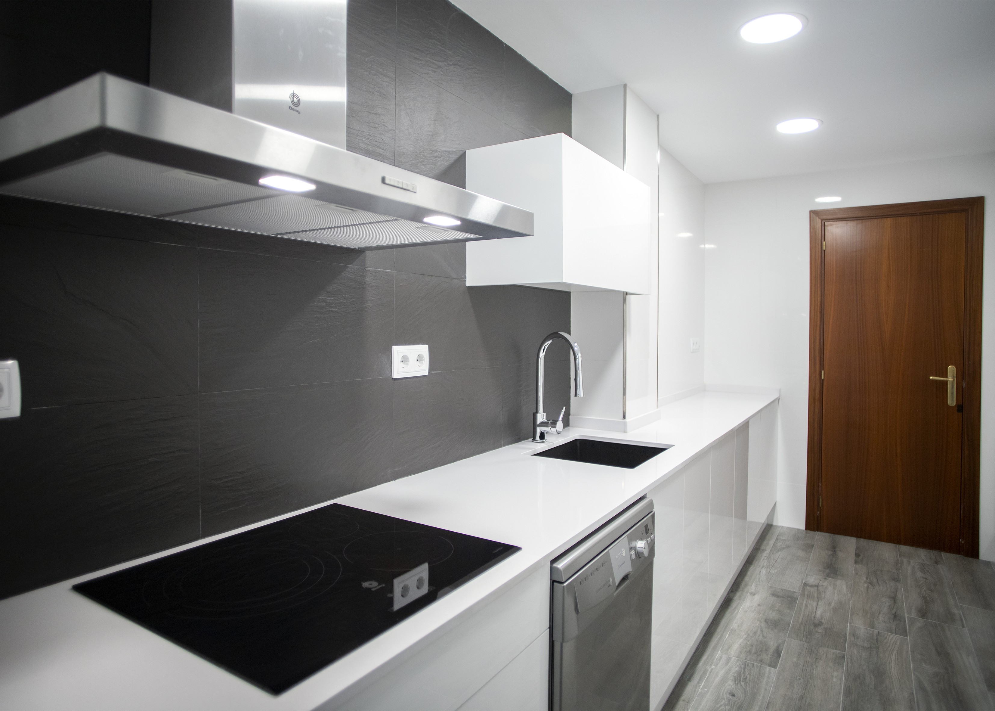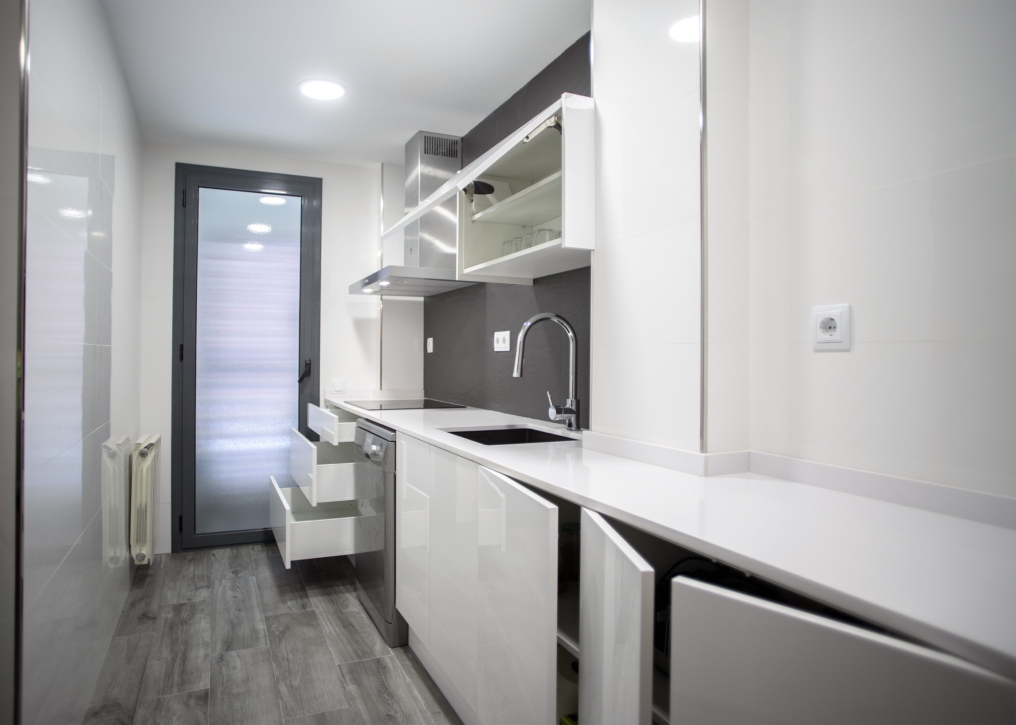 Aquesta part de la cuina també ofereix una àmplia capacitat d’emmagatzematge, ja que compta amb armaris i calaixos tant en la part superior com inferior, on també es encastró el rentaplats, del taulell de cuina.