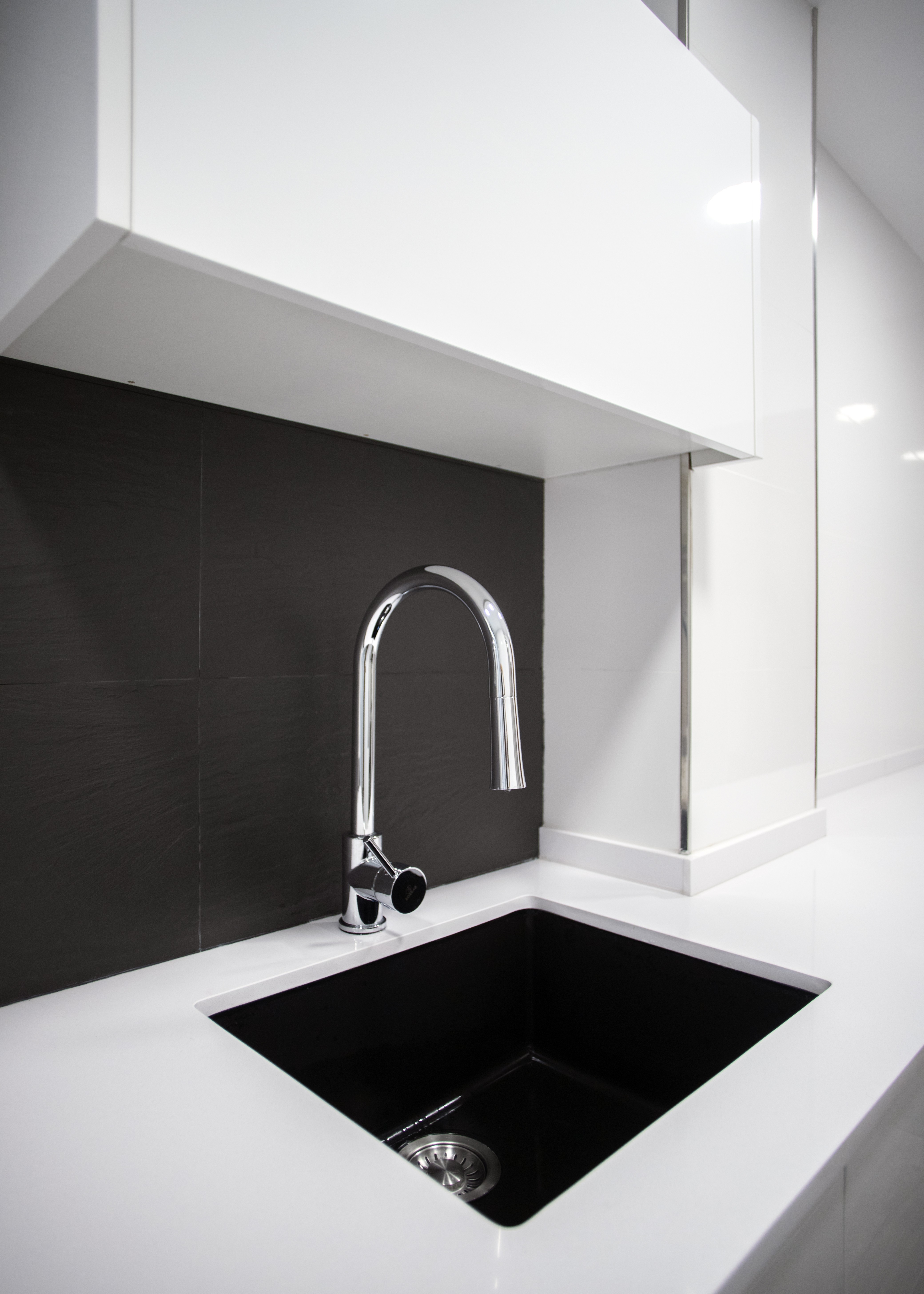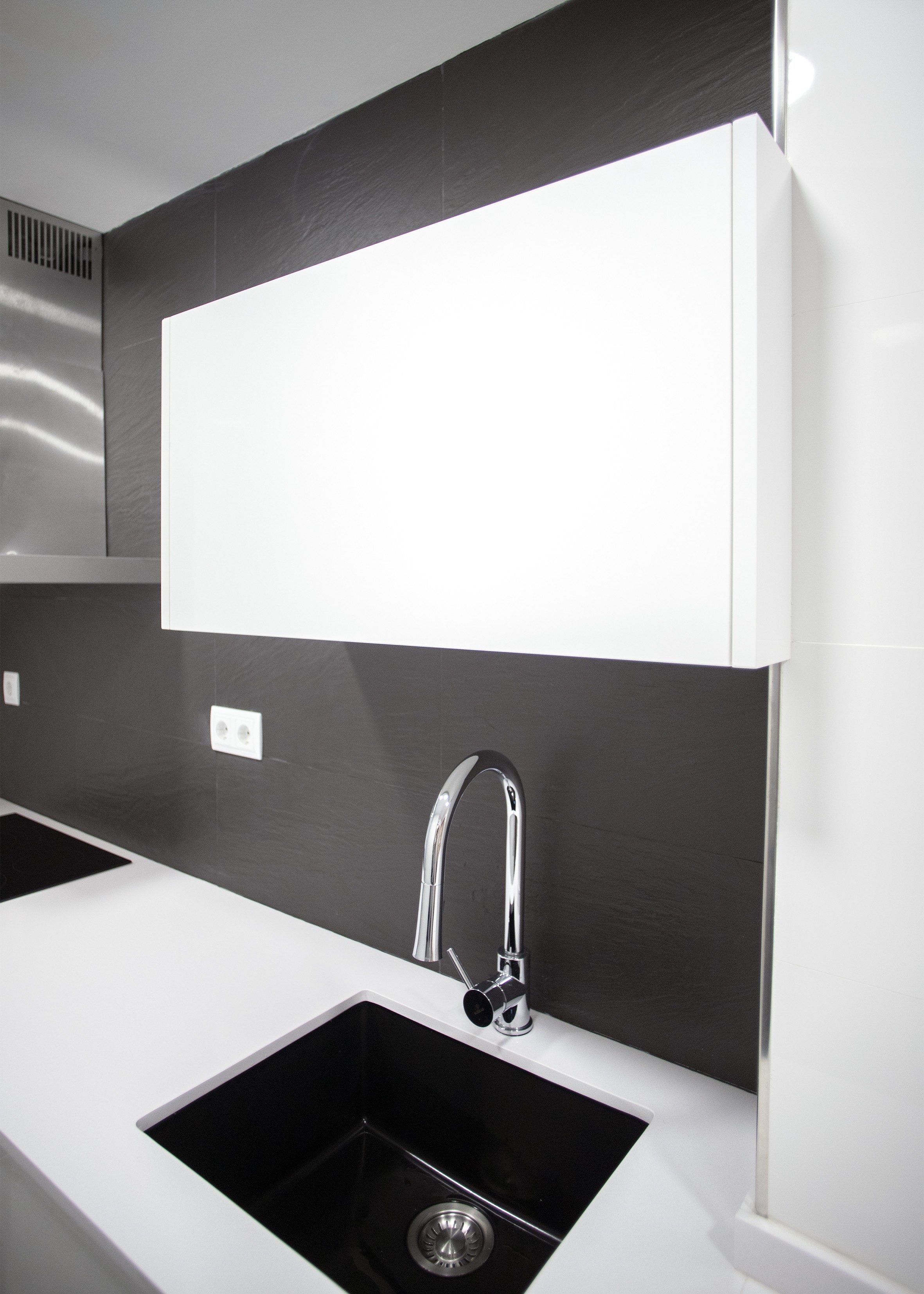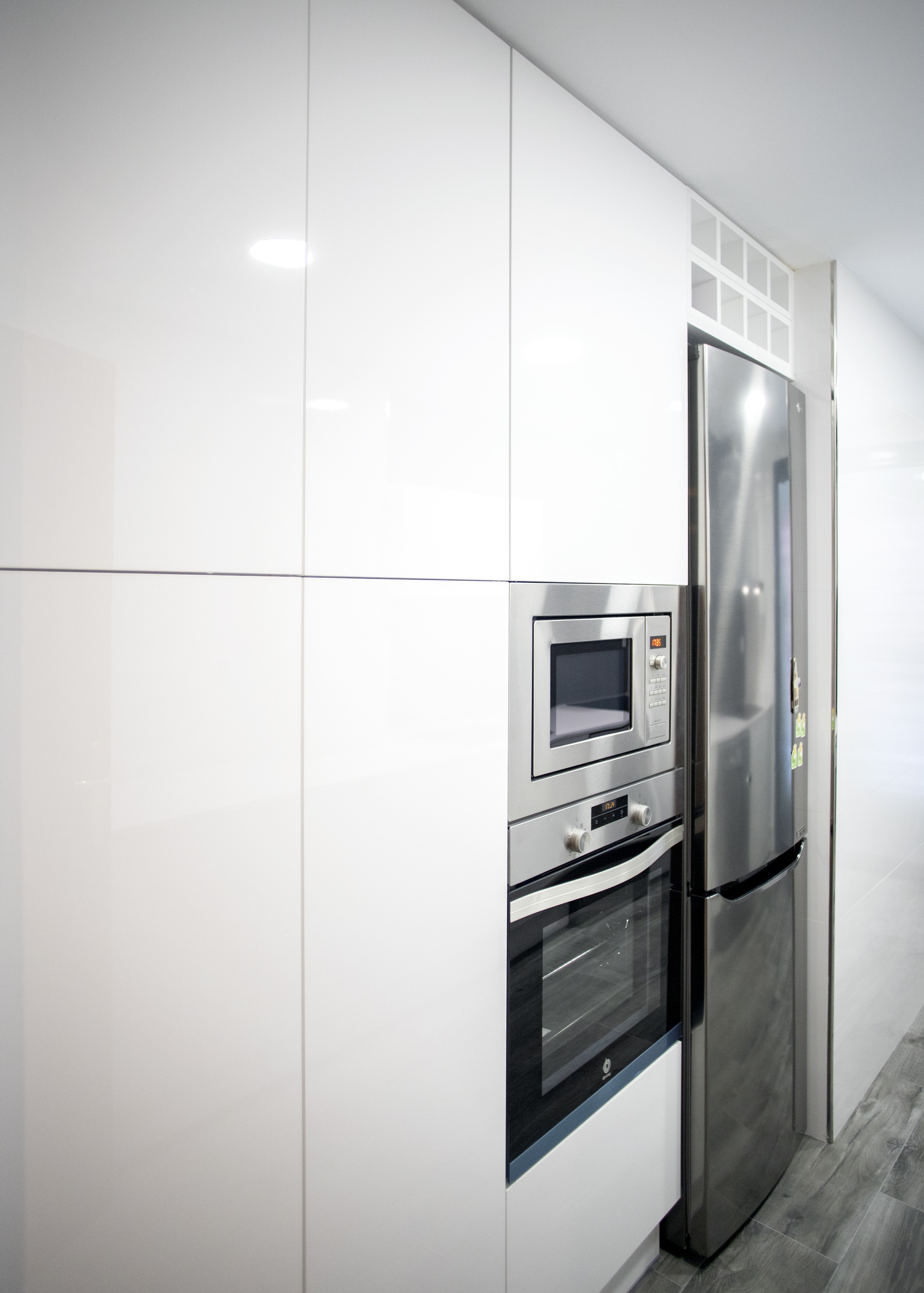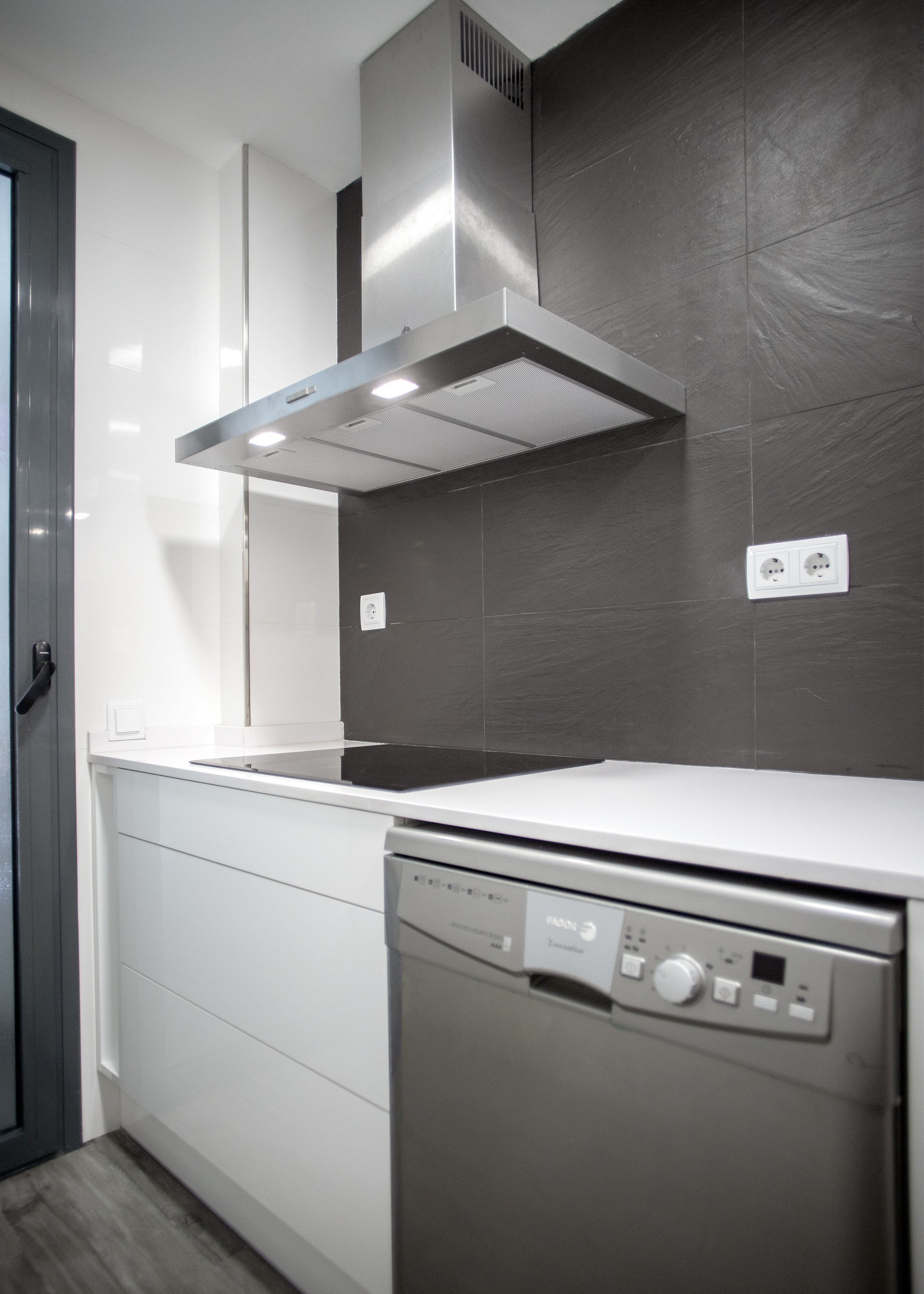 Aquesta part de la cuina també ofereix una àmplia capacitat d’emmagatzematge, ja que compta amb armaris i calaixos tant en la part superior com inferior, on també es encastró el rentaplats, del taulell de cuina.