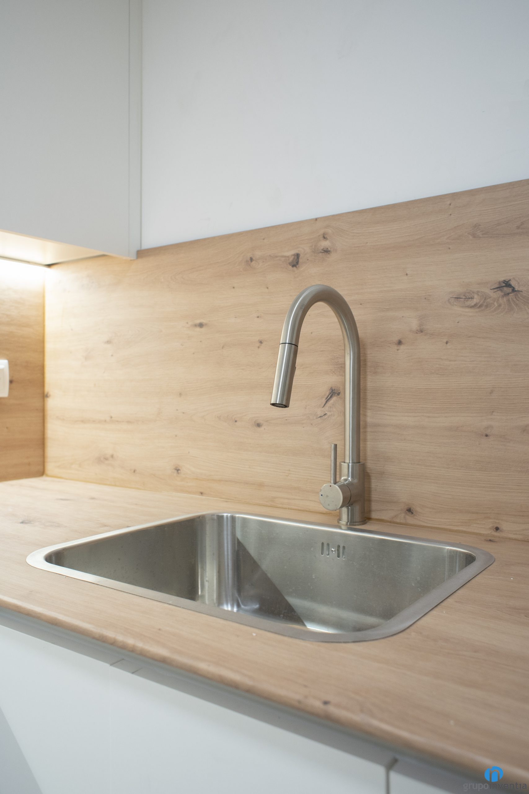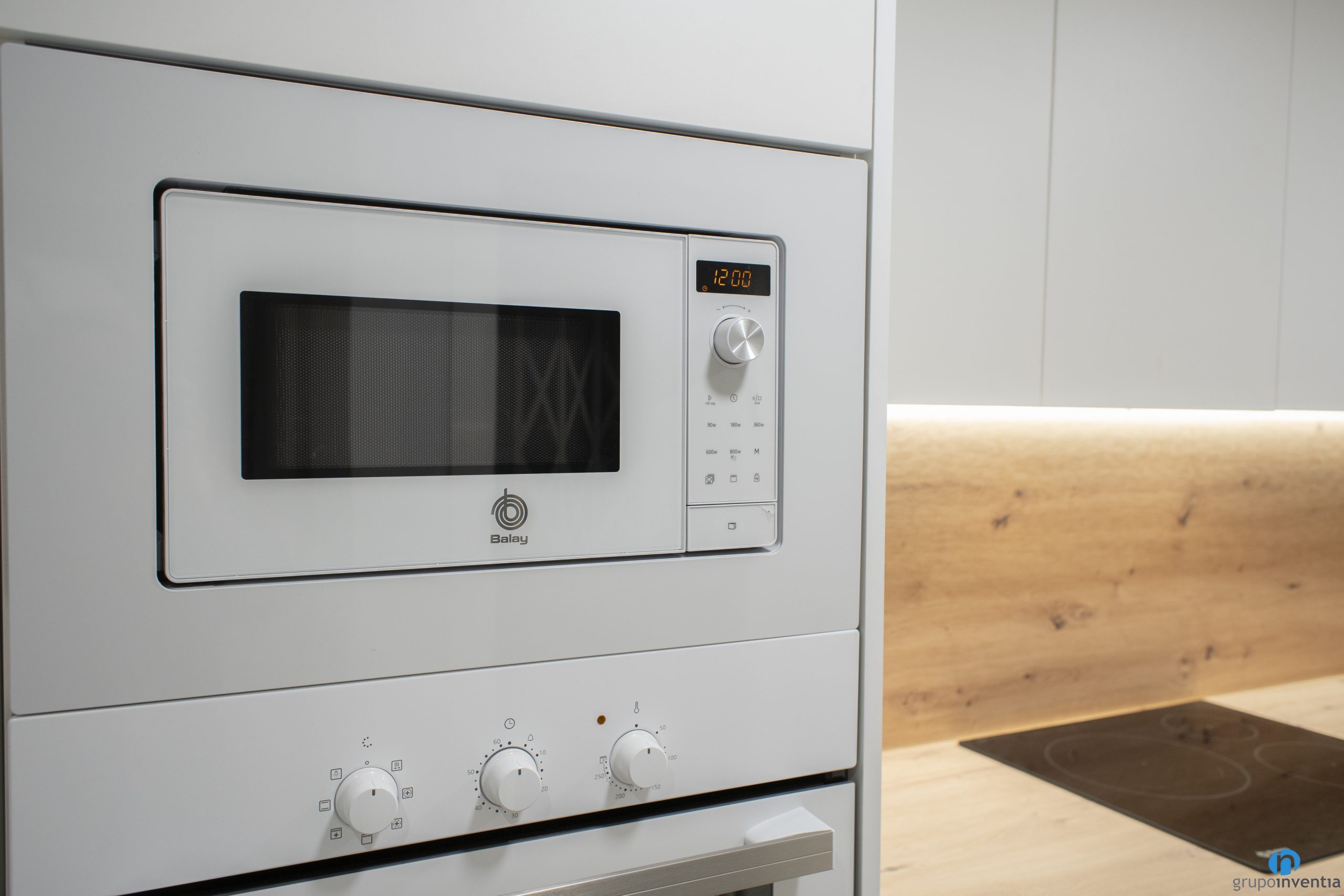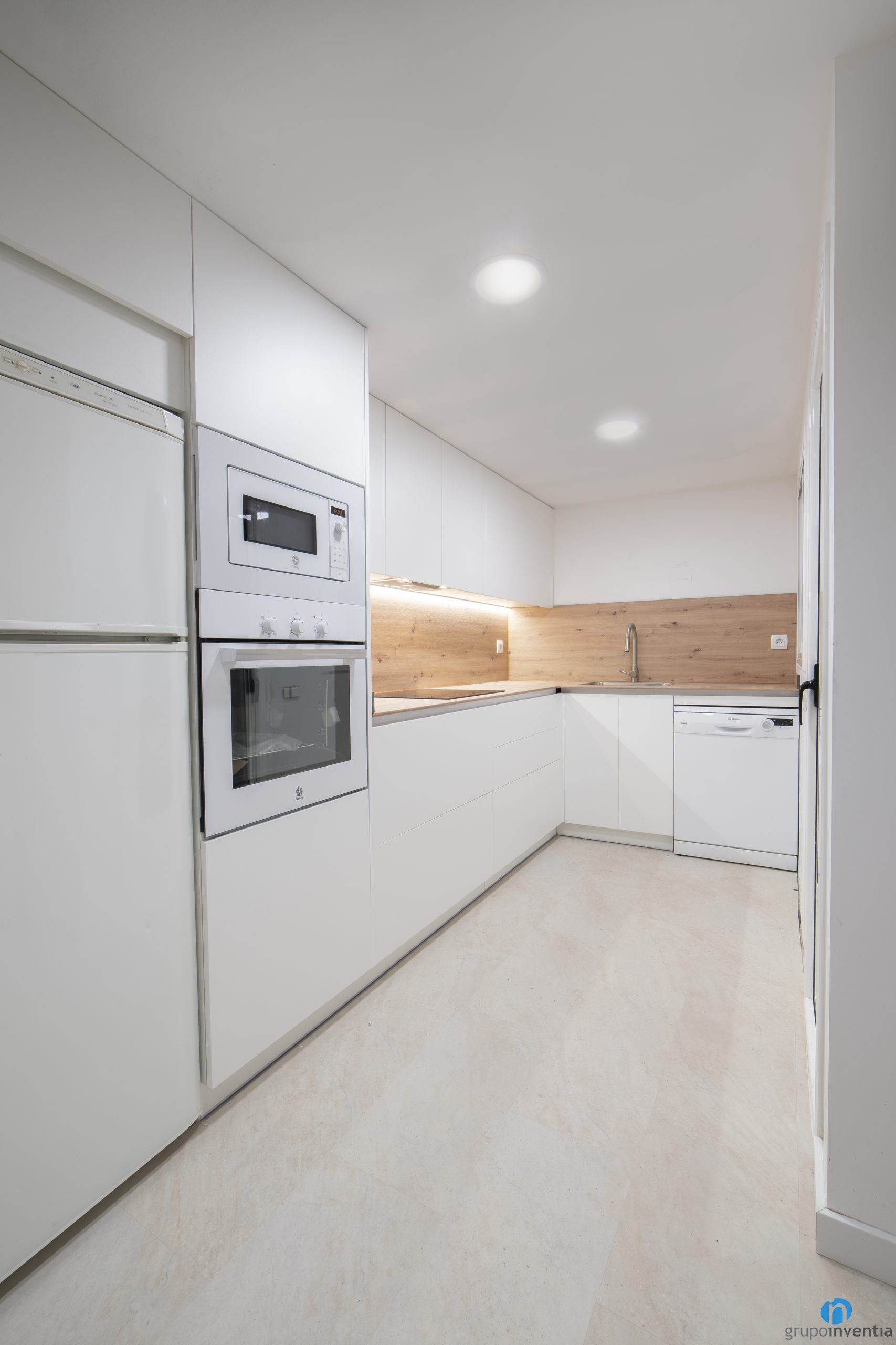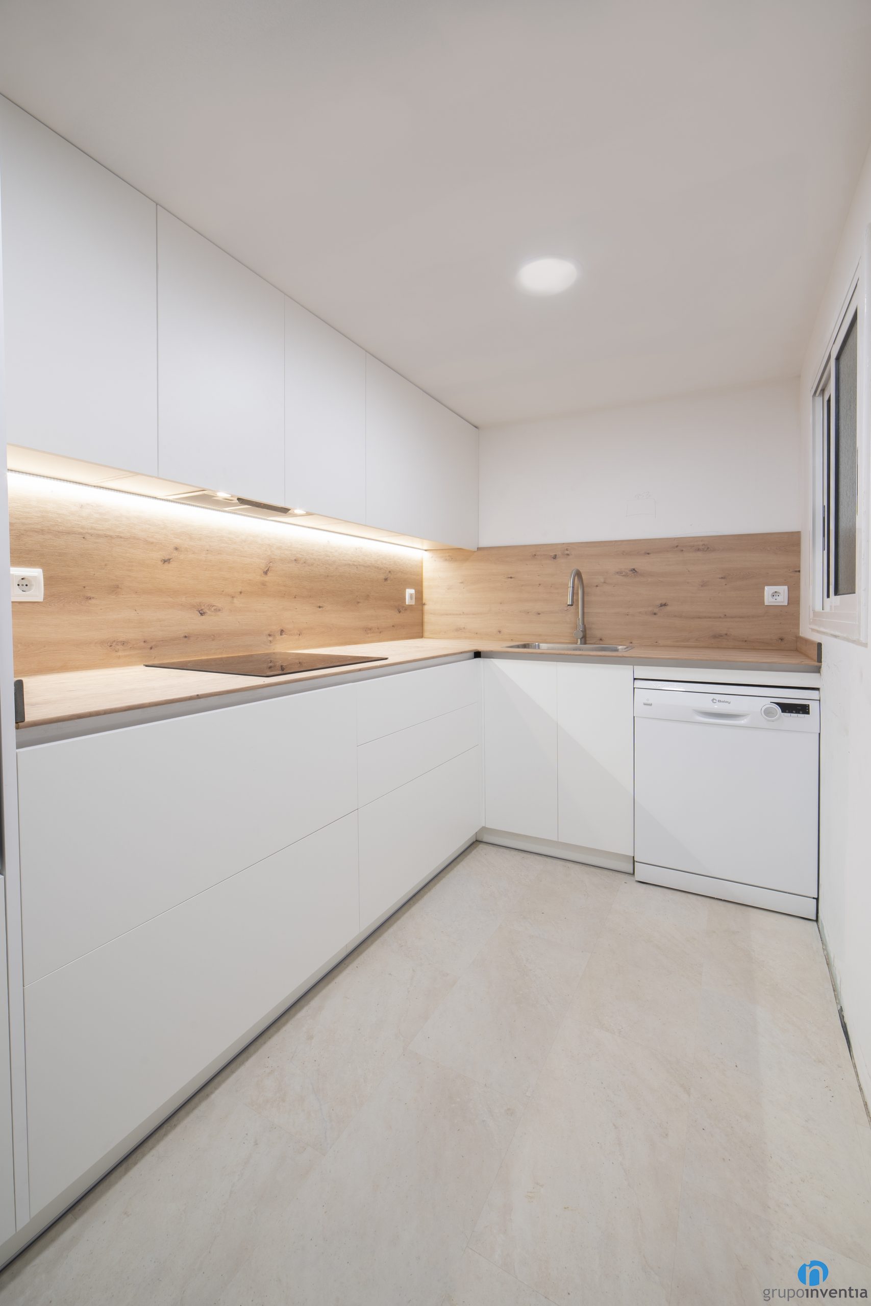 Hem col·locat llums d’ull de bou que il·luminen perfectament tota l’estada i també llum indirecta sota els armaris superiors. D’aquesta manera es pot il·luminar tot el taulell sense necessitat d’obrir la llum general. El moble de cuina blanc es combina amb uns taulells d´acabat en fusta molt ben integrat. Per al paviment hem col·locat un terra ceràmic de color beix.
