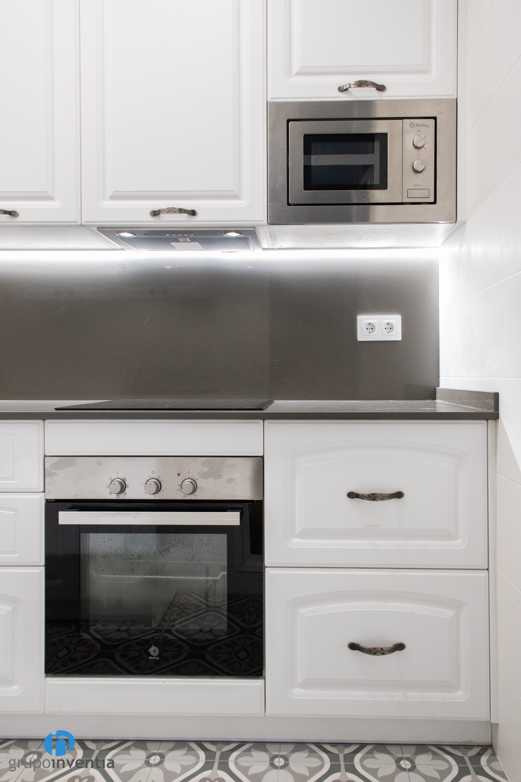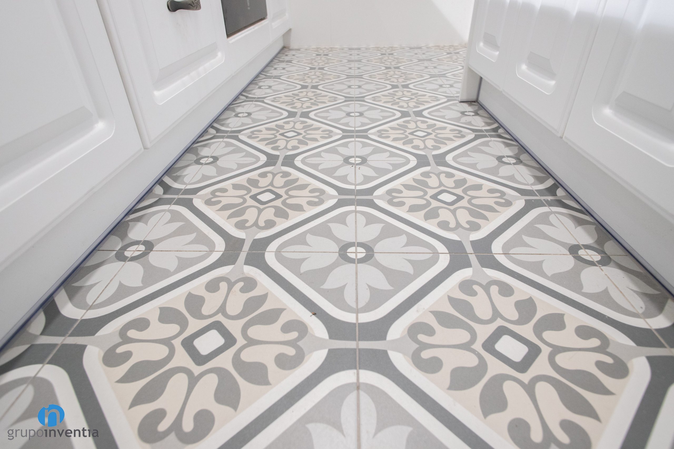 Les parets també s’han enrajolat amb rajoles de color blanc, potenciant encara més la lluminositat i amplitud visual. Es combina amb unes taulells grisos. En aquesta cuina també s’ha canviat el paviment. Ara disposa d’un terra tipus hidràulic amb un dibuix en color gris i blanc. Visualment és tot un encert, a més de tractar-se d’un material resistent i ideal per a la cuina.