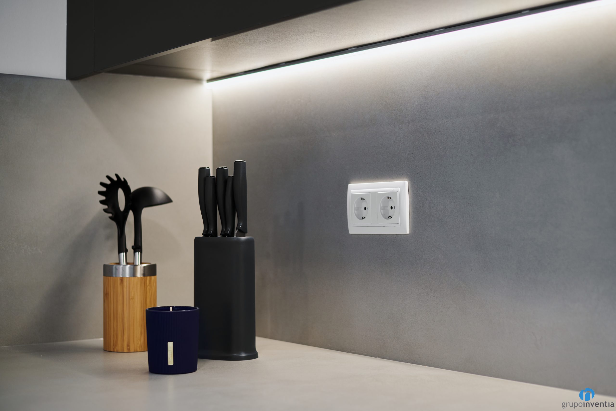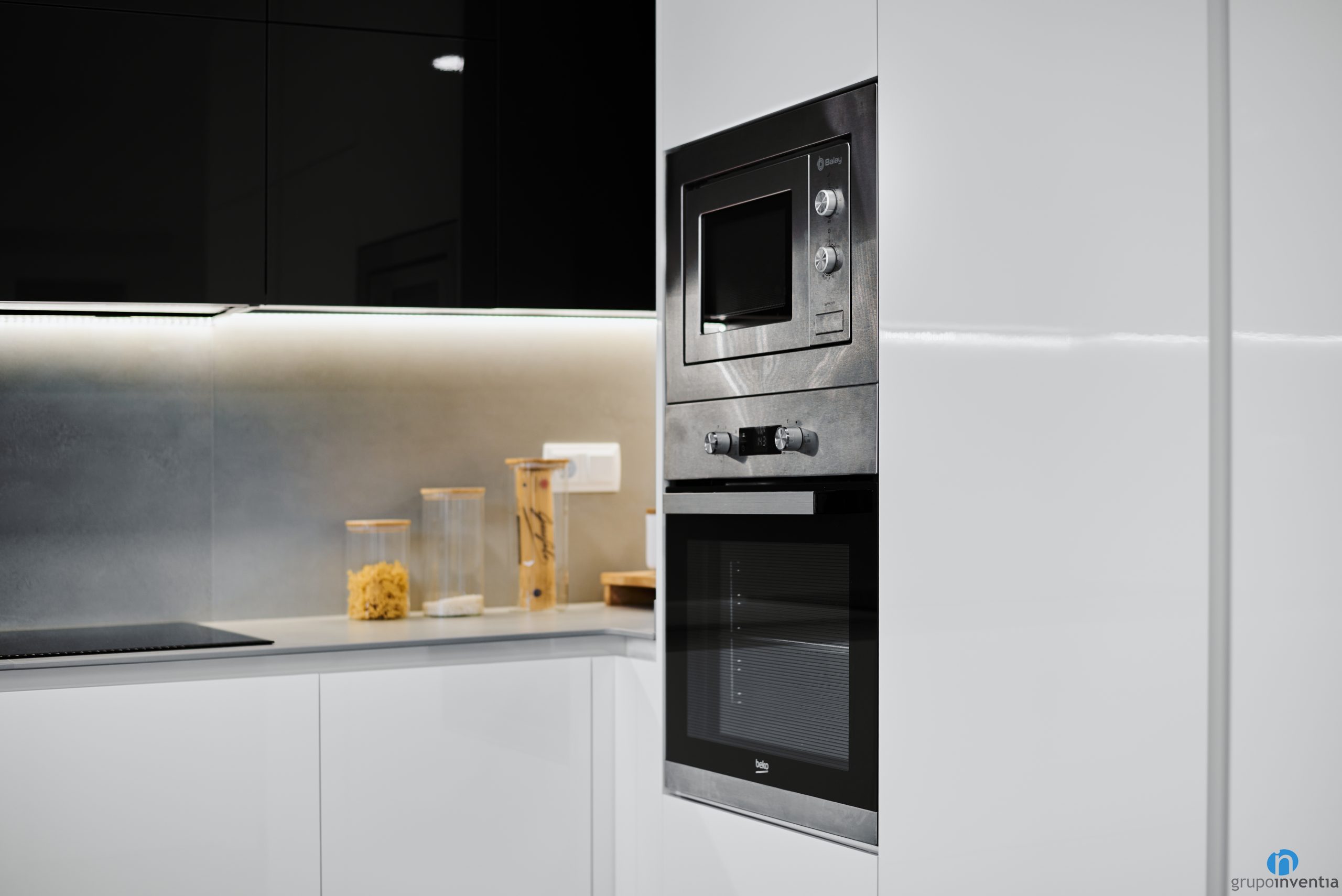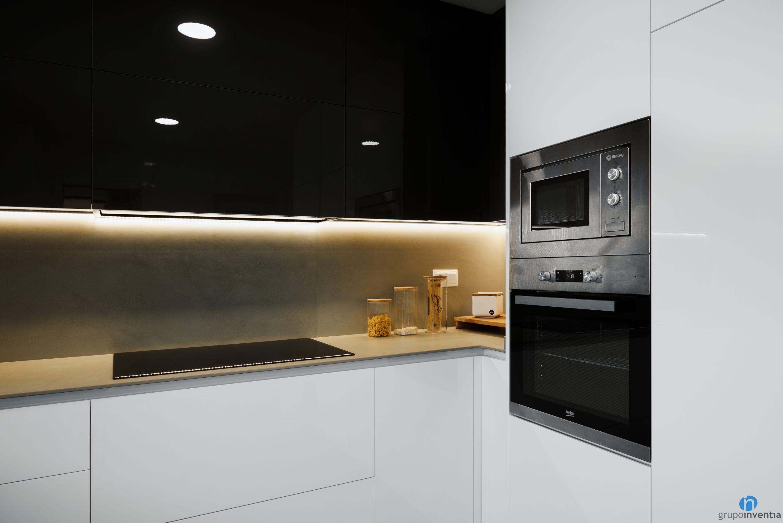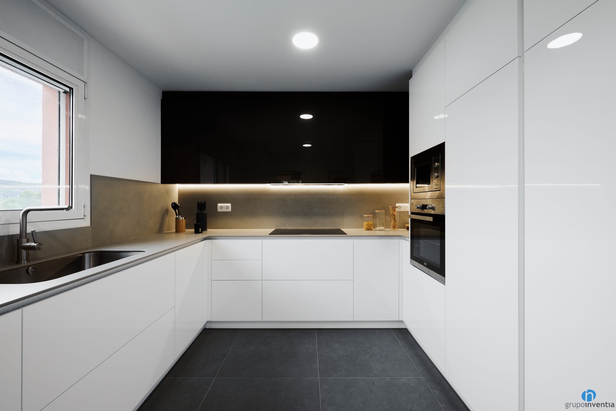 En aquesta ocasió hem apostat per una cuina de disseny modern amb tons neutres. La part inferior del moble de cuina és de color blanc i els armaris superiors són negres. És una combinació molt agradable i que és una tendència en les reformes de cuines. Aquests dos colors es combinen amb unes encimeres de color gris.