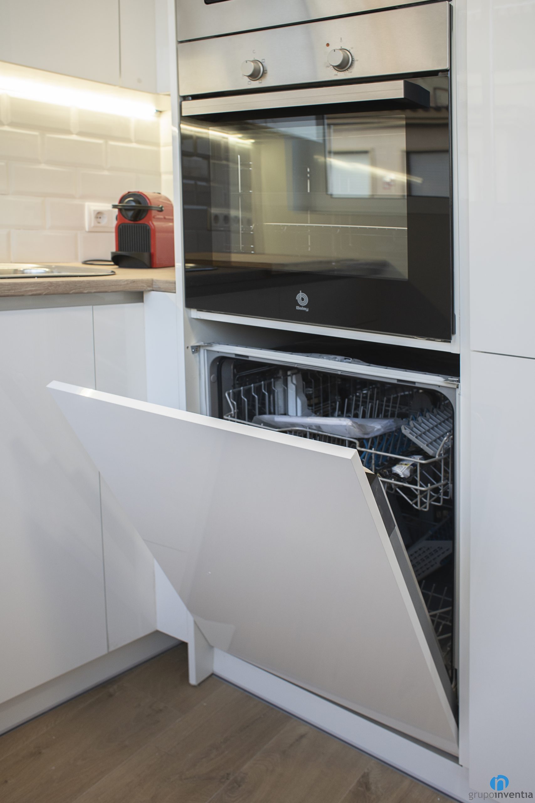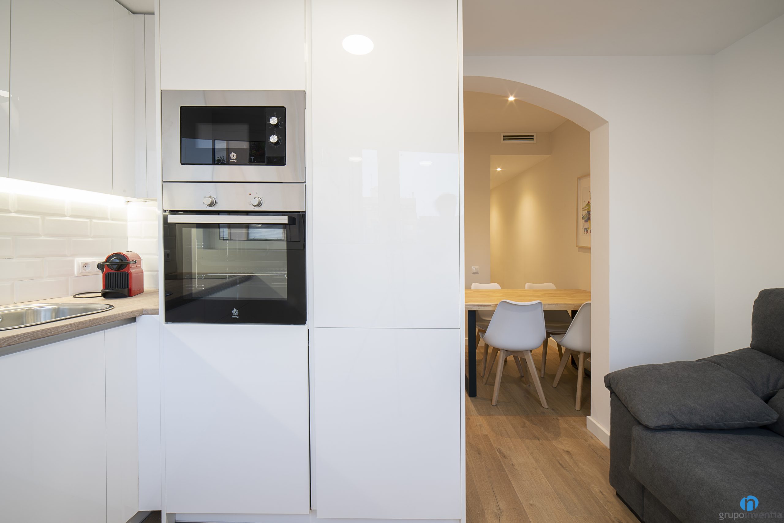 A la part dreta s’ubiquen els electrodomèstics, tots ells integrats al mateix moble de cuina. Es compon d´una nevera, un forn, un microones i un rentaplats. La nevera queda camuflada per les portes de l’armari, generant una imatge homogènia de cuina i de disseny modern.