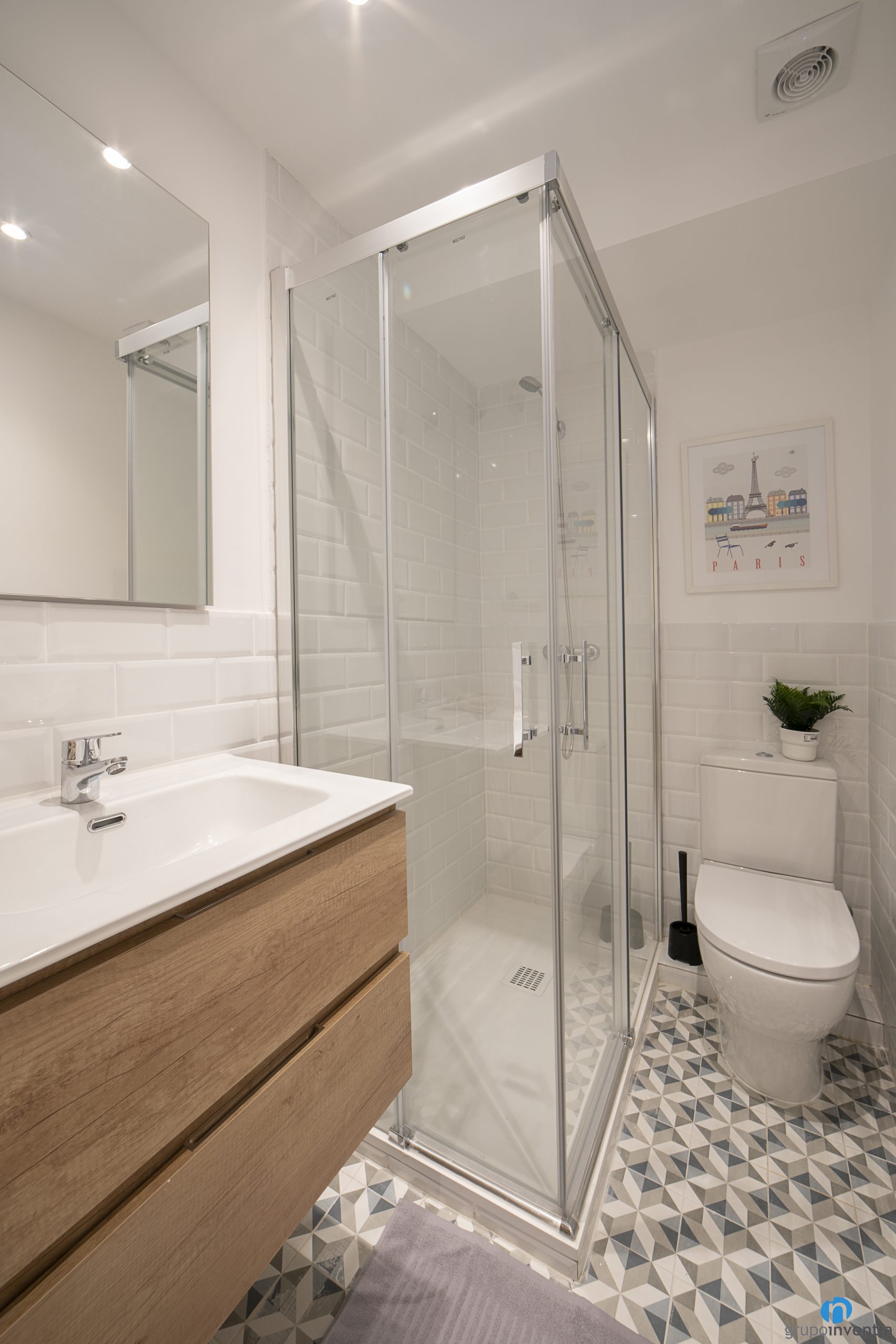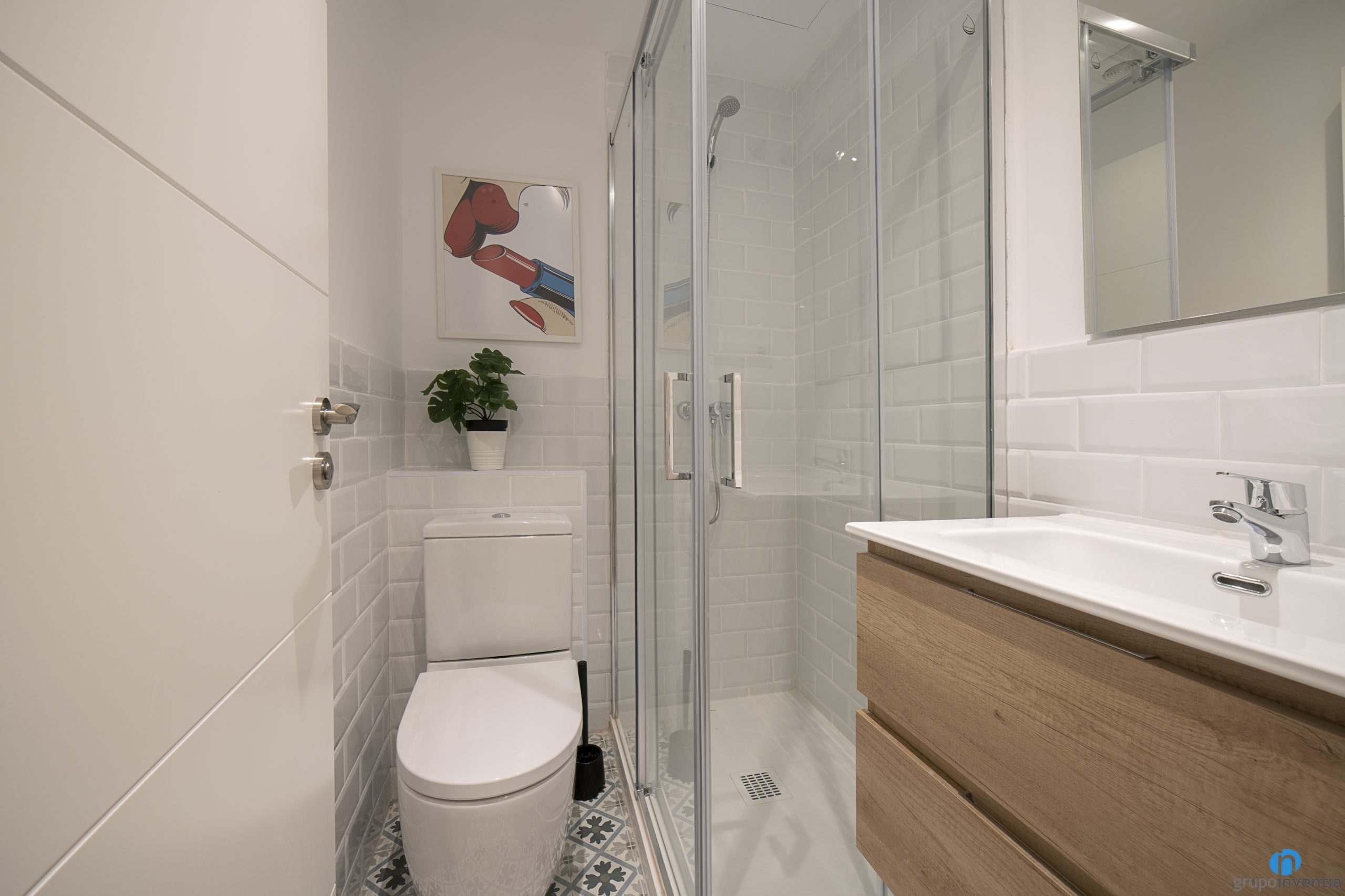 Pel que fa al disseny de banys s’ha fet servir el mateix en tots dos. Una imatge contemporània per aconseguir uns banys lluminosos. Per això hem enrajolat les parets amb rajoles bisellades blanques i hem col·locat un terra tipus hidràulic. El resultat ha estat el de dos espais de neteja amb un ambient fresc i imatge moderna.