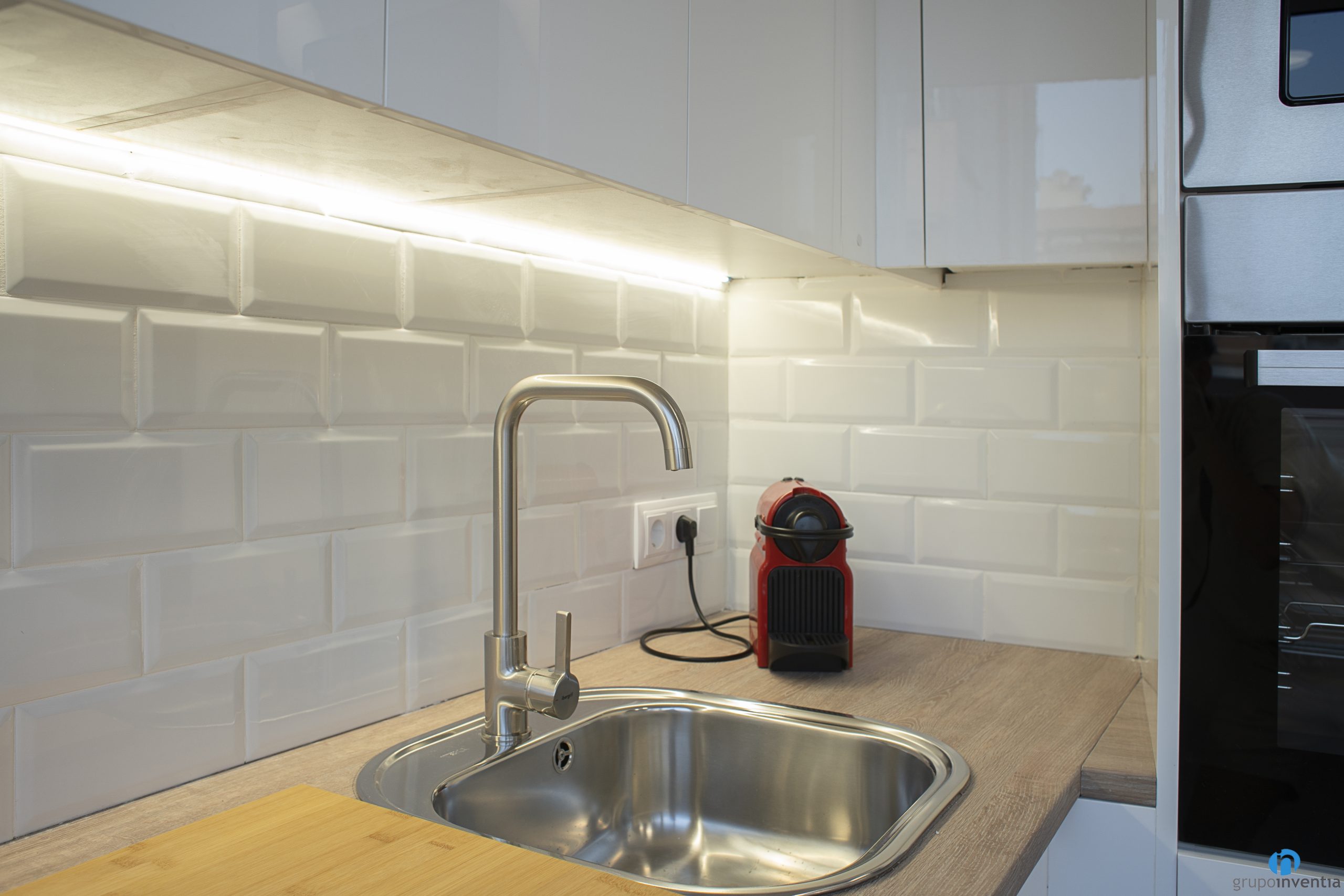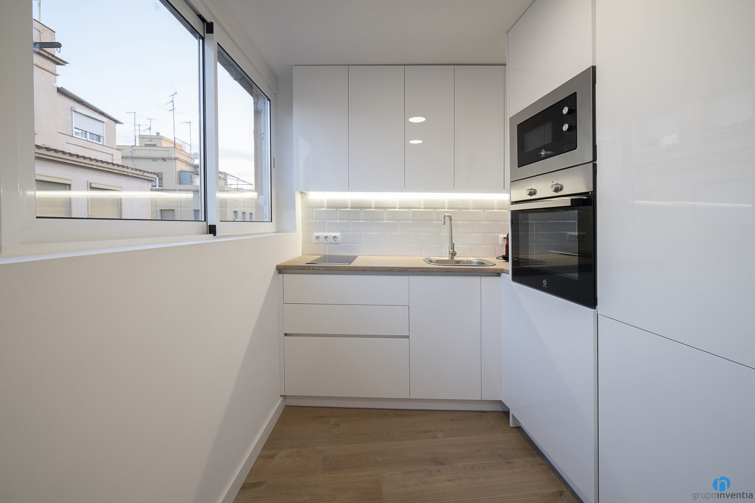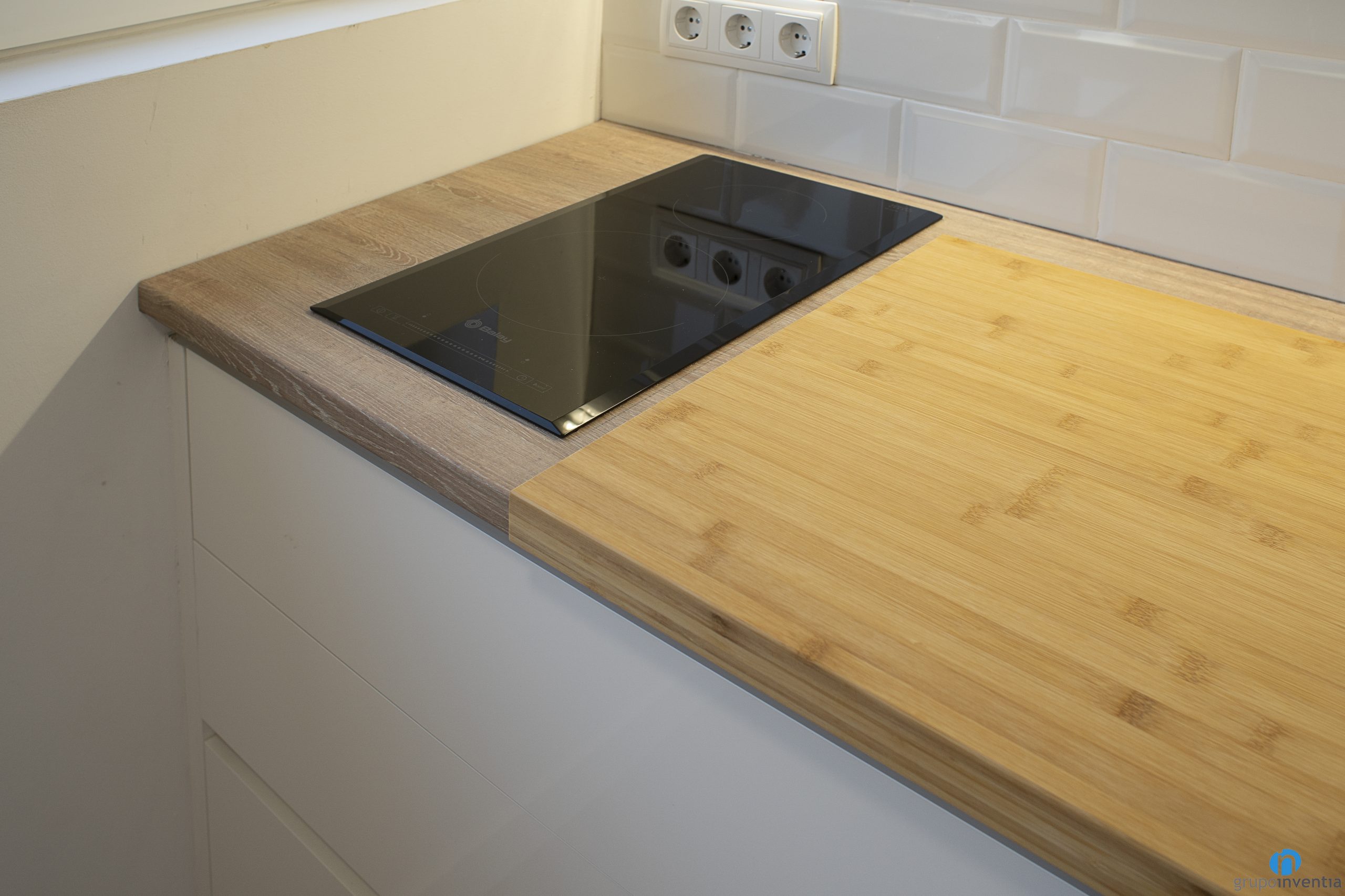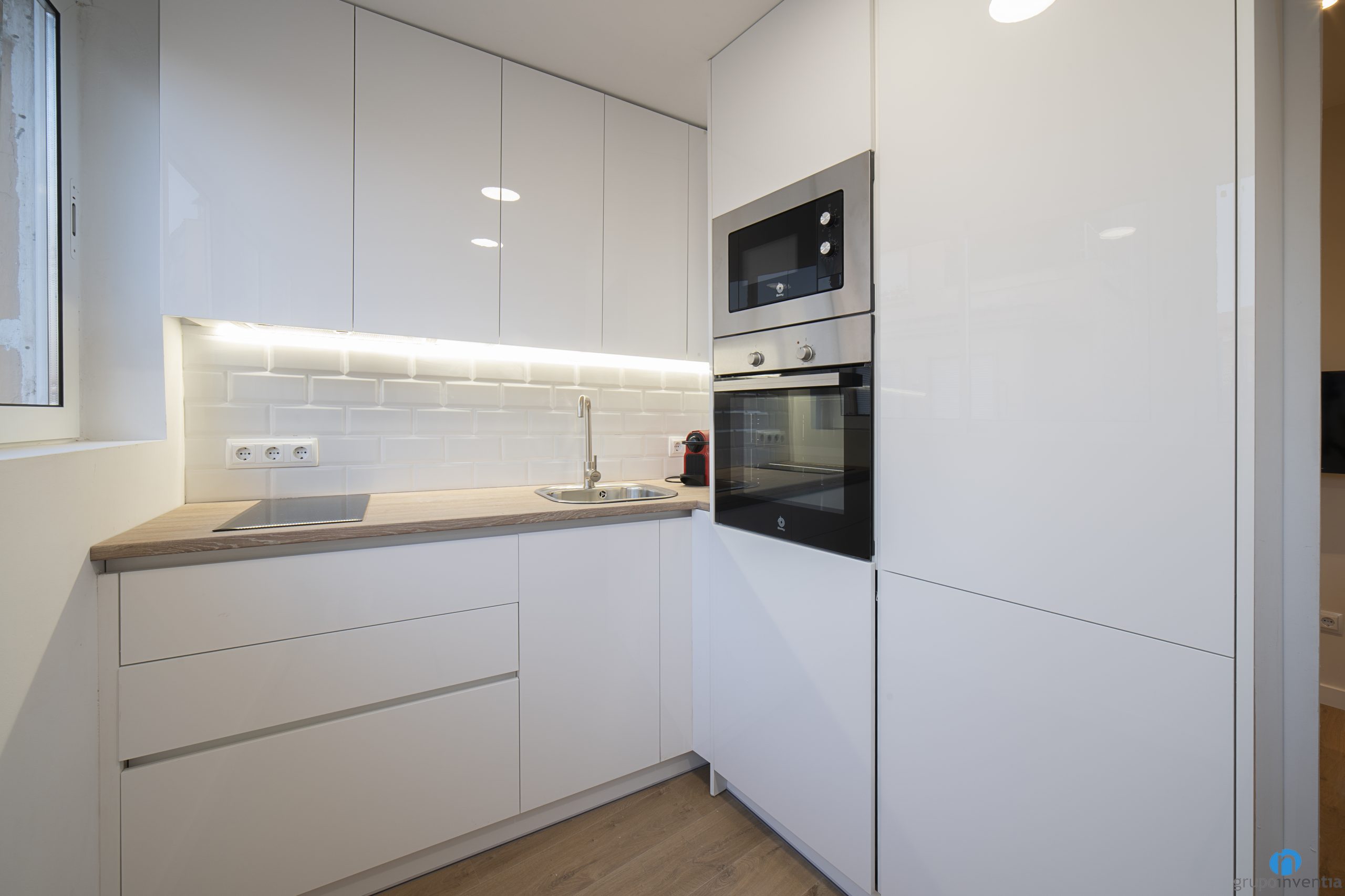 La part central l’ocupa un taulell de cuina que disposa d’una pica d’un sinus i d’una placa vitroceràmica. També amb calaixos i armaris per a l’emmagatzematge tant a la part inferior com a superior. Tot això amb un disseny actual amb un moble de cuina blanc i uns taulells d’acabat de fusta.