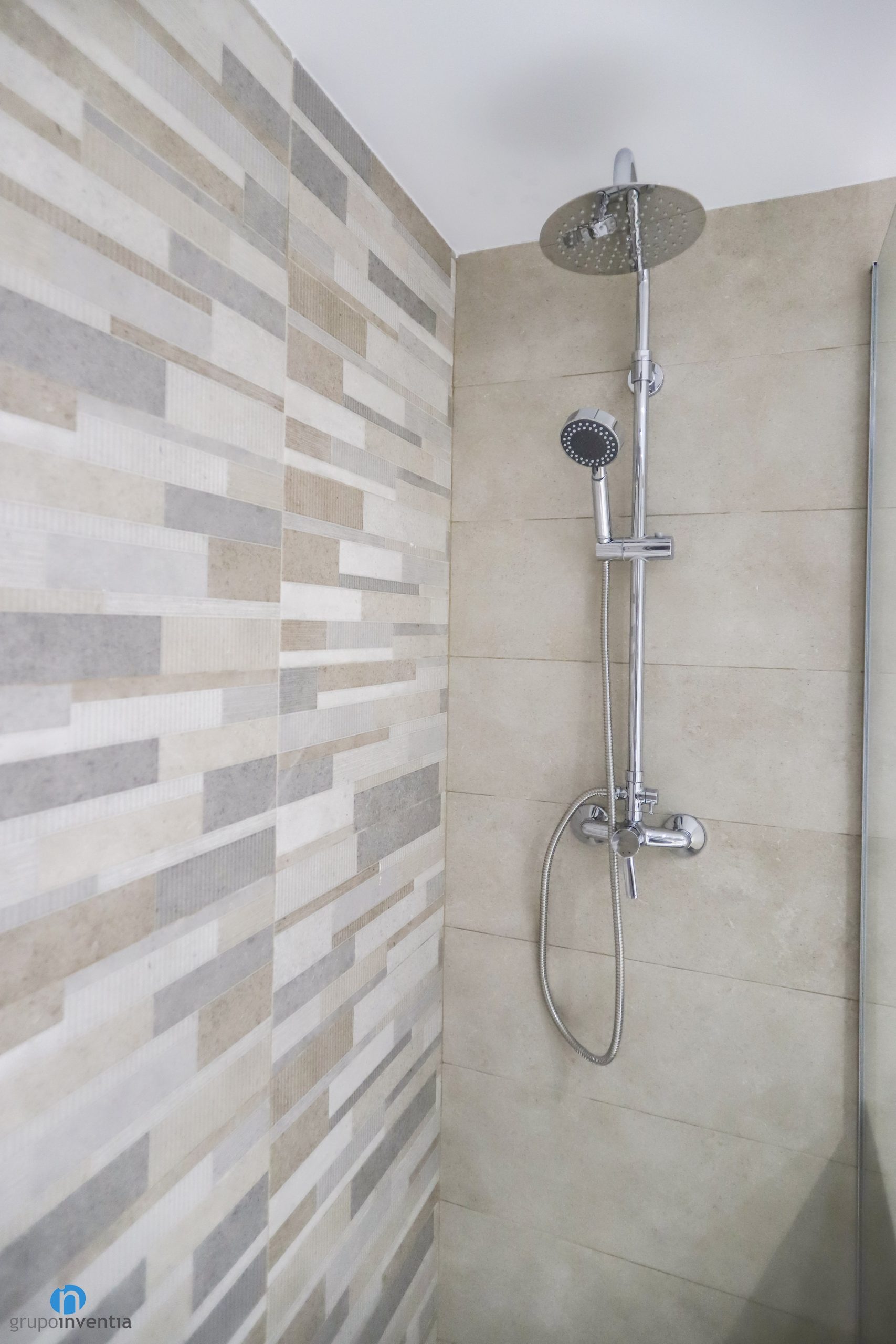 La zona d’aigües és per a un plat de dutxa arran de terra. És un espai pràctic i ampli que queda protegit per una mampara estàtica. En aquesta reforma de bany les parets s’han enrajolat amb rajoles de color beige, igual que les rajoles del paviment. Com a resultat s’ha aconseguit una cambra de bany d’imatge contemporània i d’ambient agradable.