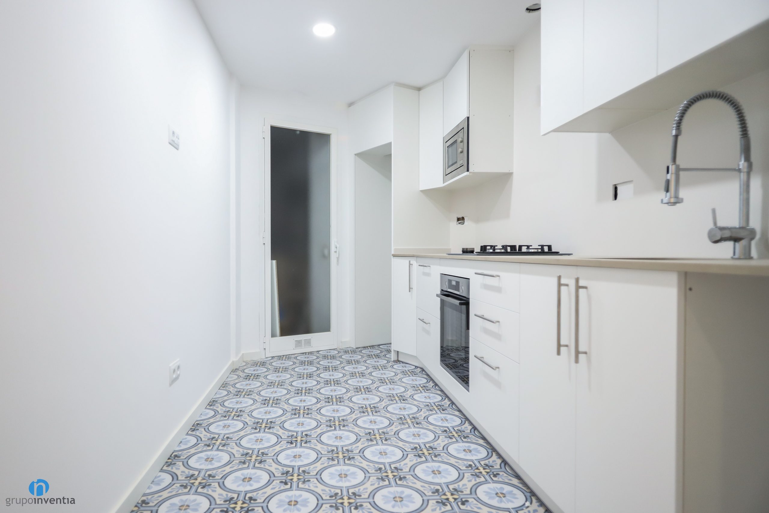 Precisament s’hi han integrat el forn i el microones respectivament. A l’extrem també s’ha disposat un espai a mida per integrar la nevera. Un altre detall que ha canviat en aquesta cuina és el paviment. S’ha escollit un terra tipus hidràulic que aporta molt de color i personalitat al conjunt de la cuina.
