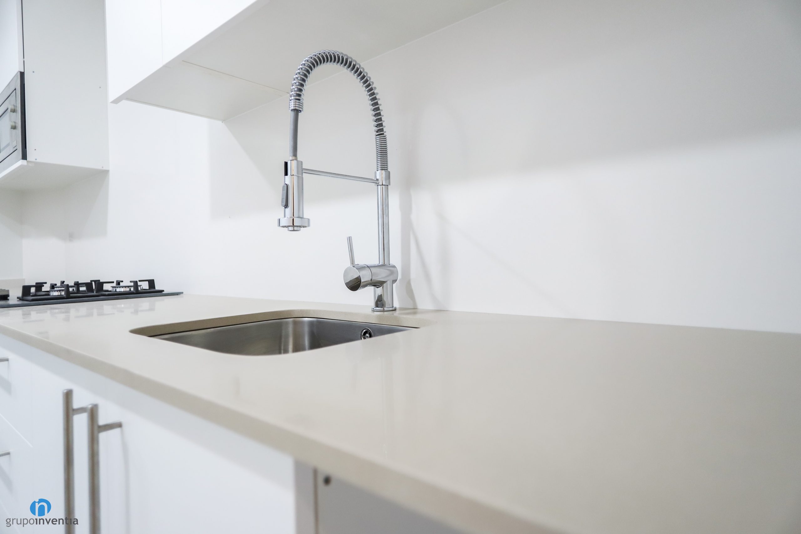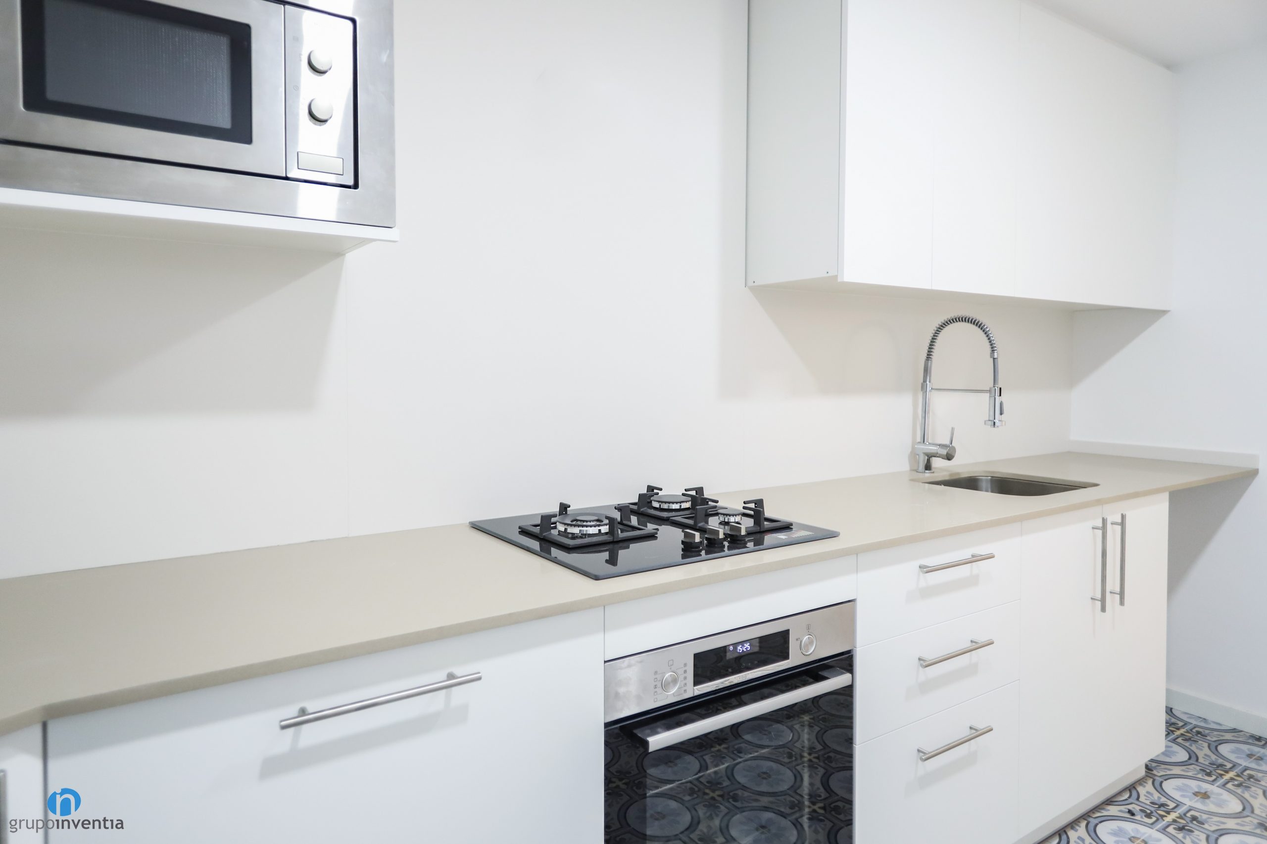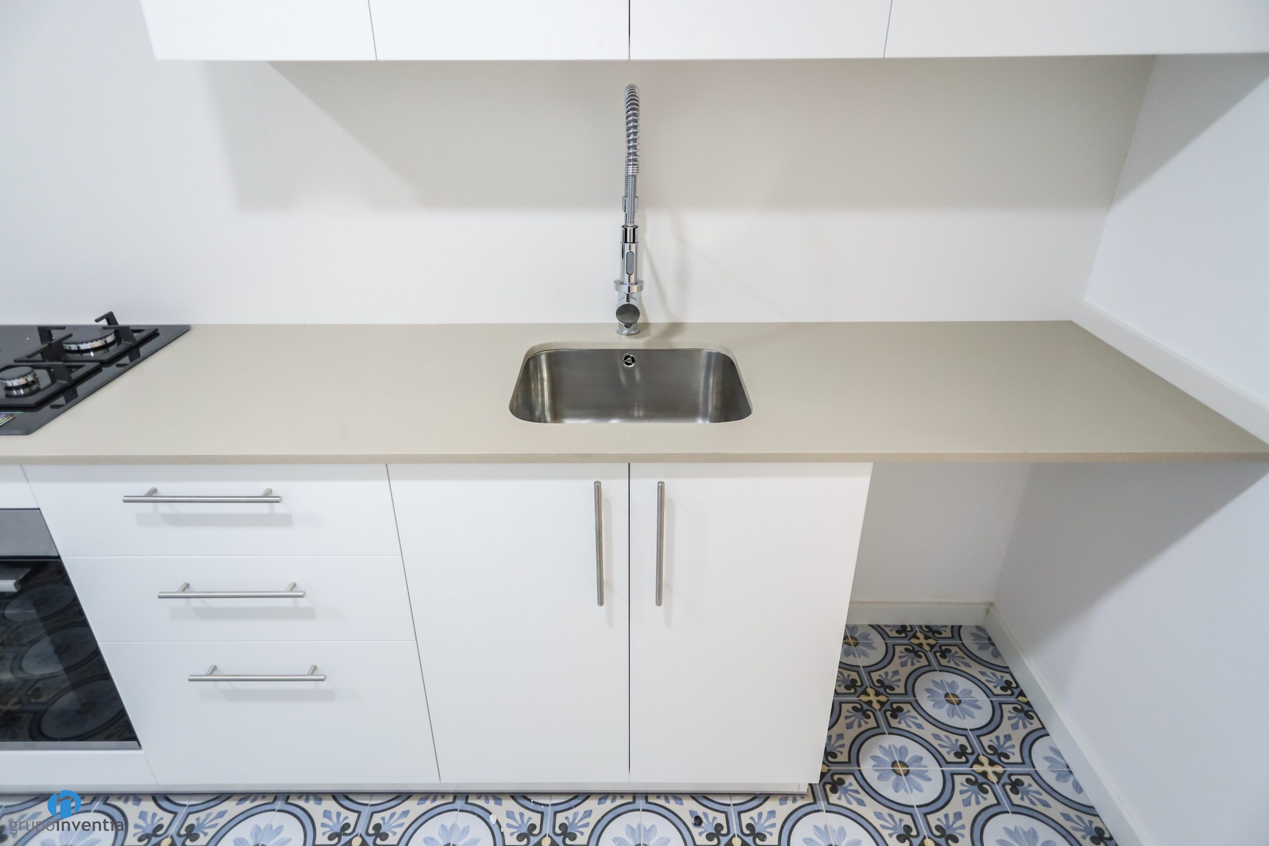 El moble de cuina és de color blanc i es troba al costat dret d’aquesta reforma de cuina. Compte amb un taulell allargat que aporta una àmplia superfície de suport i de treball. A més sobre ella també s’ha instal·lat una pica d’un si i una placa de cocció de tres fogons.