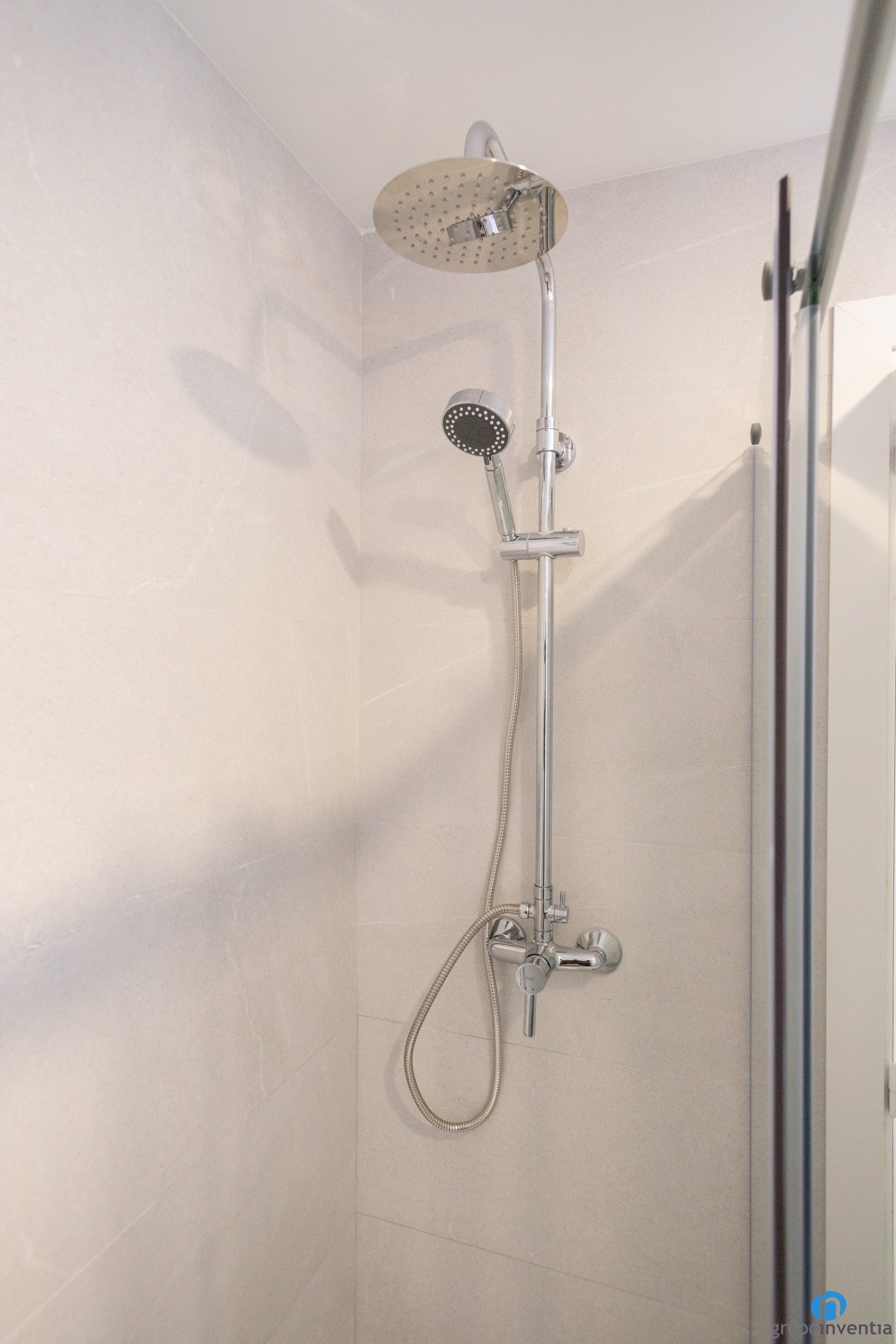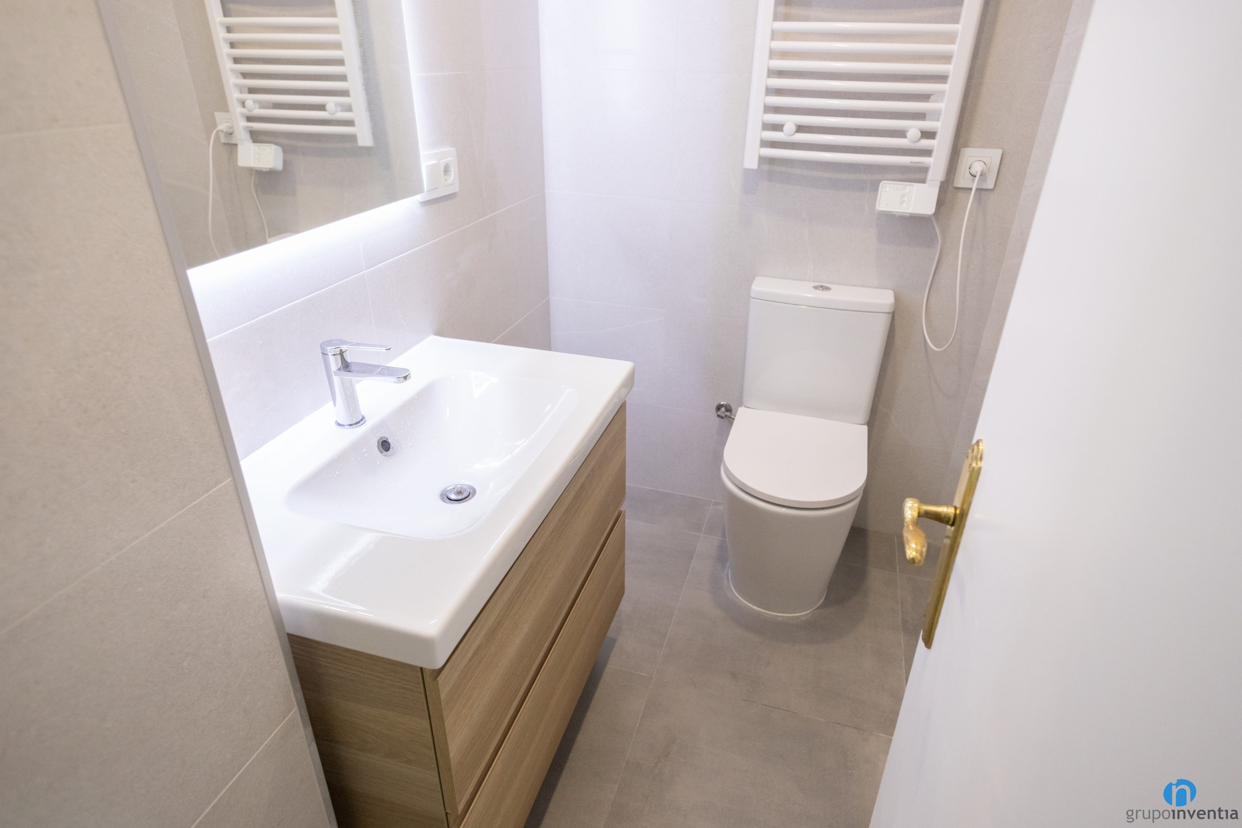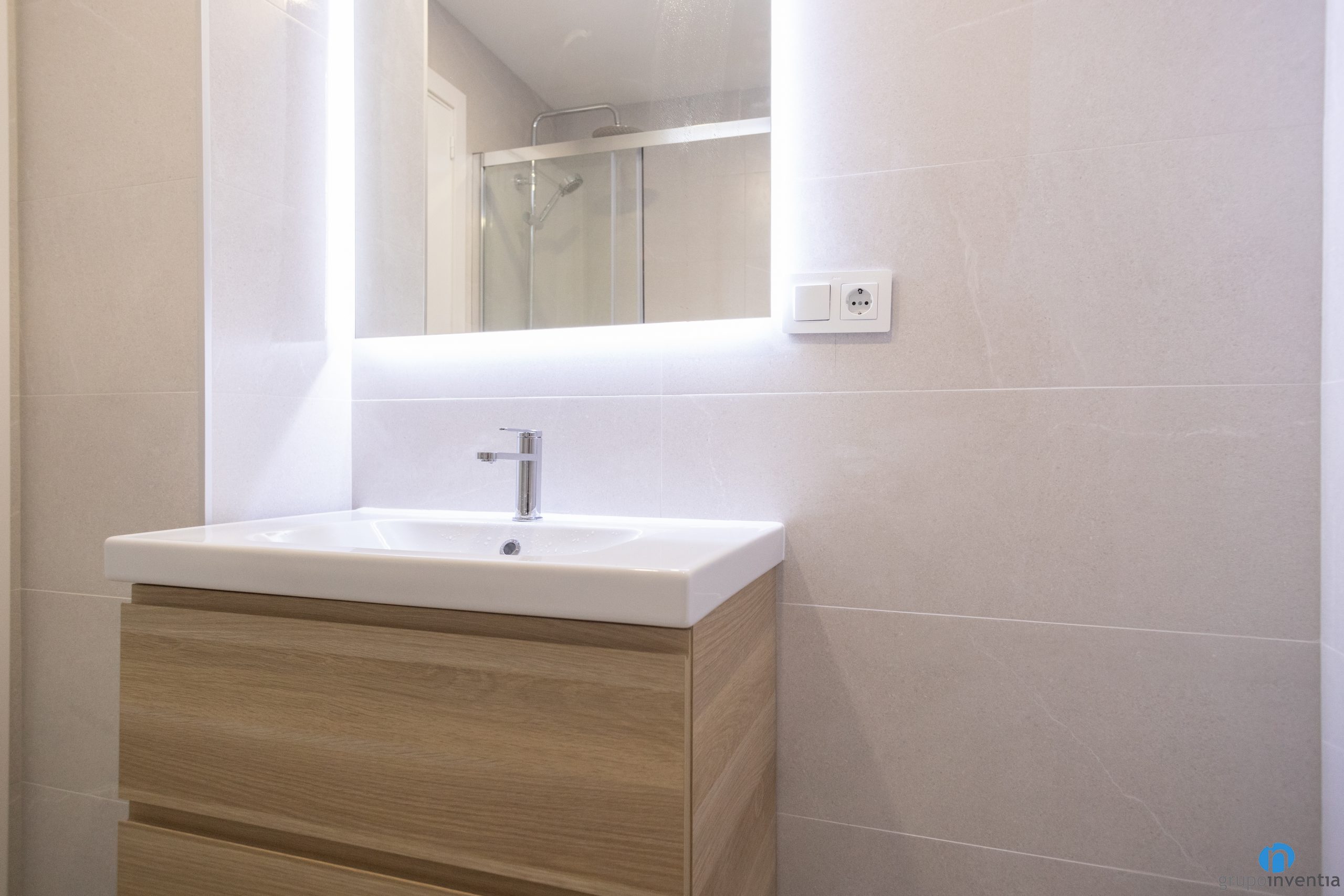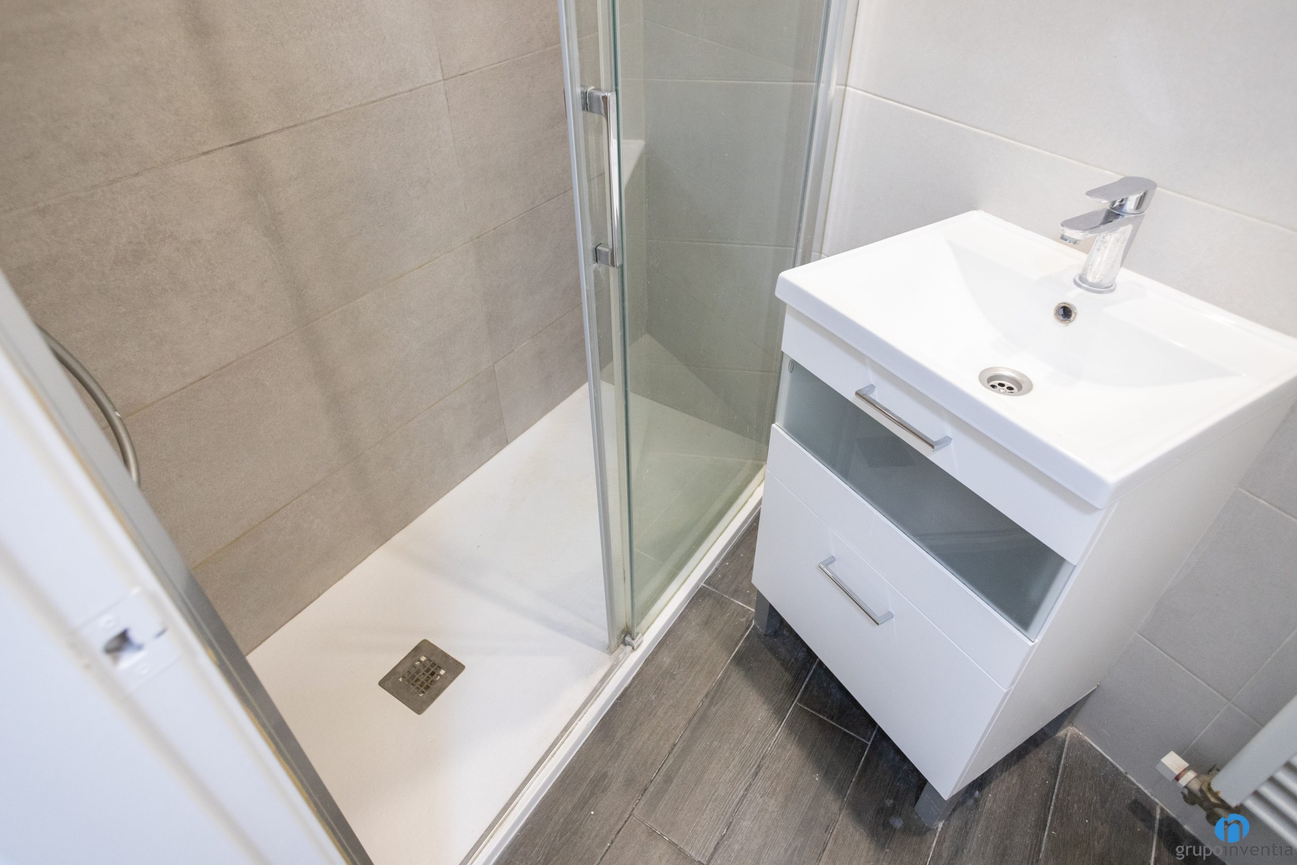 També s’ha generat un lavabo que complementa la cambra de bany principal. Es tracta d´un espai que compta amb un lavabo amb moble d´emmagatzematge i una dutxa. Per protegir-la s’han instal·lat mampares de portes corredisses transparents. També compta amb una seca tovalloles elèctric i un mirall de bany quadrat.