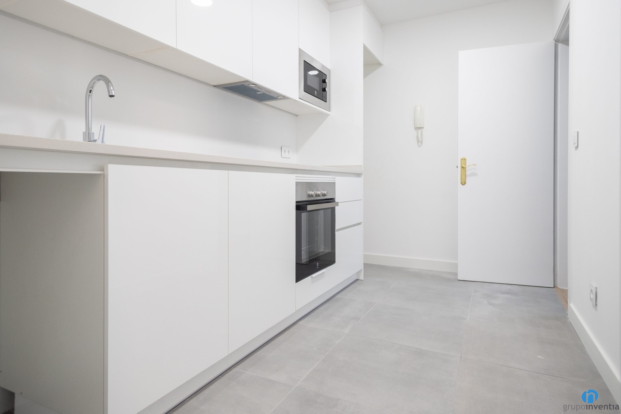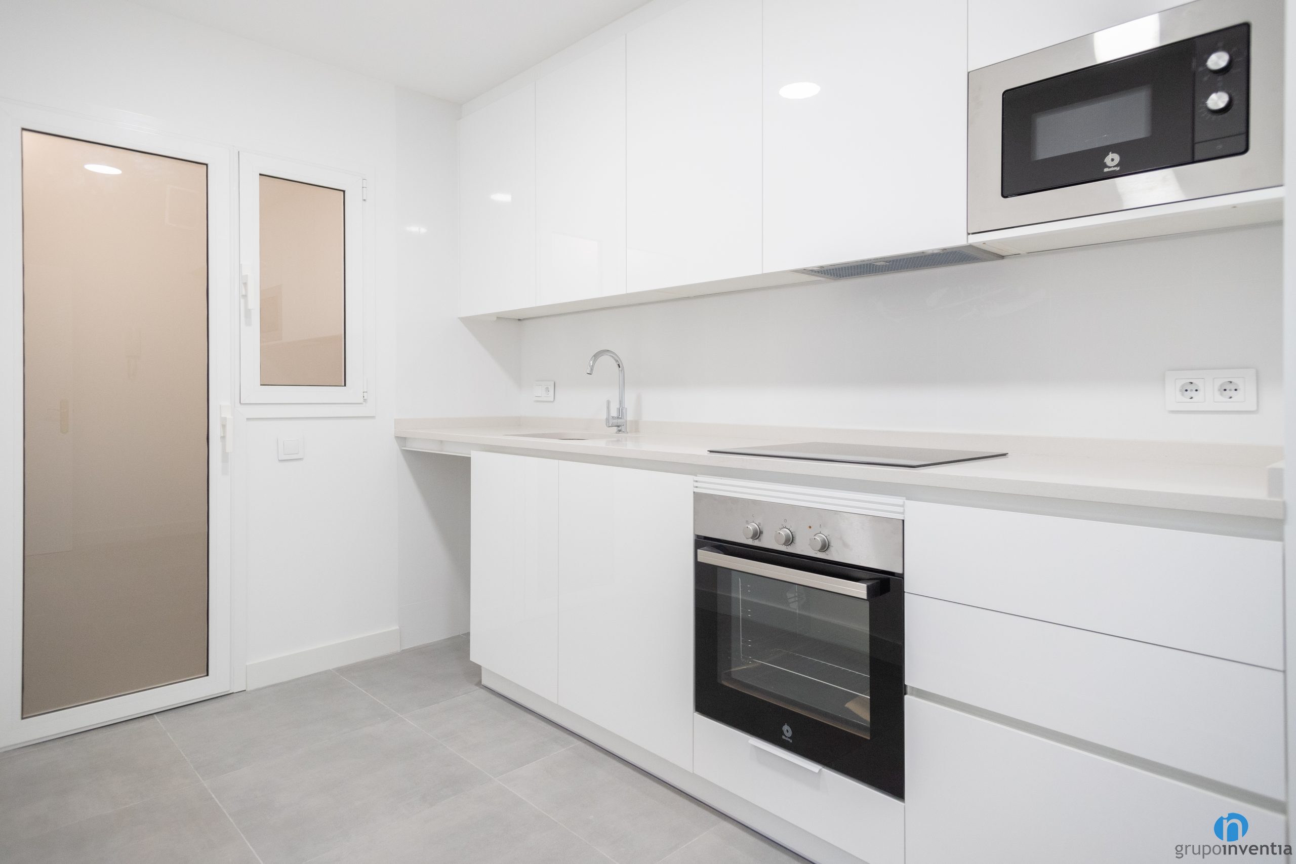 El moble de cuina és blanc i disposa de buits a mida per integrar electrodomèstics. A la part superior hi ha el microones, mentre que a la inferior hi ha espai per al forn i el rentaplats. Tot plegat molt ben integrat en una reforma de cuina que combina els colors blanc i gris.