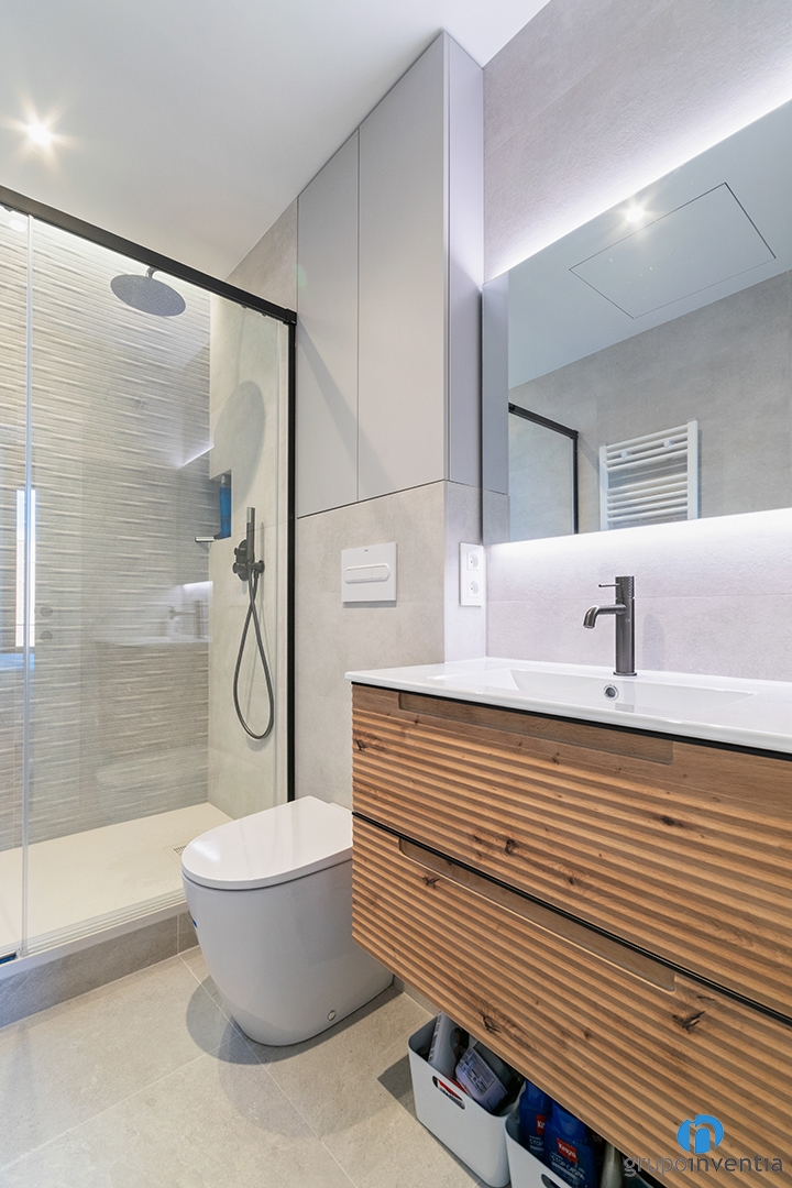 S’han fet servir rajoles to beix que generen molta lluminositat i sensació d’amplitud. Per a les parets de les dutxes hem optat per una rajola de disseny en relleu que aporta més dinamisme. Al primer hem adequat una porta corredissa i hem instal·lat un vàter flotant.